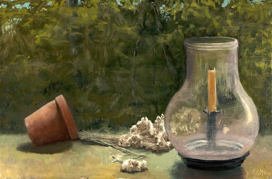 "Time-worn and well-used (mostly) objects and people populate the paintings of Anna B. McCoy. Her re-invention of a type of painting popularized by Rembrandt and the Dutch baroque—the tronie—is far more than an antiquarian enterprise in this age of “selfies.” McCoy’s paintings of friends and family recall the long tradition of such explorations of the human face from Leonardo’s late in life self-portrait drawing to Rembrandt’s self-portrait etchings throughout his life and more recently in the work of David Hockney, Andy Warhol, Cindy Sherman, and, especially, Elizabeth Peyton’s small-scale heads of friends and celebrities. McCoy’s approach, however, is uniquely her own, and Dandelion, for example, exhibits an endearing, self-deprecating humor, comparing her own tightly curled hair not just to the ubiquitous flower, bane of bourgeois suburban lawns, but to its final, fragile state of impending dissolution just one breath away.