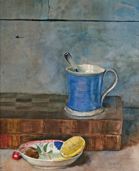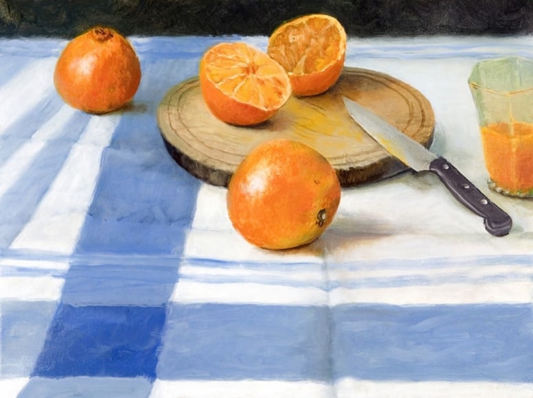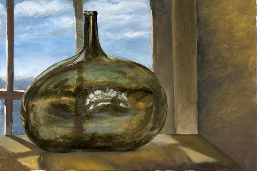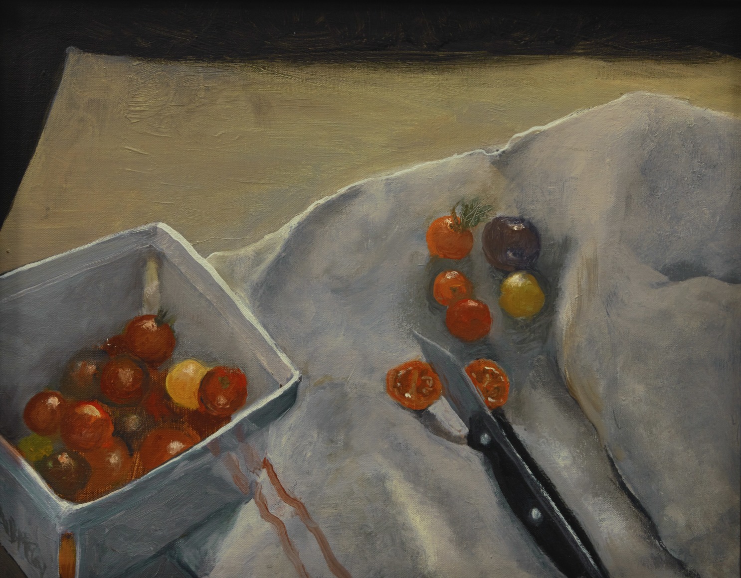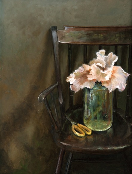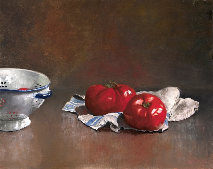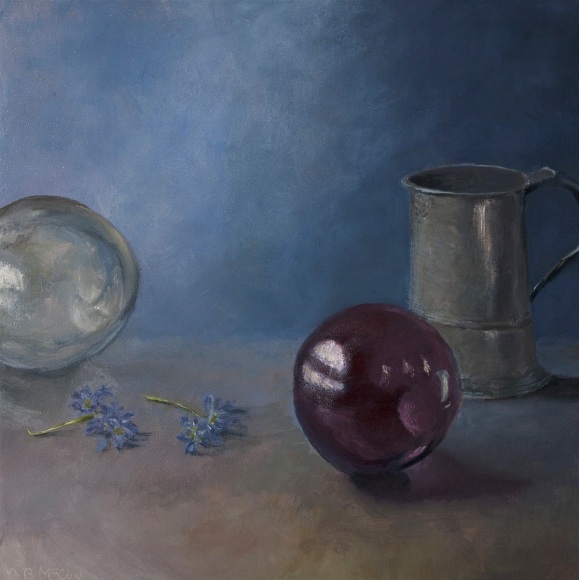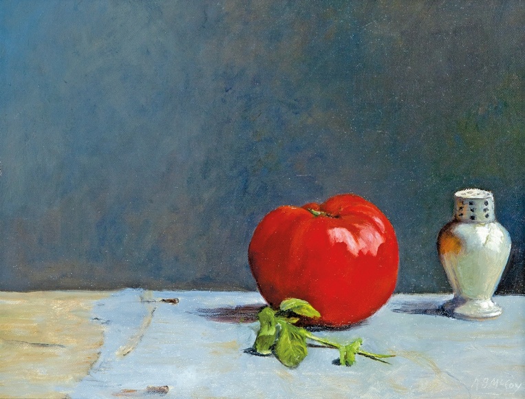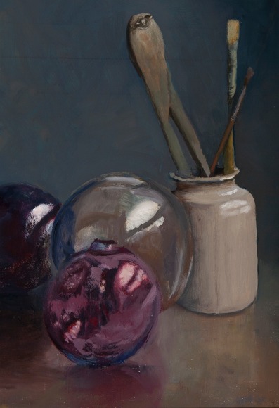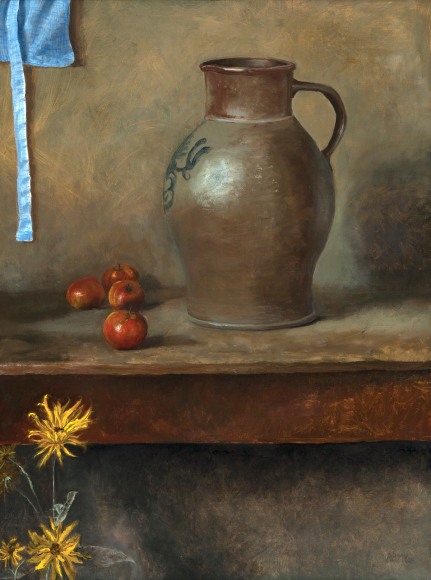 McCoy paints what she sees–family, friends and familiar objects. Both faces and still life carry intimations of time passing. And still life, as conceived by McCoy conveys distinct personas, often becoming portraits in absentia, and tronie-like in their personalities and specificity. Her still life paintings, like the tronies, are unusually simple and uncluttered; disparate flowers, fruit, vegetables, plates, utensils, glassware and other common objects are placed on tables, shelves or other furniture, usually in shallow, often indeterminate, background spaces. While the suggestion of casualness and informality prevails, it becomes apparent that McCoy’s interest lies in the subtle, almost imperceptible tensions evoked by the space between objects enhanced by unexpectedly rich colors bouncing off each other in the reflections of a glass, plate or polished metal. Edges tend to be softly modeled, light shimmers in dark recesses; brush strokes caress objects with an ineffable gentleness, quiet and reticence.