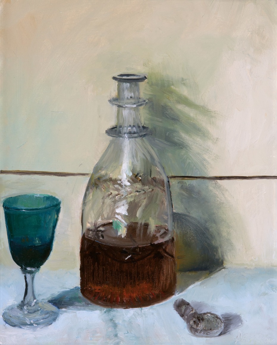 That said, both the tronies and still life paintings have intense, activated and highly worked surfaces. We are aware always of her unusual, flickering brushwork that enlivens every form, different from but acknowledging such nineteenth century American precursors including Raphael Peale, Frederick Peto, and William Michael Harnett. Every mark is just as present as the object it describes, maybe more so. In Cuban Cigar, a wisp of smoke from the lit cigar not only implies proximity to an absent but nearby smoker; it conveys a sensory world of simple pleasures—brandy, brie, human indulgence–in which even the air is tangibly “there” in the form of curling smoke deftly rendered through a brush lightly dragged, a finishing gesture to ignite the spatial relationships among objects. It is these inflected, complex, sincere, honest, painterly surfaces that convey McCoy’s own intensity and irrepressible spirit, her devotion to what she sees and knows well and intimately; analogues to life and being adamantly alive in the present.