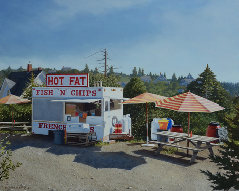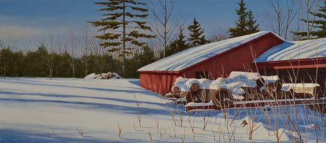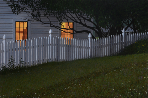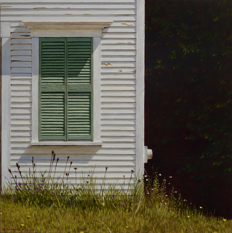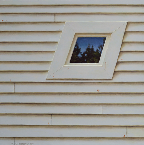 David Vickery makes carefully composed, exquisitely crafted paintings that arrest the eye, that draw our attention to the particular within the everyday—a bit of sky and dark evergreens reflected in an oblique window, a network of leafless trees casting their shadows against white clapboards, the warm glow of a lit interior framed within the crisp geometry of a grey house—the transitory nature of light and places where the natural and manufactured connect. His subjects are primarily drawn from his immediate environment, the landscape, and local villages near his studio in Cushing, Maine, and from his annual trips to Monhegan Island. The images are built up slowly in several thin layers of oil and varnish, a deliberate, contemplative process that lends a meditative quality to the finished, highly detailed paintings.