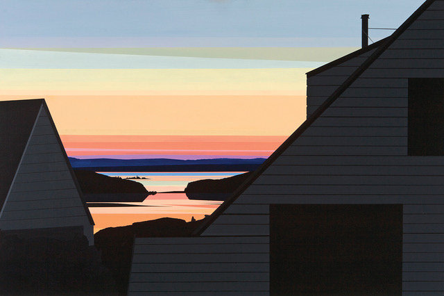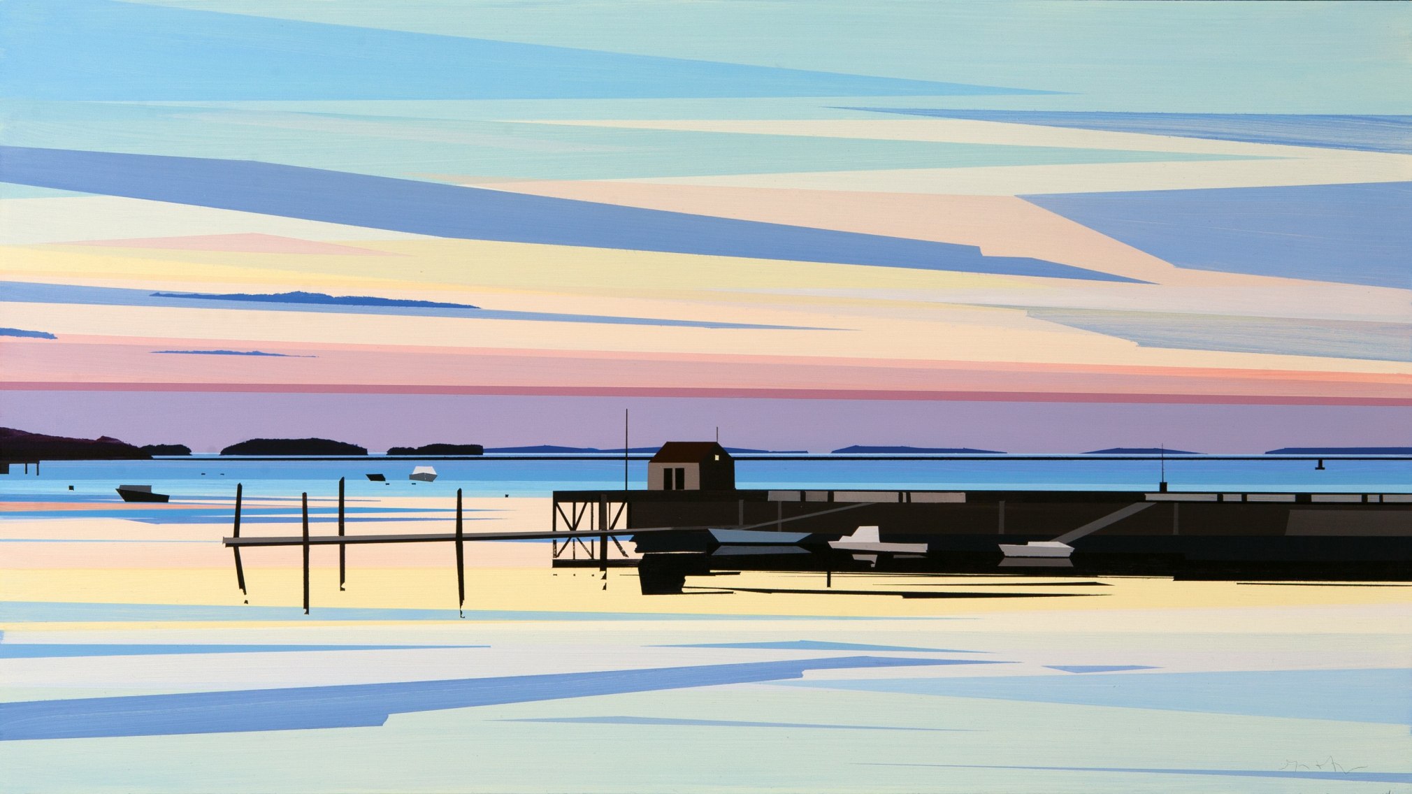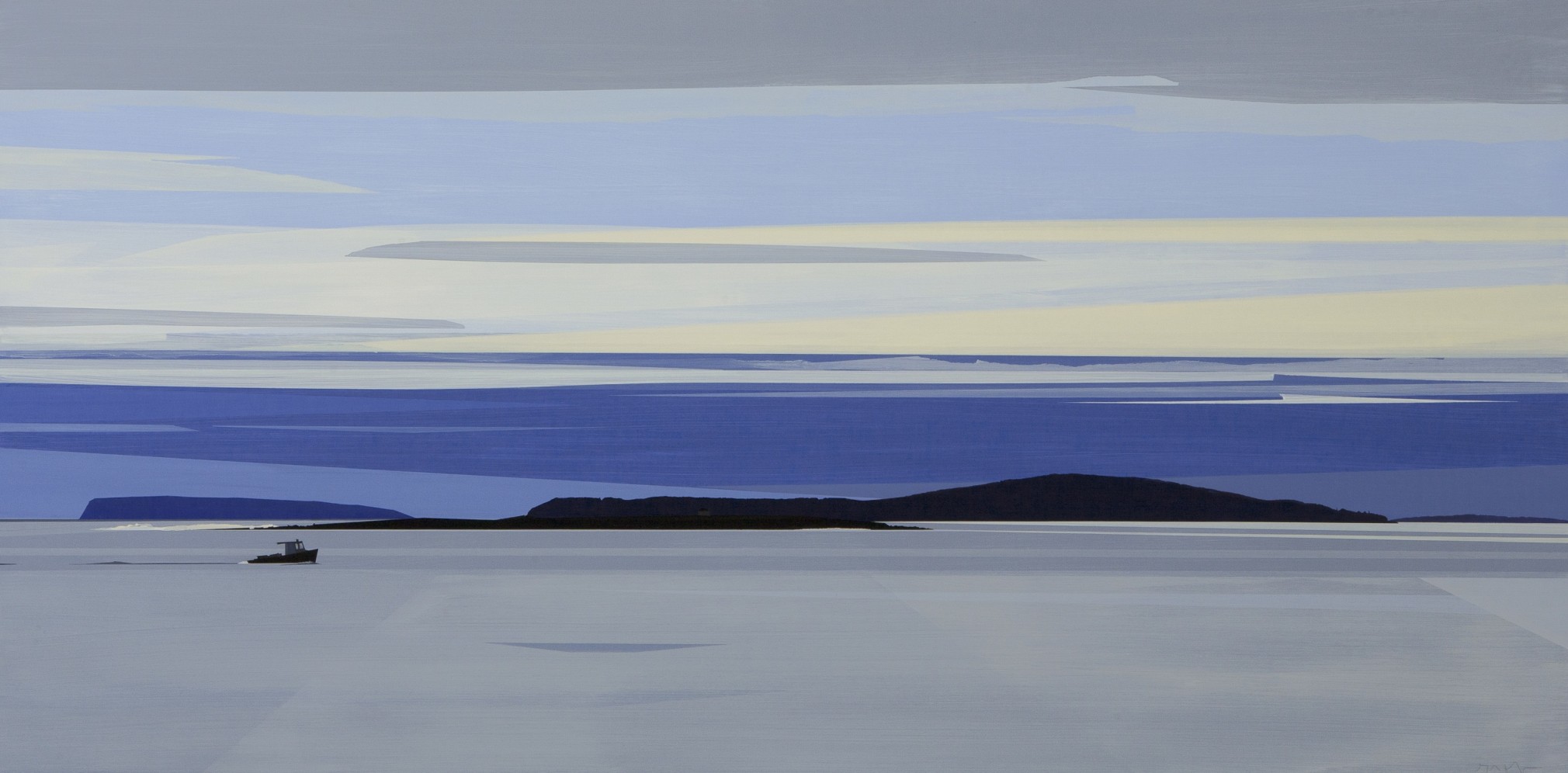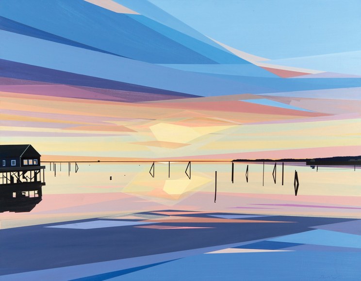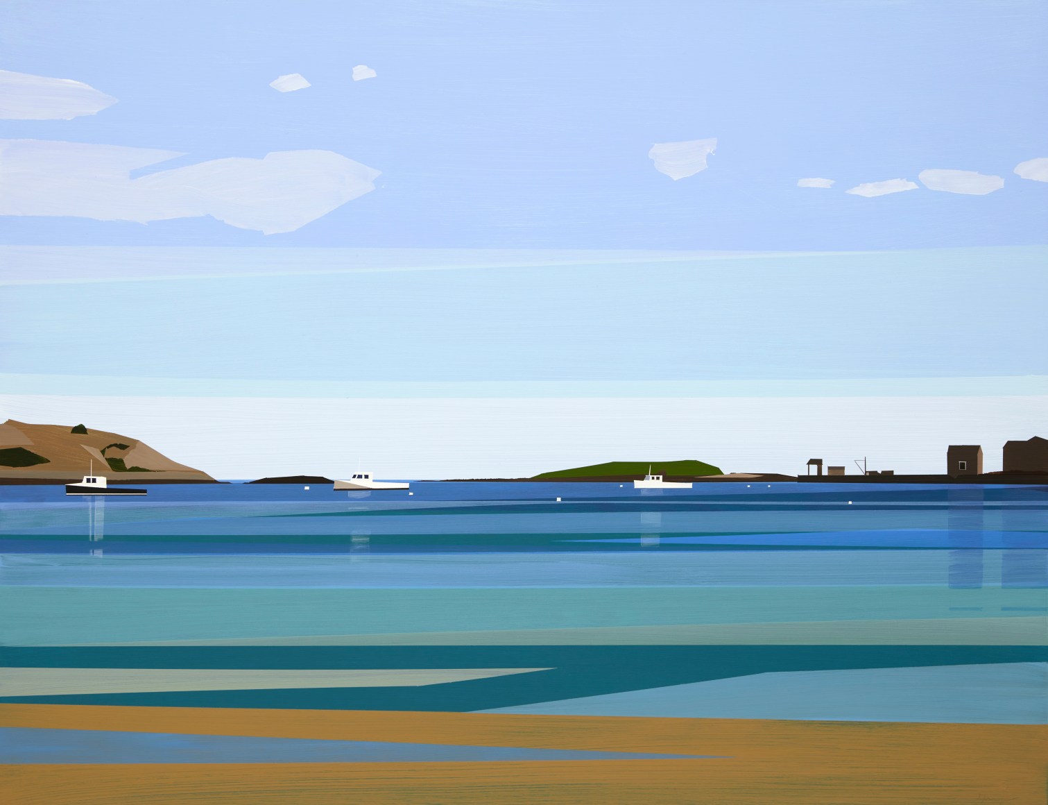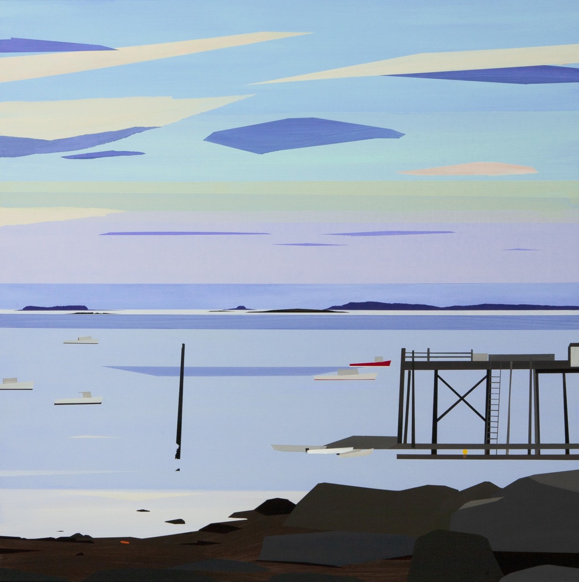 When confronted with the beauty of Maine’s coast, most painters, whether working plein-air or in the studio, respond with loaded brushes and an impressionistic style that well captures atmospheric conditions and light reflections. Not so Greta Van Campen. The young midcoast native has developed a style of her own that is all flat, angular planes and smoothly applied paint. At least at first glance.