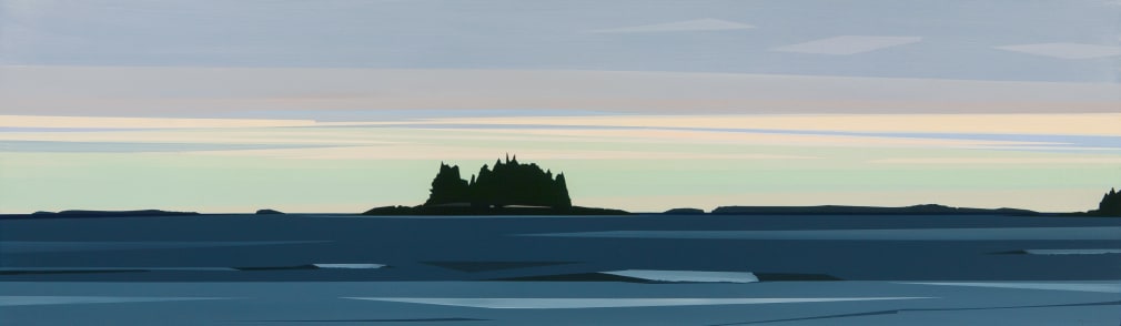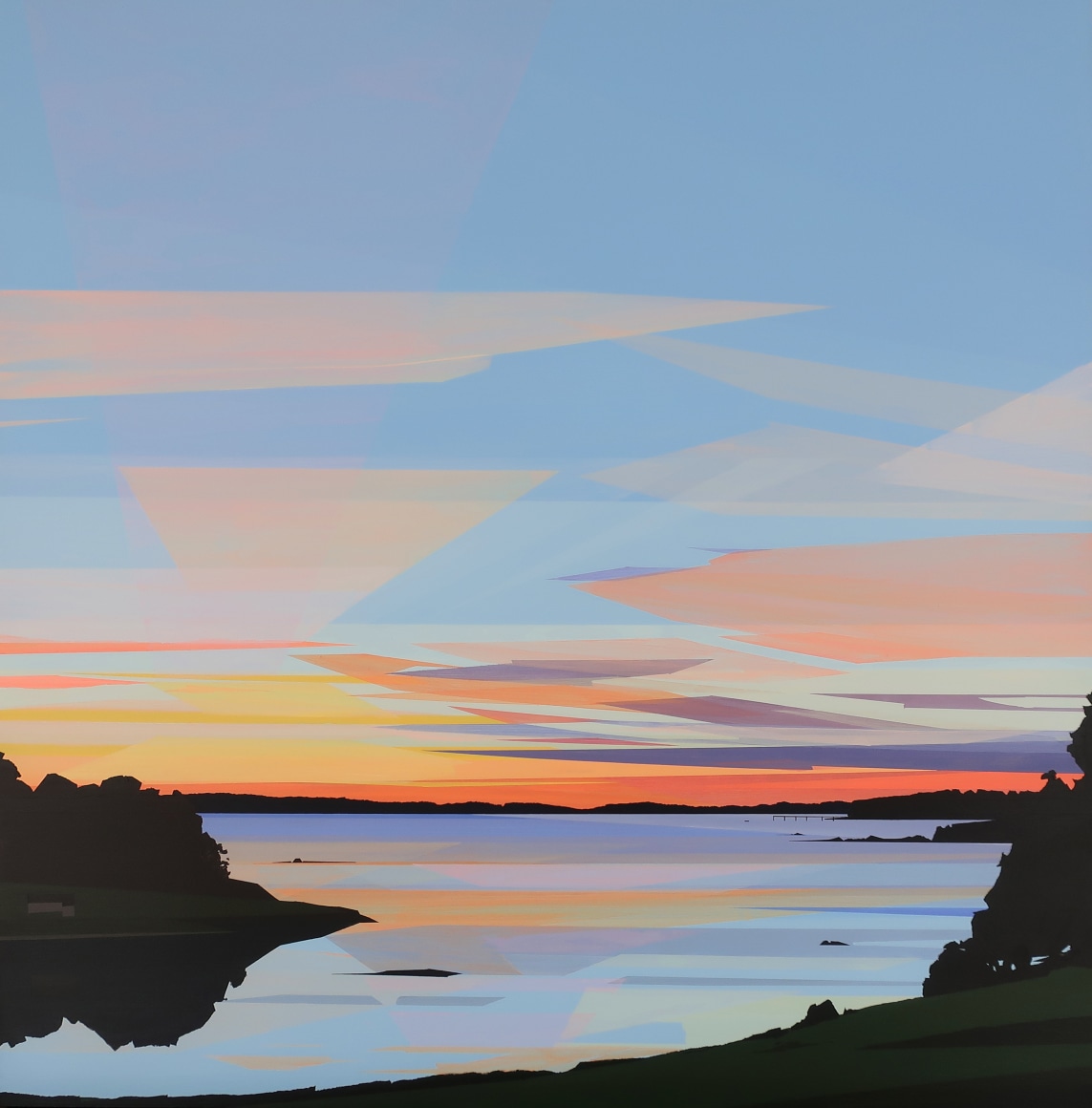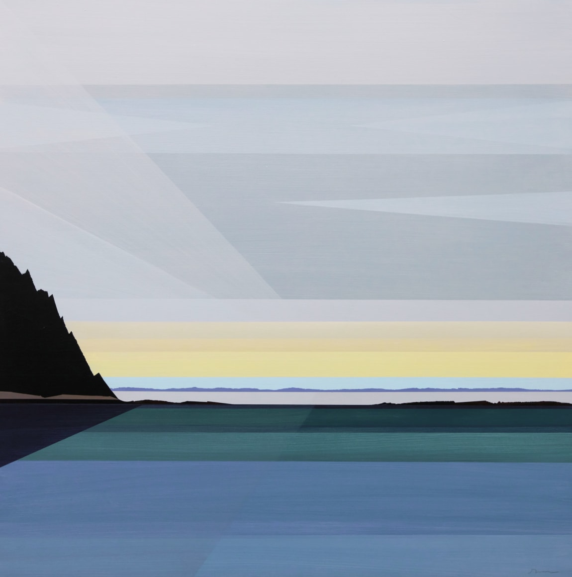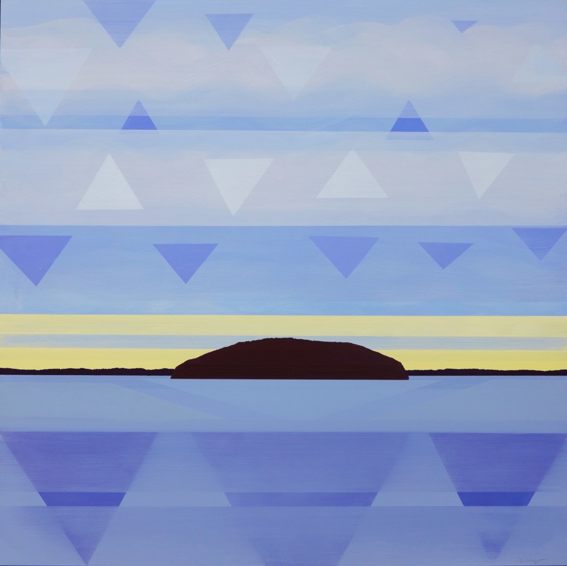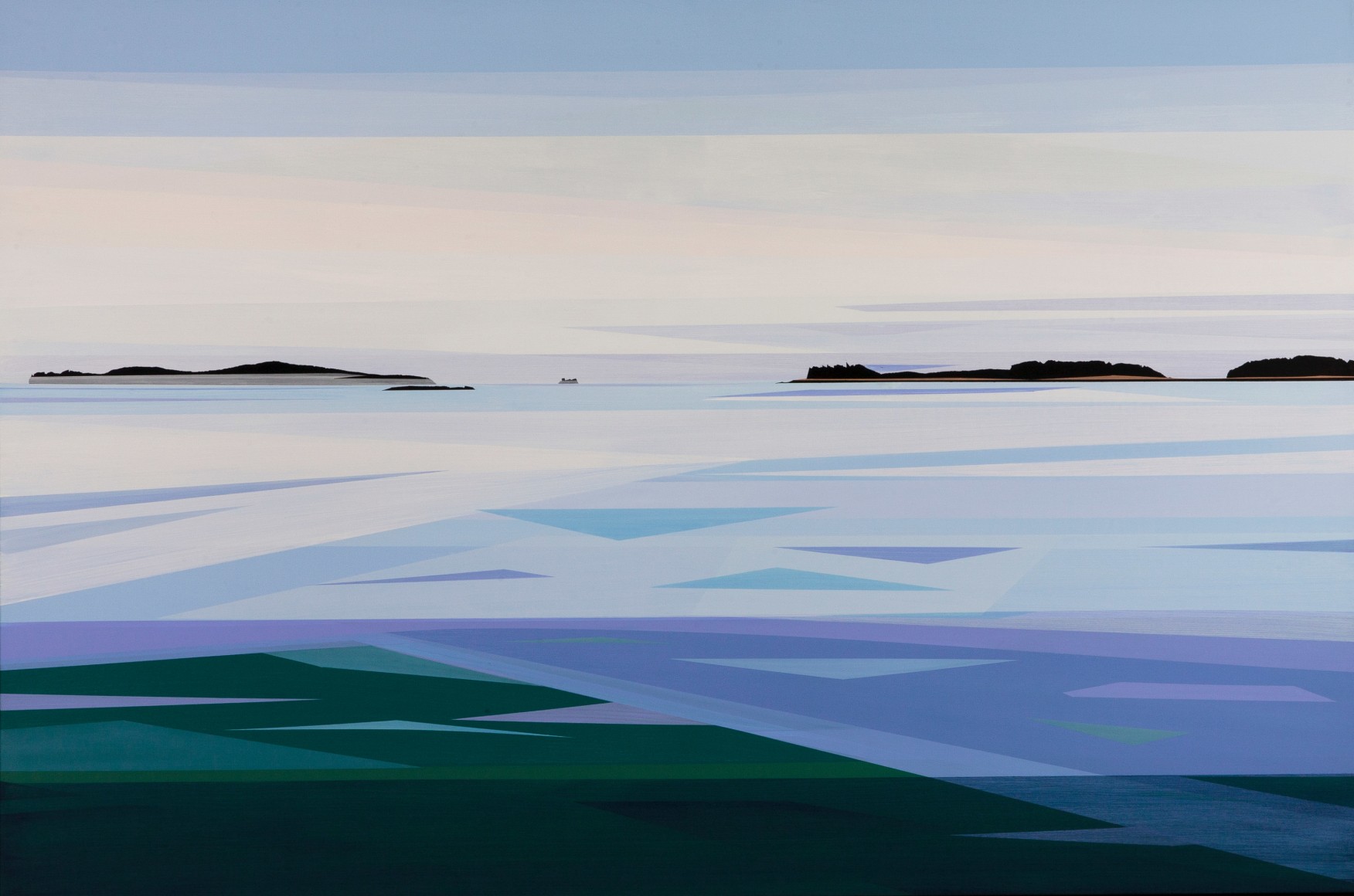 Greta Van Campen distills the world around her into prismatic, clean-edged images that visually thrum with clear notes of color. Reducing still life and landscape elements to essential forms, she pictures nature and domesticity as ordered arrangements of flat, abstracted shapes. Ocean and sky radiate from the horizon as swathes of fractured color or raking triangles of light. Islands, mountains, and trees appear as silhouettes, anchoring the expanse of land and sea. Growing up in an artistic household, her parents are artists Tim and Susan Van Campen, and now the mother of two small daughters with her partner Mike, Van Campen has recently been "thinking about 'home' and what that means to me." Several new interior scenes—spare, elegant still lifes inspired by her parent's home—are tone poems to treasured objects. "My life and my work are closely connected," she says. "There's no real separation for me, so in a sense, I paint what I live."