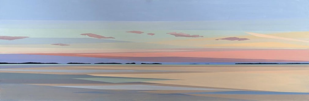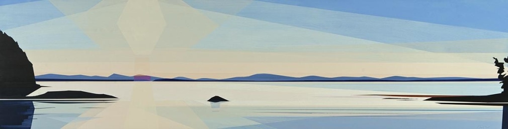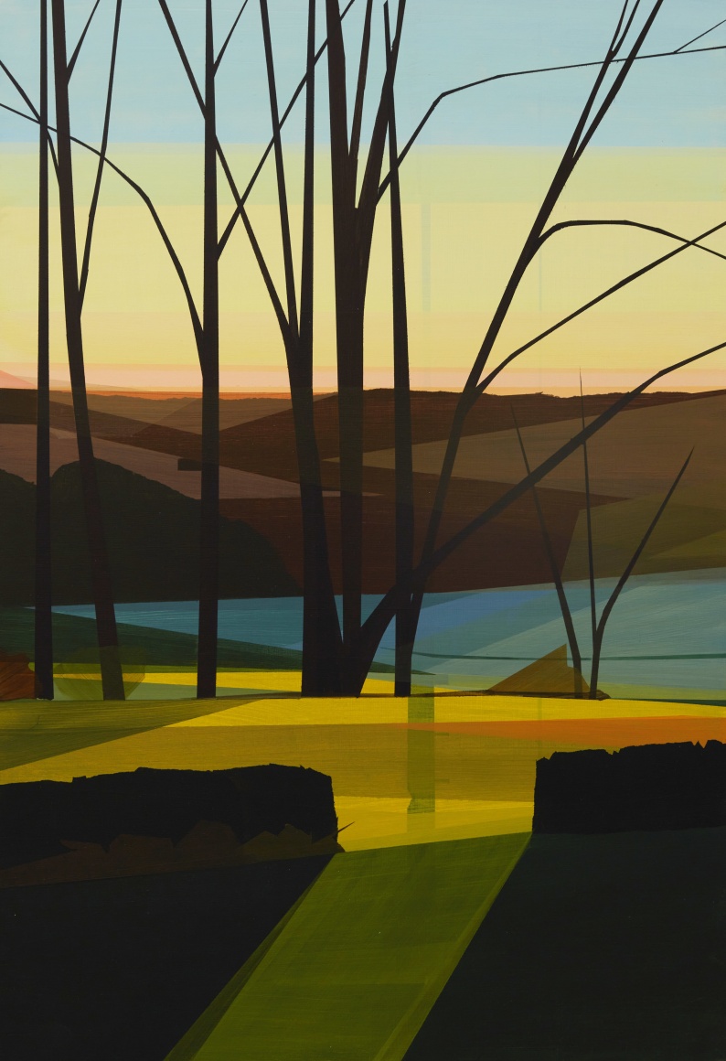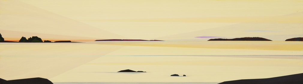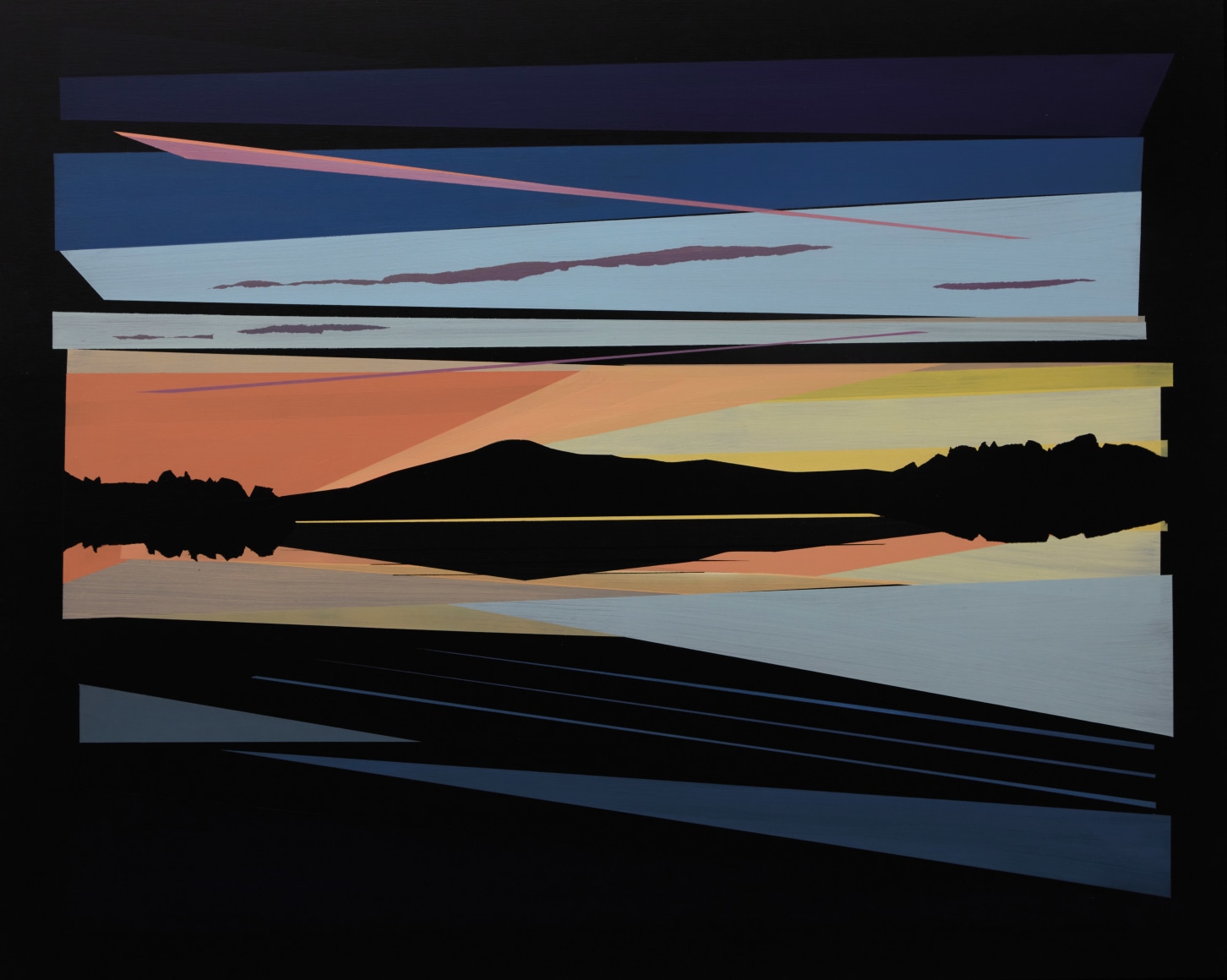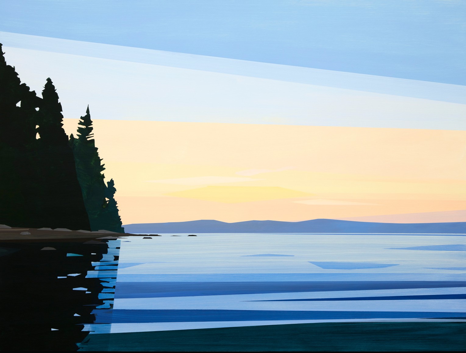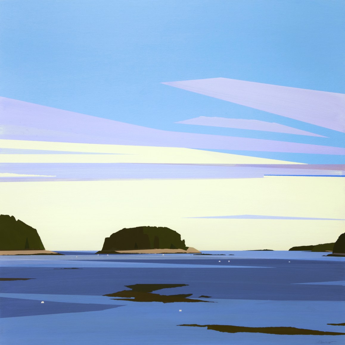 Greta Van Campen distills the world around her into prismatic, clean-edged images that visually thrum with clear notes of color. Reducing still life and landscape elements to essential forms, she pictures nature and domesticity as ordered arrangements of flat, abstracted shapes. Ocean and sky radiate from the horizon as swathes of fractured color or raking triangles of light. Islands, mountains, and trees appear as silhouettes, anchoring the expanse of land and sea. Growing up in an artistic household, her parents are artists Tim and Susan Van Campen, and now the mother of two small daughters with her partner Mike, Van Campen has recently been "thinking about 'home' and what that means to me." Several new interior scenes—spare, elegant still lifes inspired by her parent's home—are tone poems to treasured objects. "My life and my work are closely connected," she says. "There's no real separation for me, so in a sense, I paint what I live."