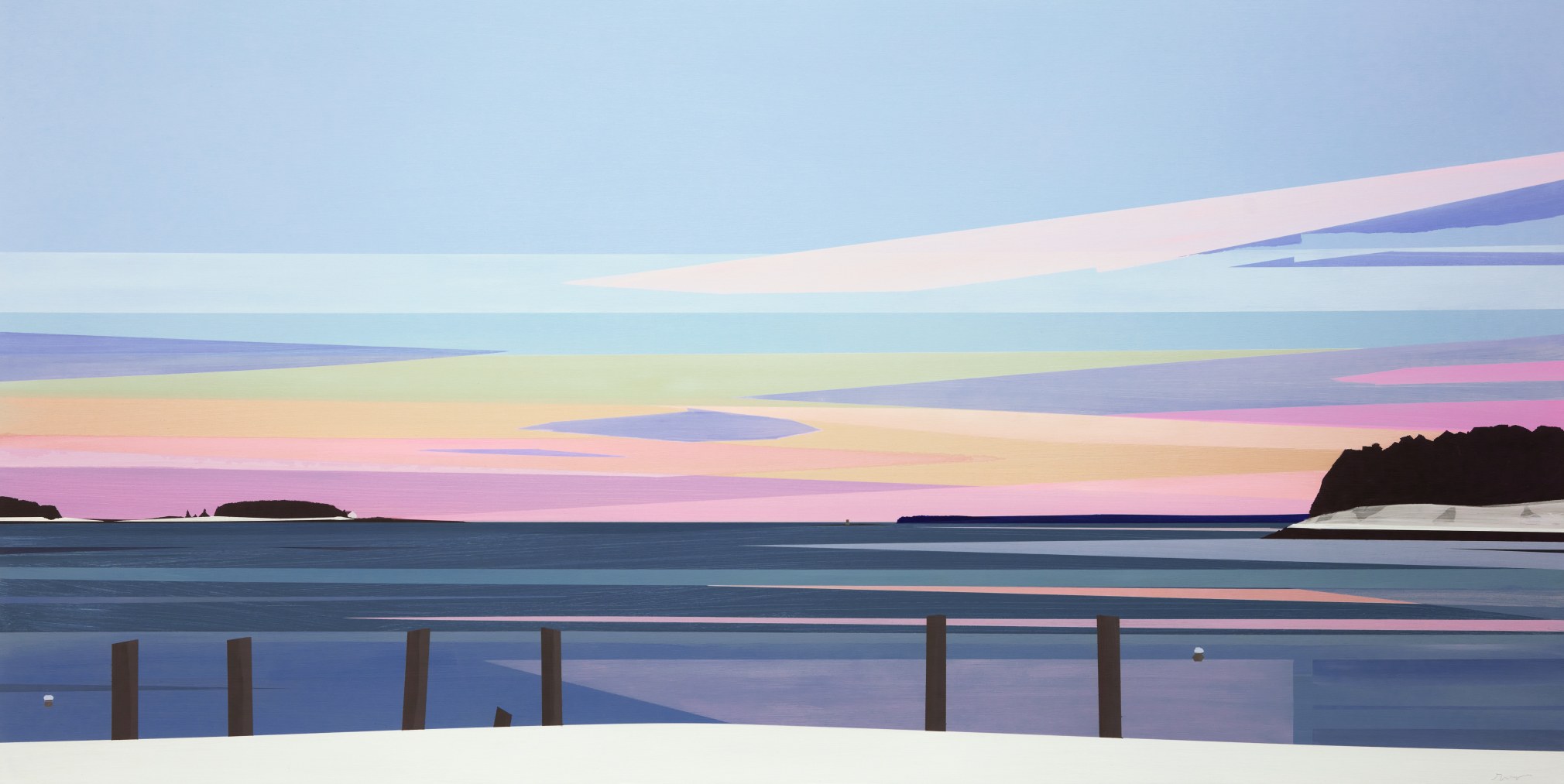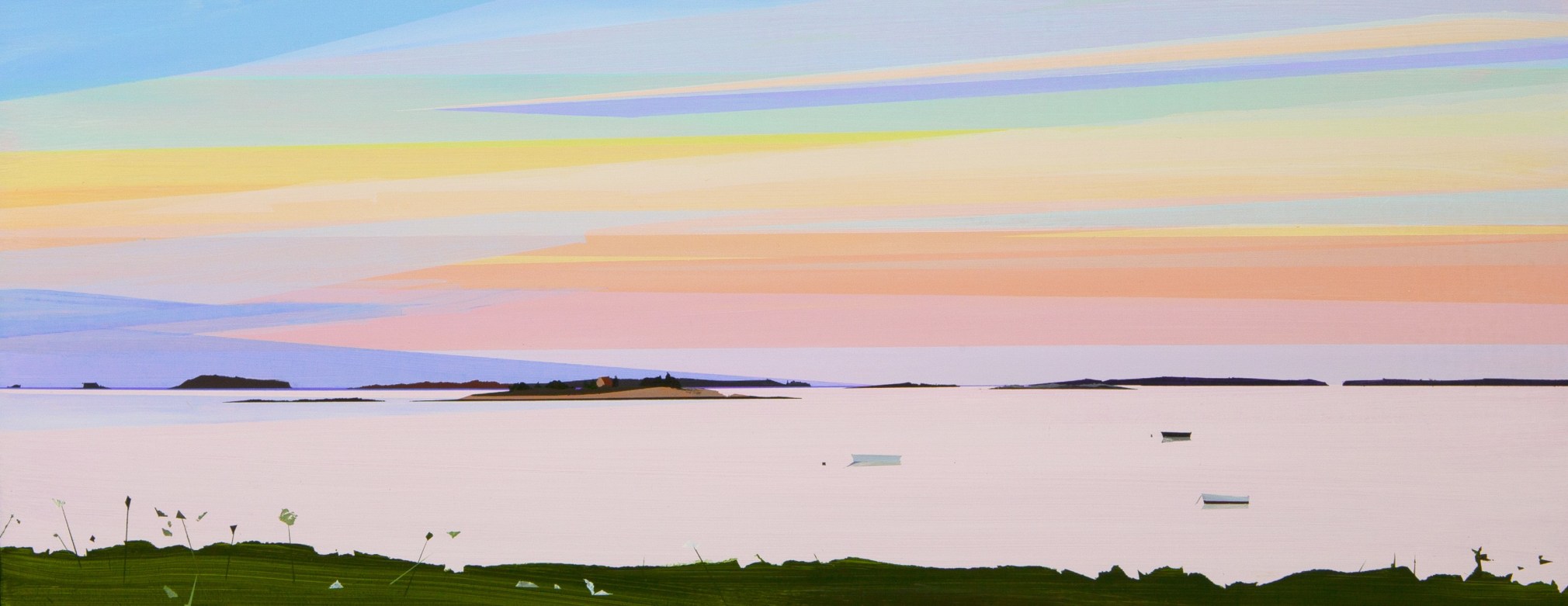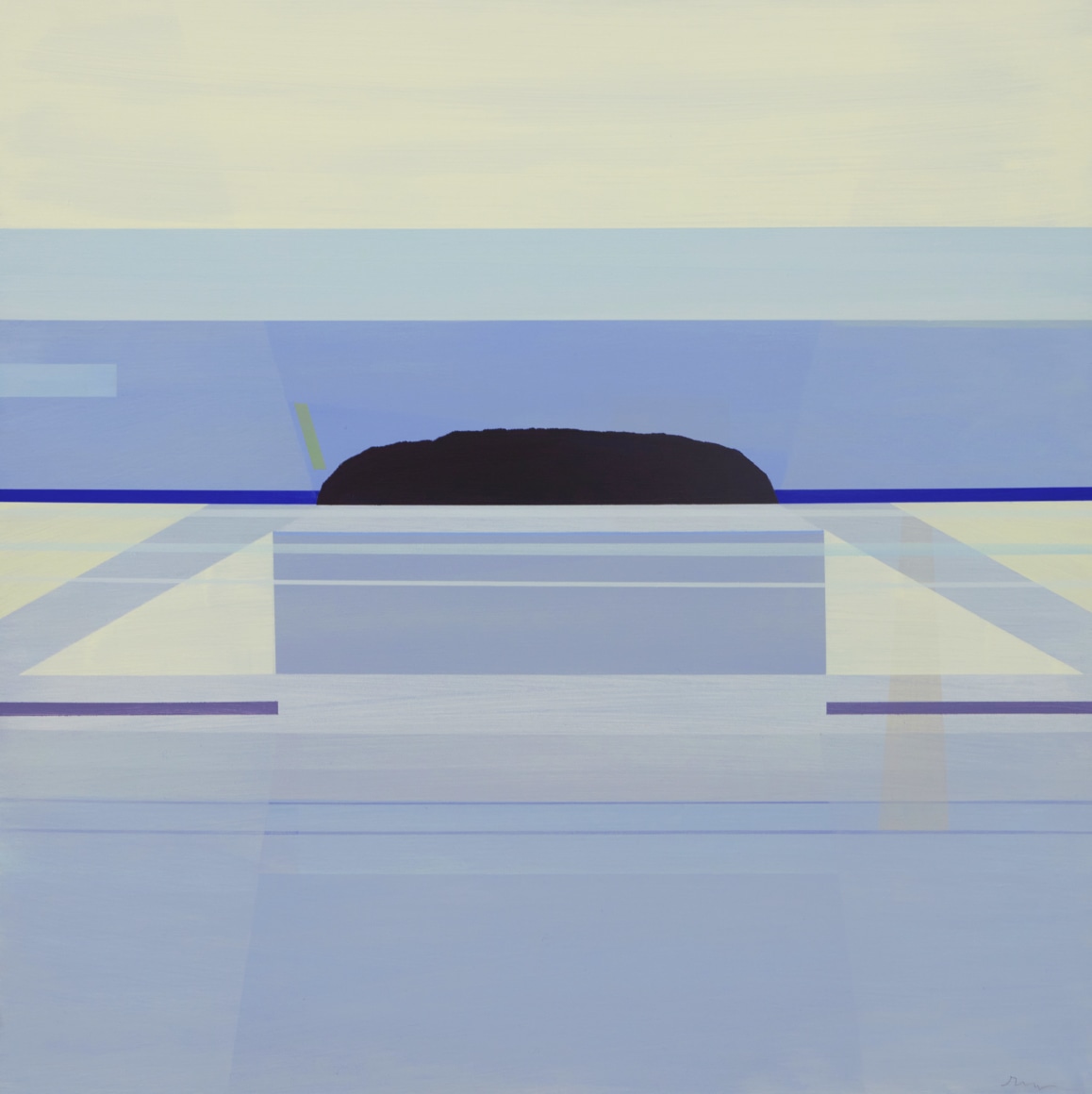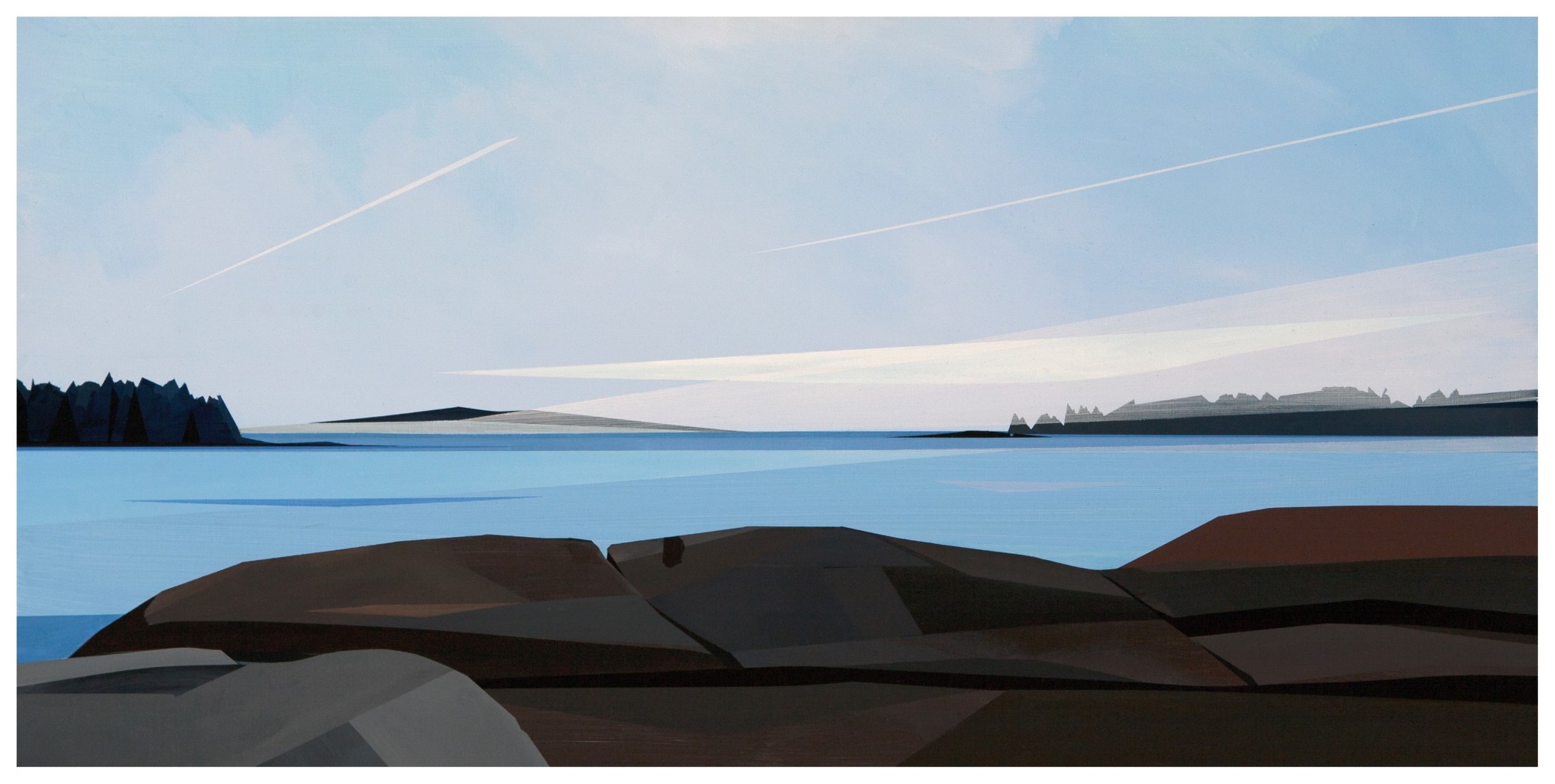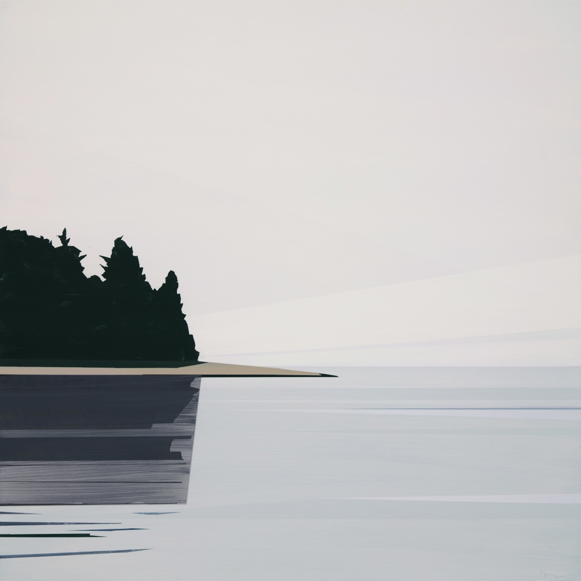 Greta Van Campen distills the world around her into prismatic, clean-edged images that visually thrum with clear notes of color. Reducing still life and landscape elements to essential forms, she pictures nature and domesticity as ordered arrangements of flat, abstracted shapes. Ocean and sky radiate from the horizon as swathes of fractured color or raking triangles of light. Islands, mountains, and trees appear as silhouettes, anchoring the expanse of land and sea. Growing up in an artistic household, her parents are artists Tim and Susan Van Campen, and now the mother of two small daughters with her partner Mike, Van Campen has recently been "thinking about 'home' and what that means to me." Several new interior scenes—spare, elegant still lifes inspired by her parent's home—are tone poems to treasured objects. "My life and my work are closely connected," she says. "There's no real separation for me, so in a sense, I paint what I live."