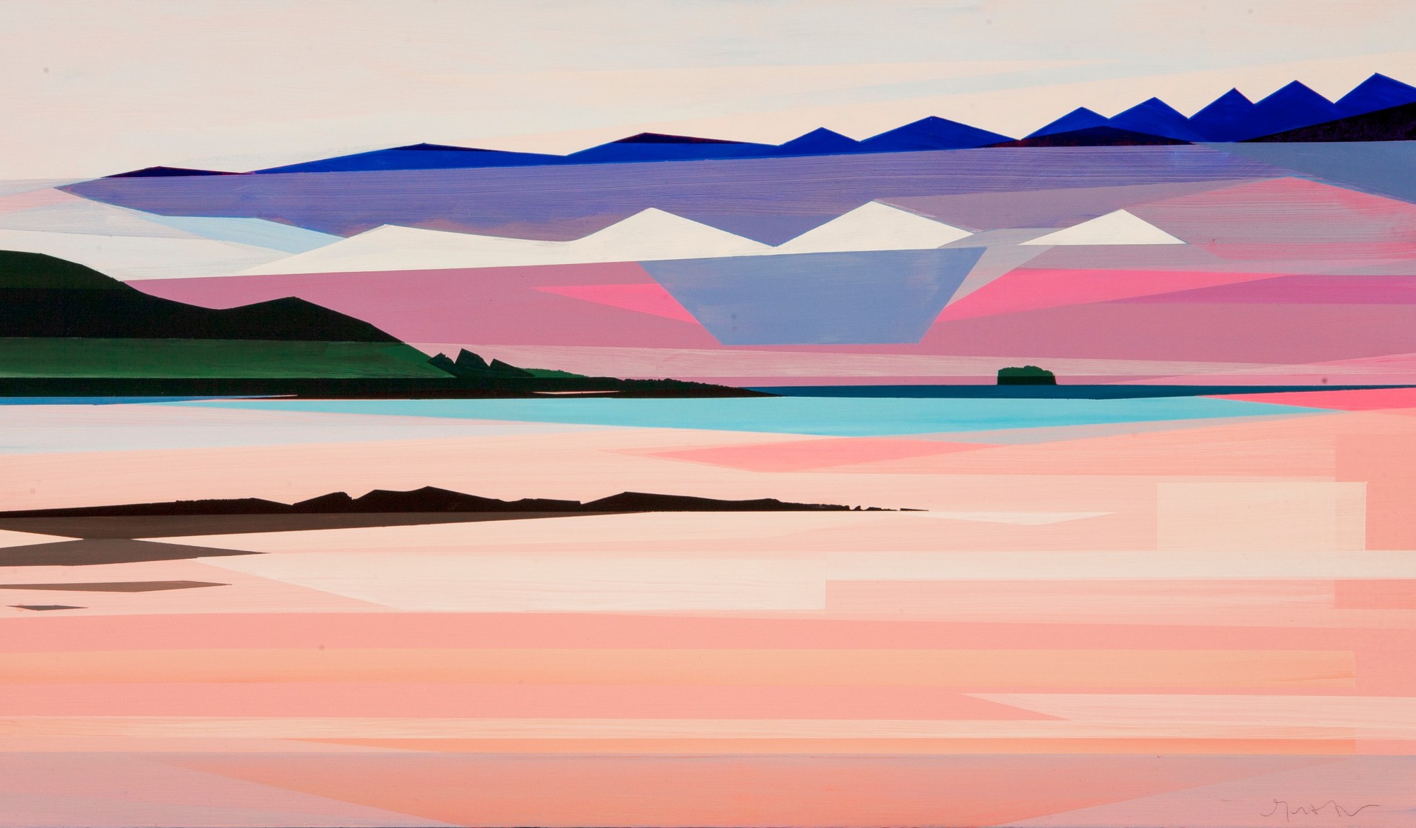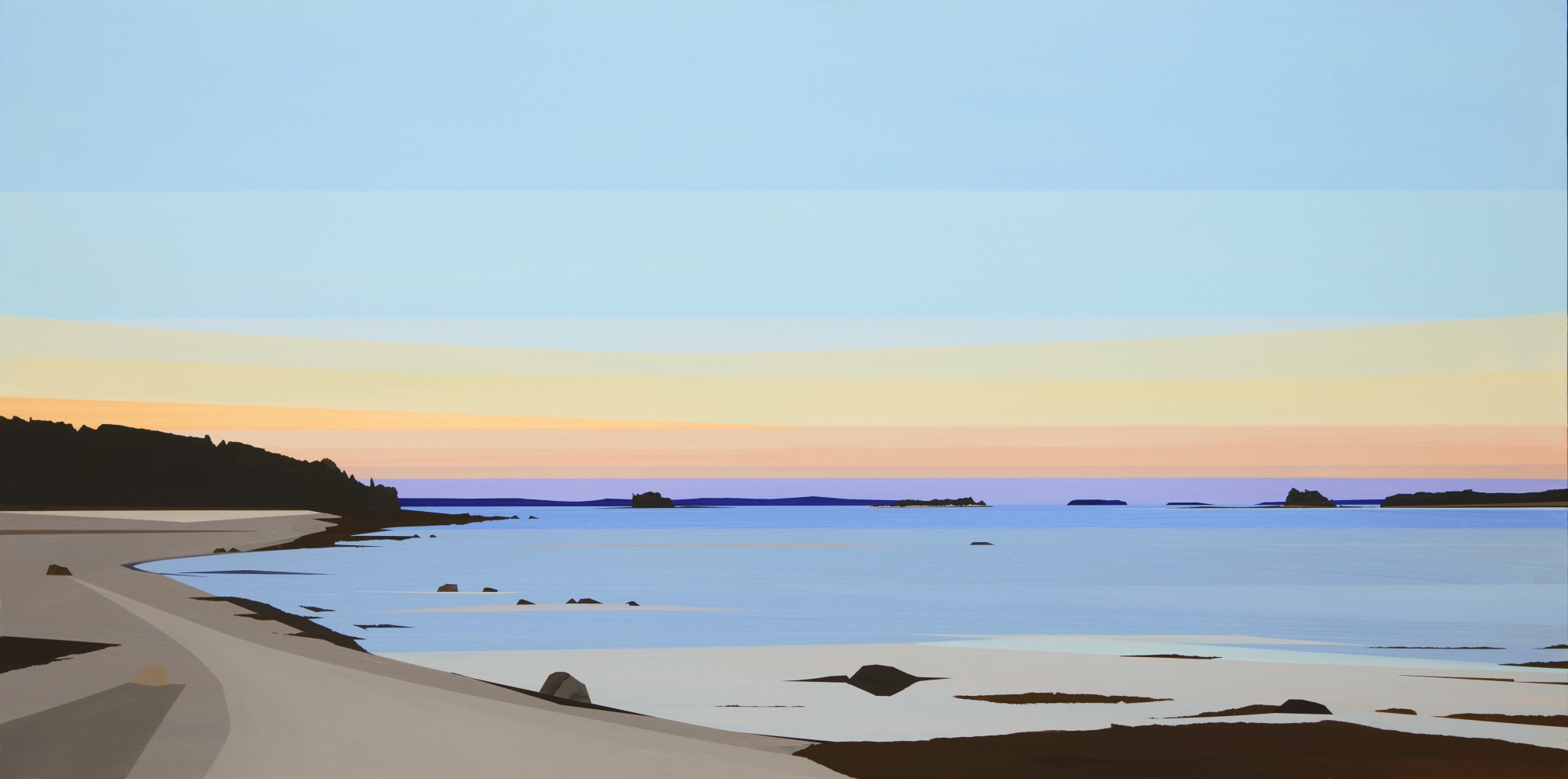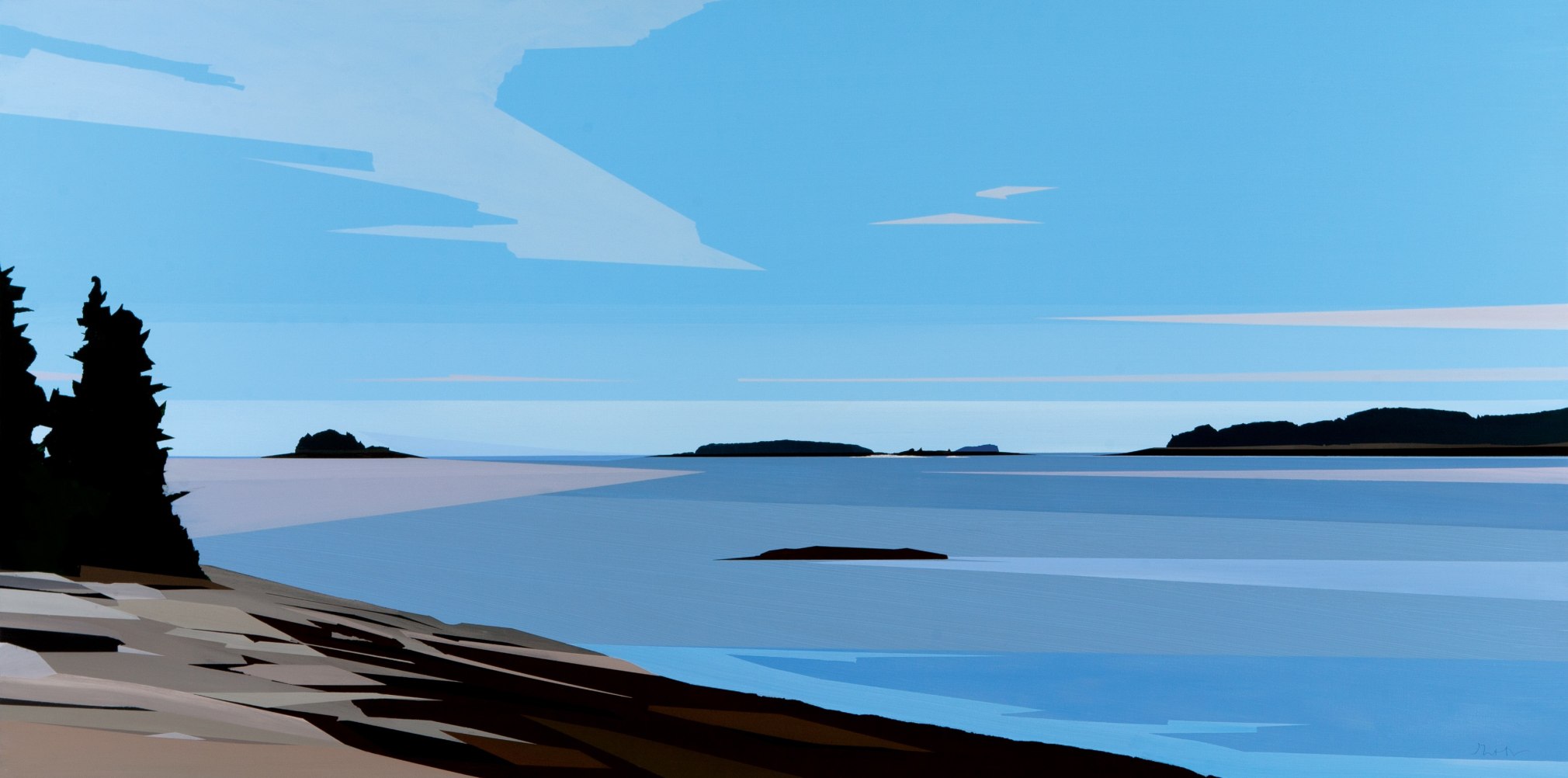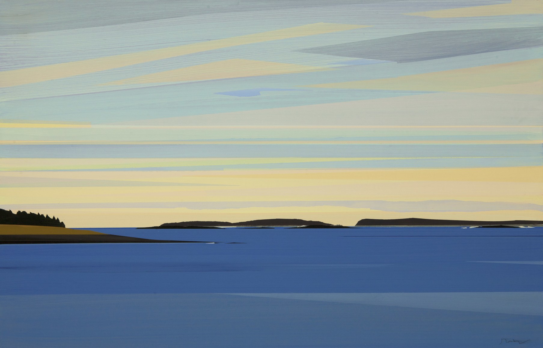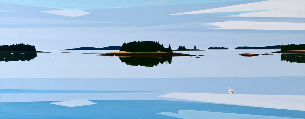 Greta Van Campen distills the world around her into prismatic, clean-edged images that visually thrum with clear notes of color. Reducing still life and landscape elements to essential forms, she pictures nature and domesticity as ordered arrangements of flat, abstracted shapes. Ocean and sky radiate from the horizon as swathes of fractured color or raking triangles of light. Islands, mountains, and trees appear as silhouettes, anchoring the expanse of land and sea. Growing up in an artistic household, her parents are artists Tim and Susan Van Campen, and now the mother of two small daughters with her partner Mike, Van Campen has recently been "thinking about 'home' and what that means to me." Several new interior scenes—spare, elegant still lifes inspired by her parent's home—are tone poems to treasured objects. "My life and my work are closely connected," she says. "There's no real separation for me, so in a sense, I paint what I live."