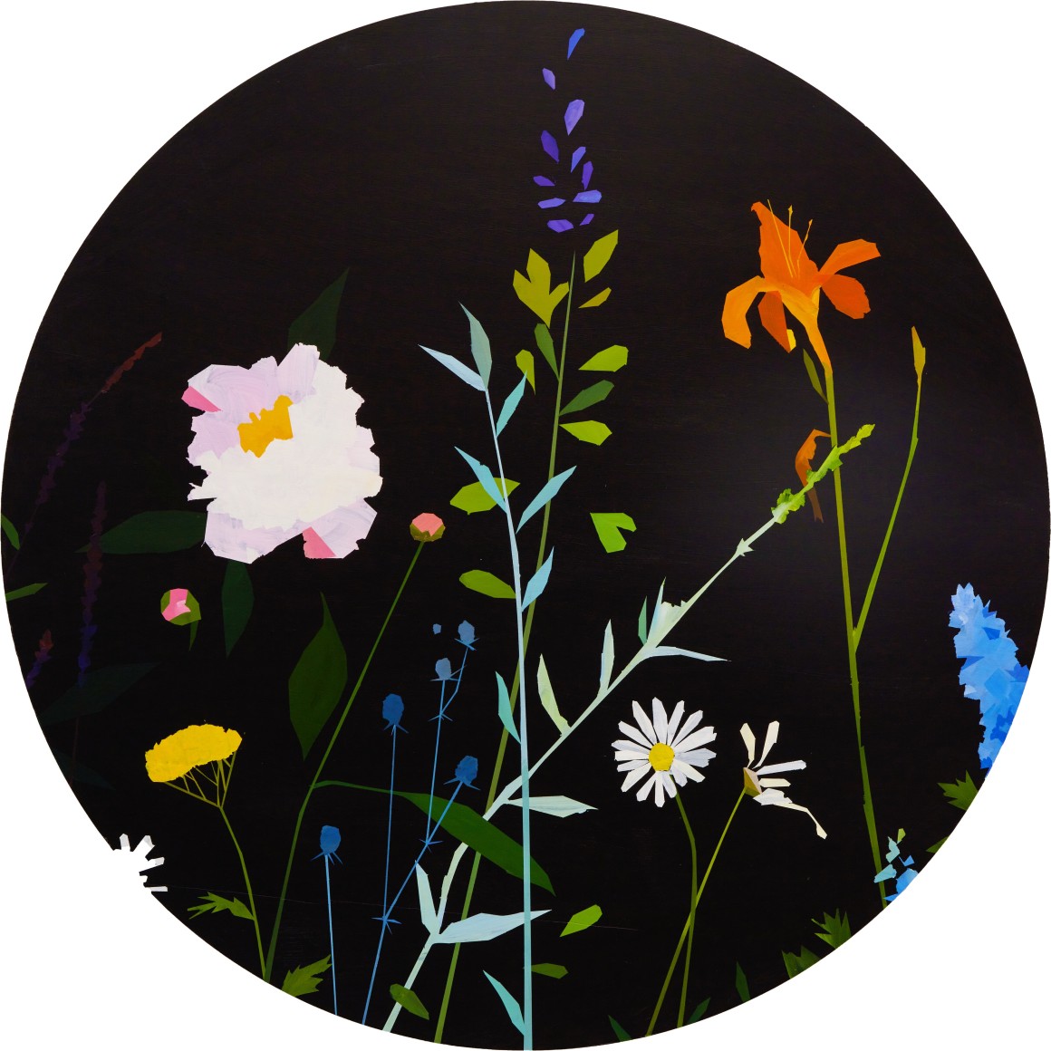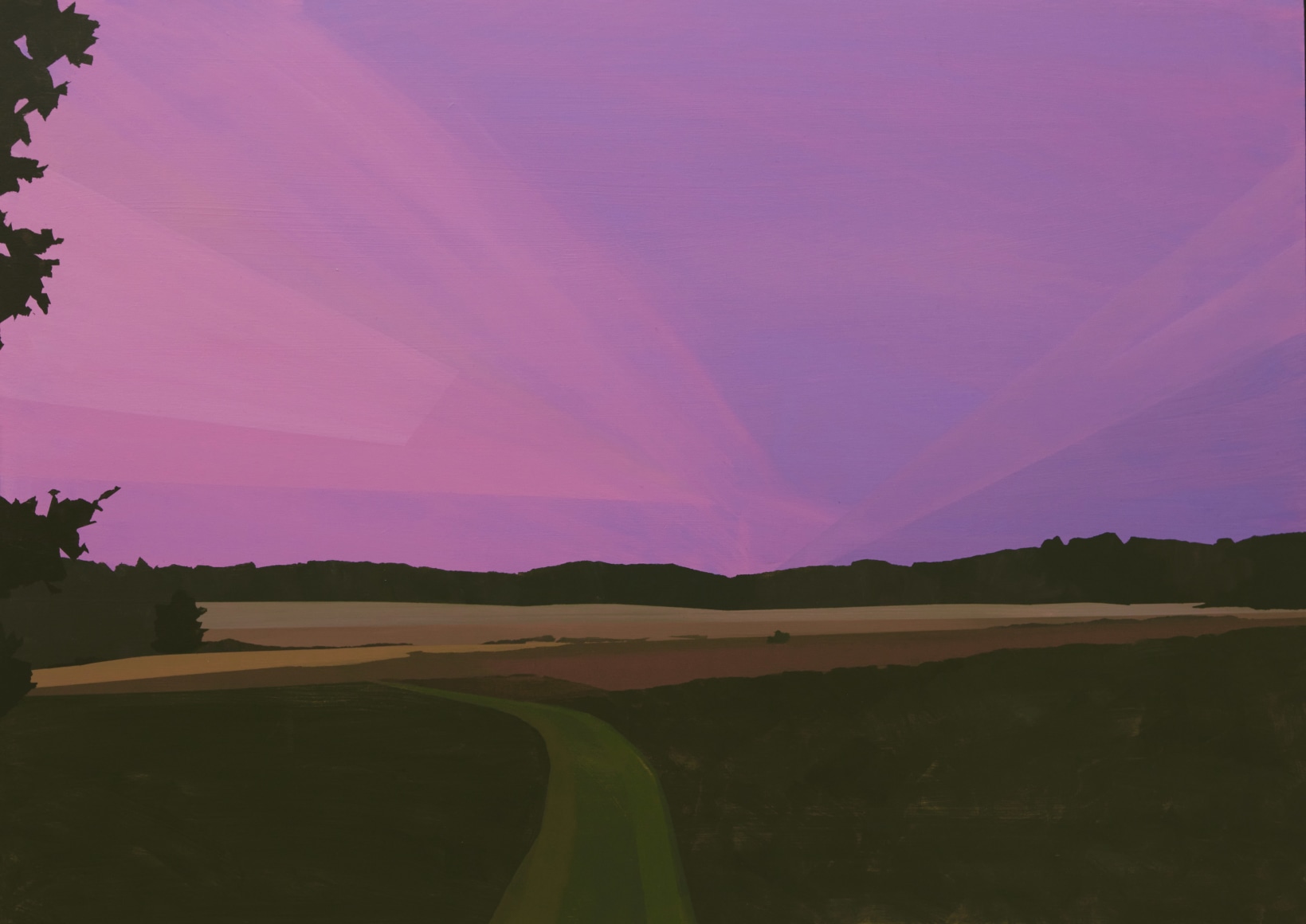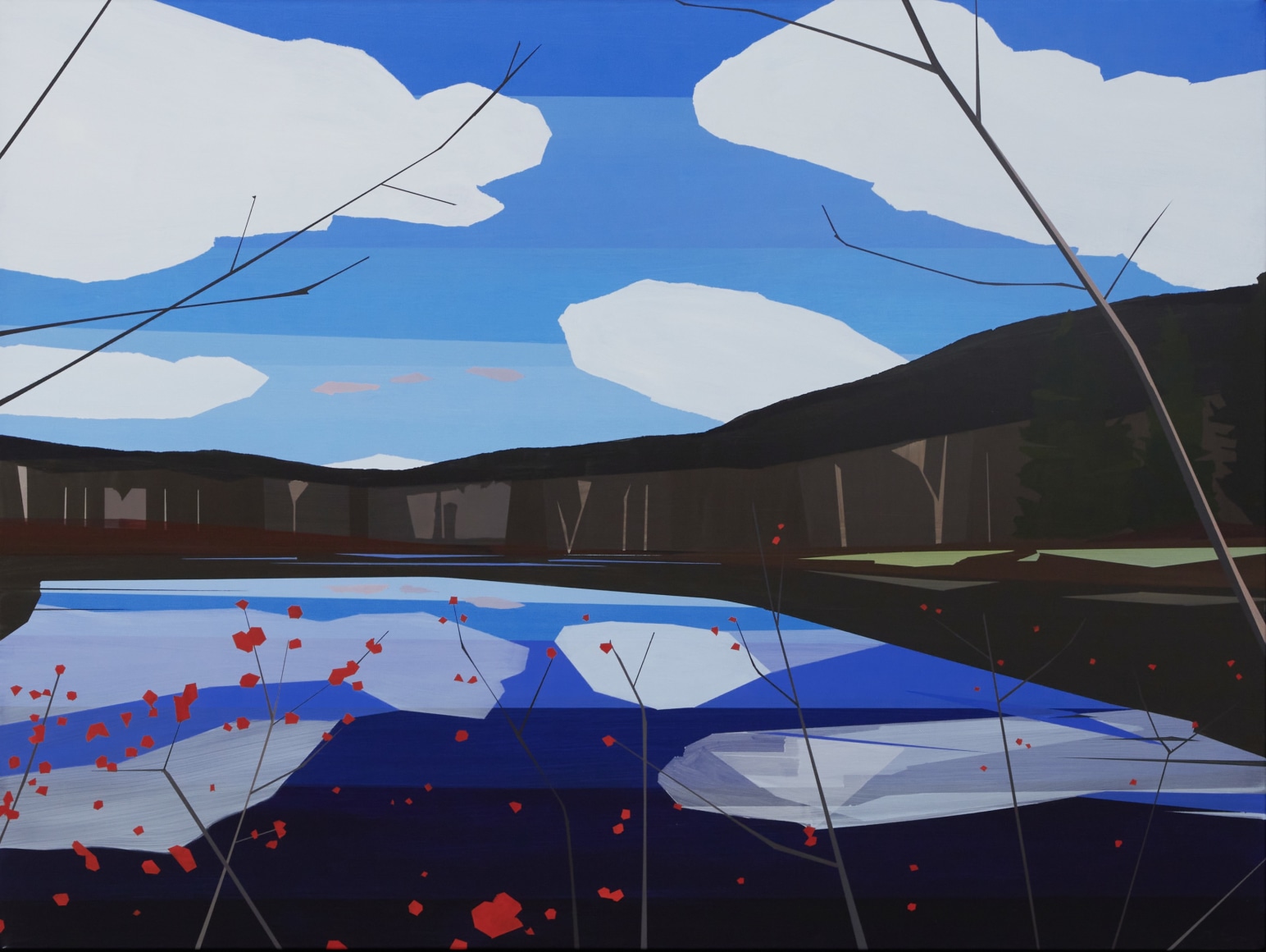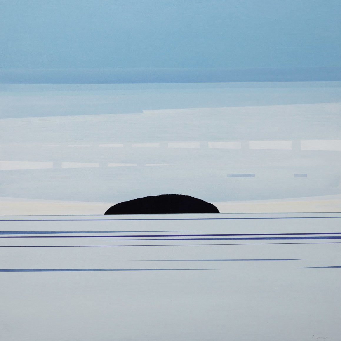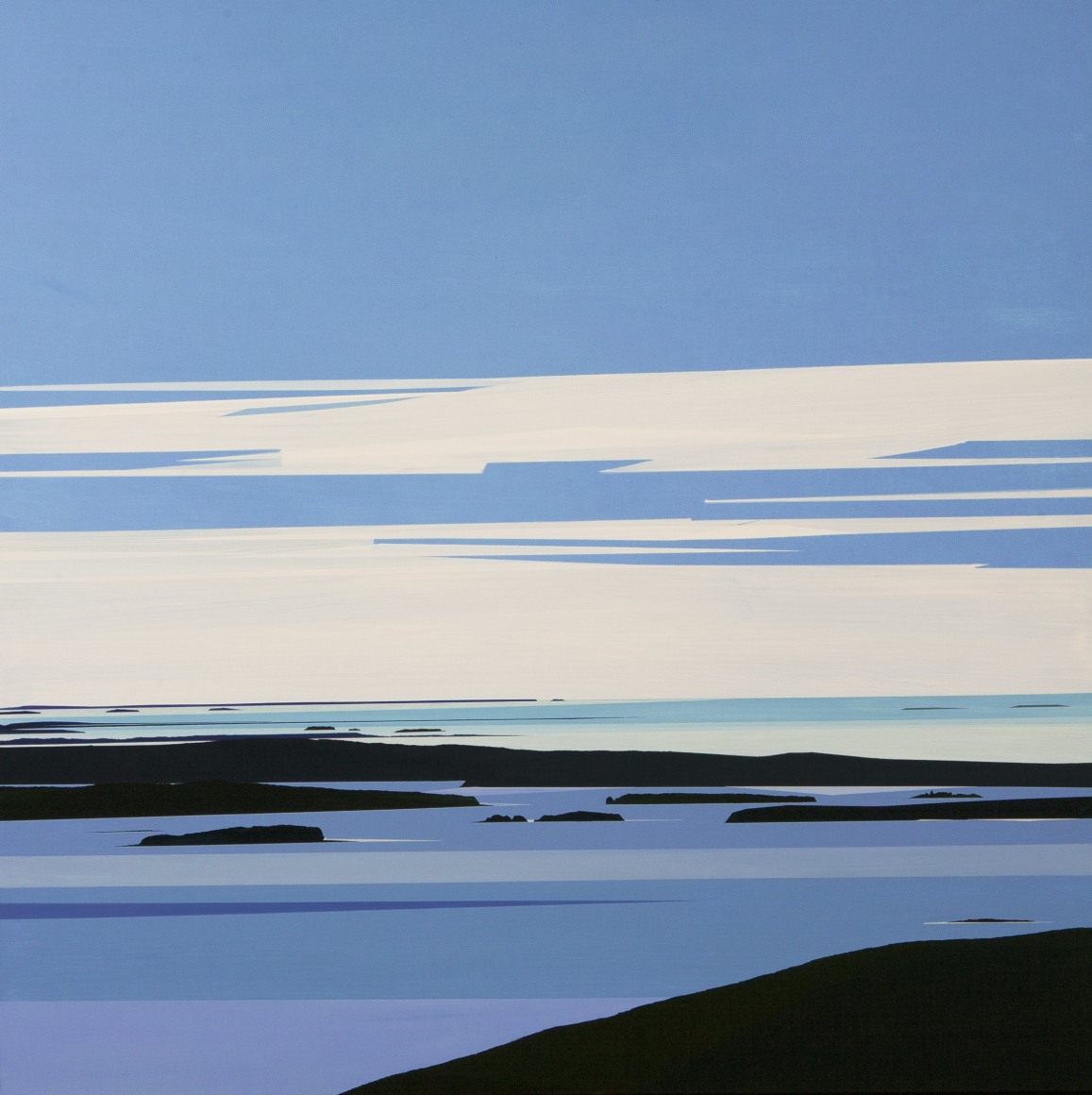Greta Van Campen distills the world around her into prismatic, clean-edged images that visually thrum with clear notes of color. Reducing still life and landscape elements to essential forms, she pictures nature and domesticity as ordered arrangements of flat, abstracted shapes. Ocean and sky radiate from the horizon as swathes of fractured color or raking triangles of light. Islands, mountains, and trees appear as silhouettes, anchoring the expanse of land and sea. Growing up in an artistic household, her parents are artists Tim and Susan Van Campen, and now the mother of two small daughters with her partner Mike, Van Campen has recently been "thinking about 'home' and what that means to me." Several new interior scenes—spare, elegant still lifes inspired by her parent's home—are tone poems to treasured objects. "My life and my work are closely connected," she says. "There's no real separation for me, so in a sense, I paint what I live."