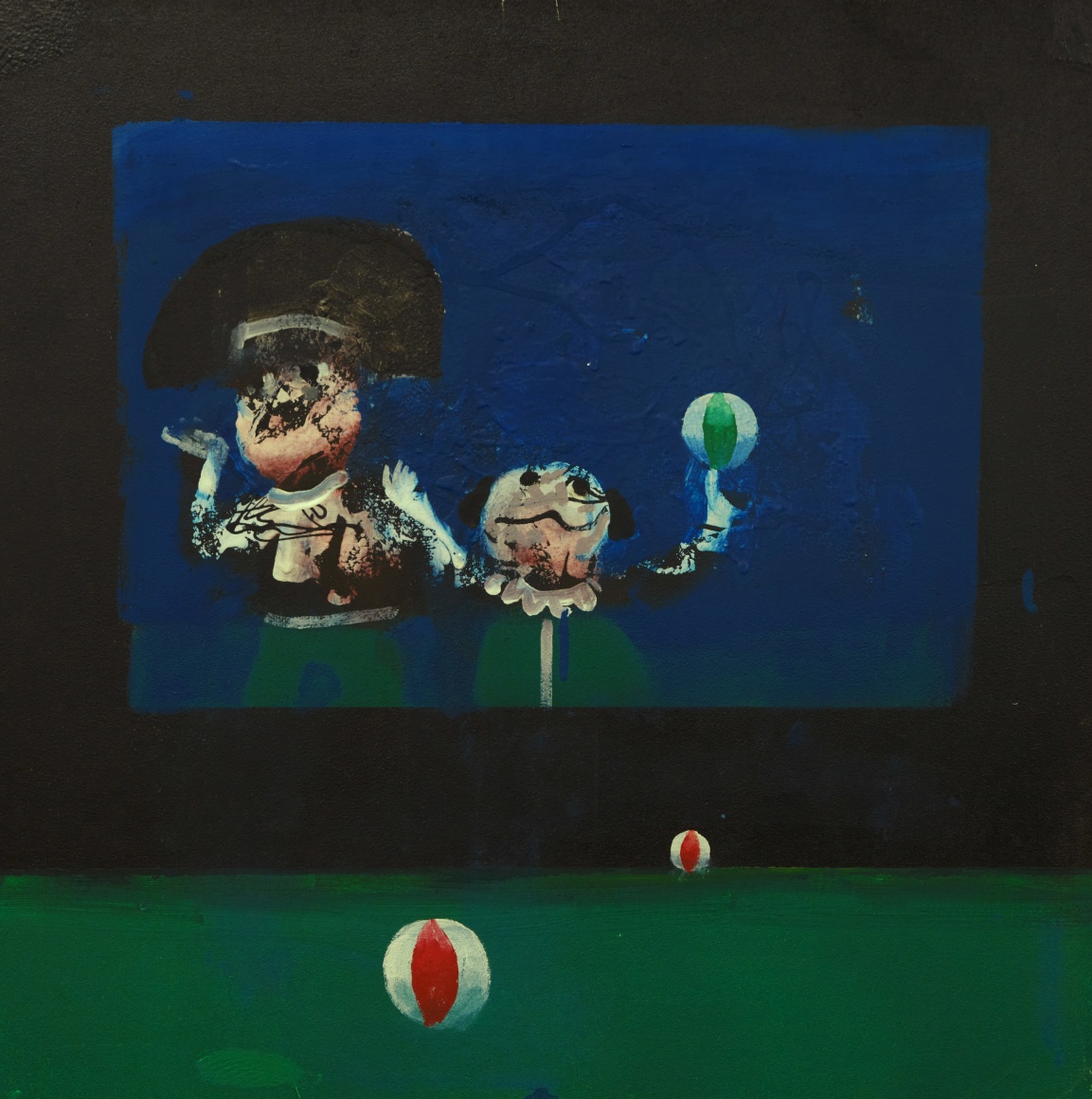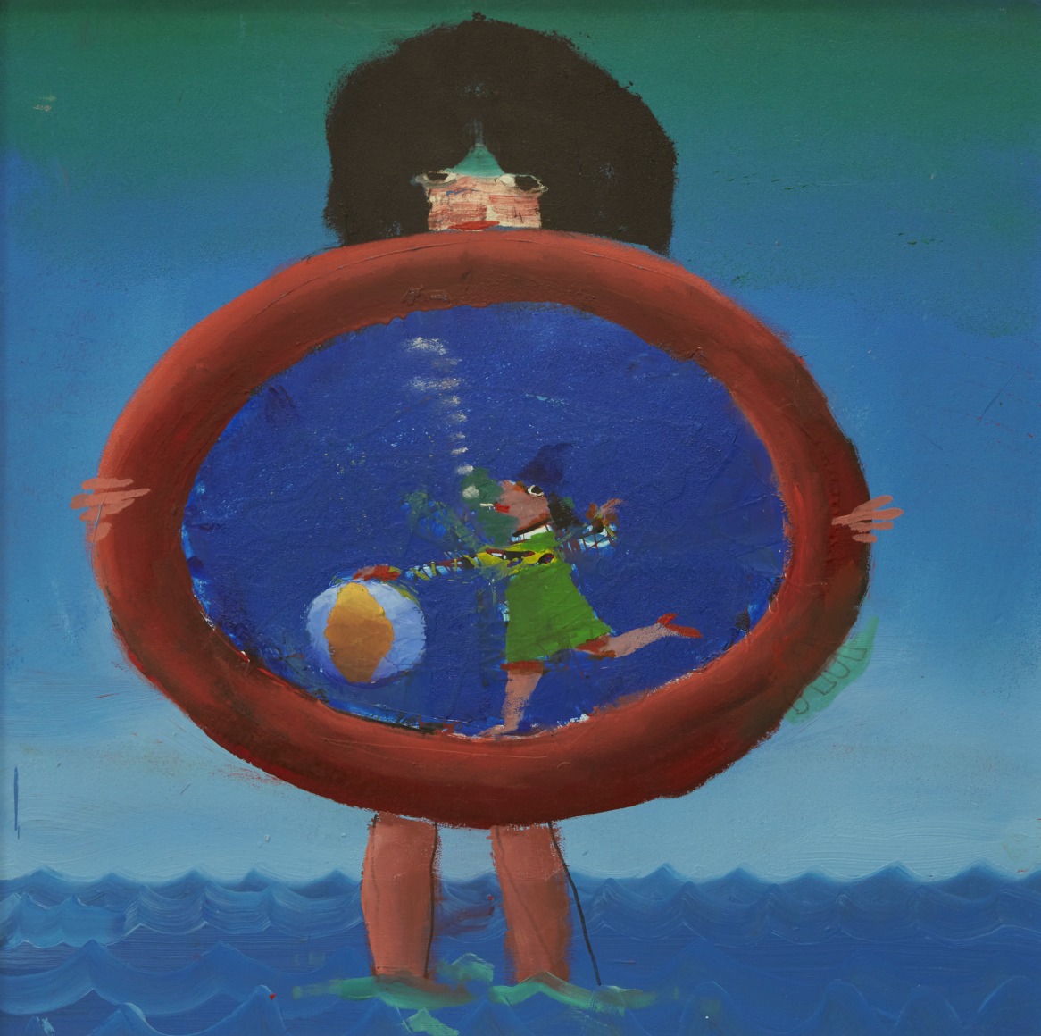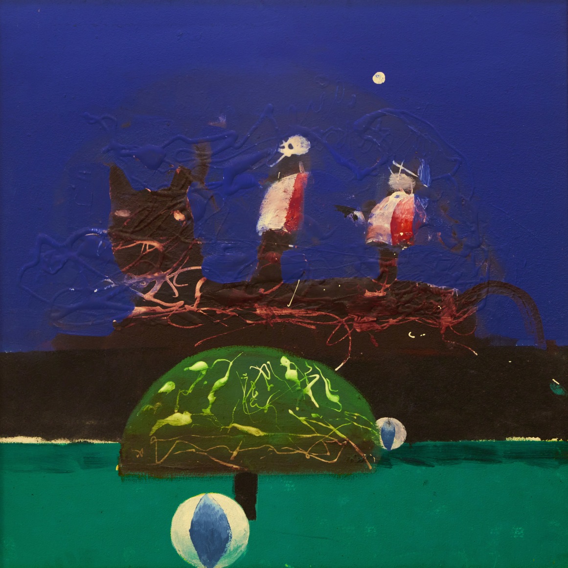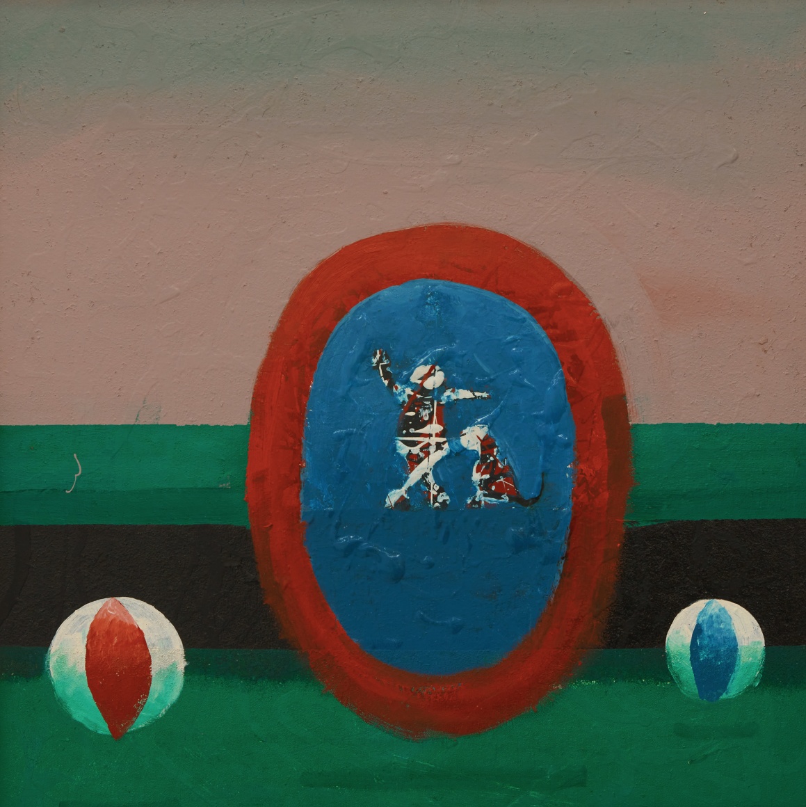 "Robert Hamilton retired to Port Clyde, Maine in 1981, after thirty four years of teaching at Rhode Island School of Design. His idiosyncratic paintings are variously inhabited by anonymous figures including tennis players, masked bandits who double as train conductors, museum guards, circus performers, military heroes, fellow artists, fighter pilots, opera singers and a menagerie of lions, tigers, and ‘Oh, my!’ characters snatched from dreams and free-floating, unbounded imagination. Within his dimly lit museum (a small octagonal room with clerestory admitting natural light), and like his cave painter ancestors, Hamilton conjured visions of what sustained him, fed his soul, a true shaman of magically real and deeply felt contemporary art.