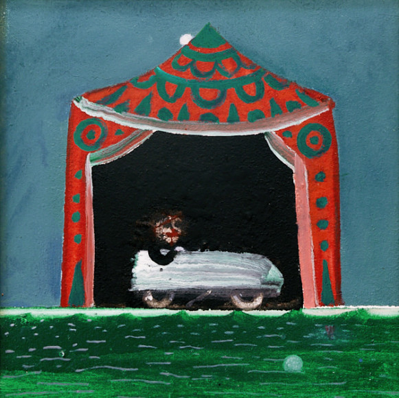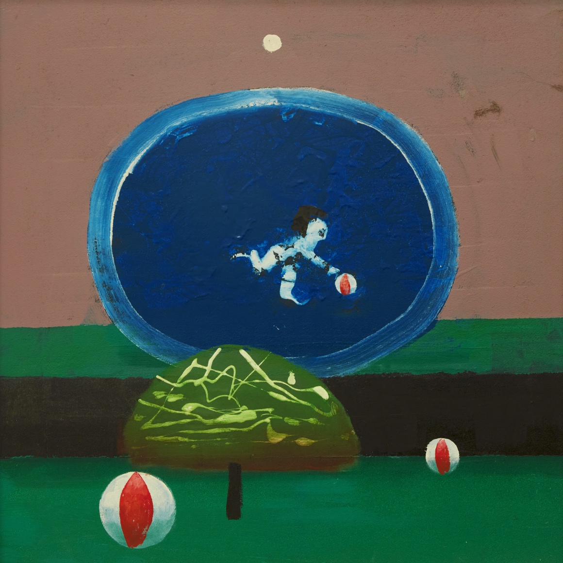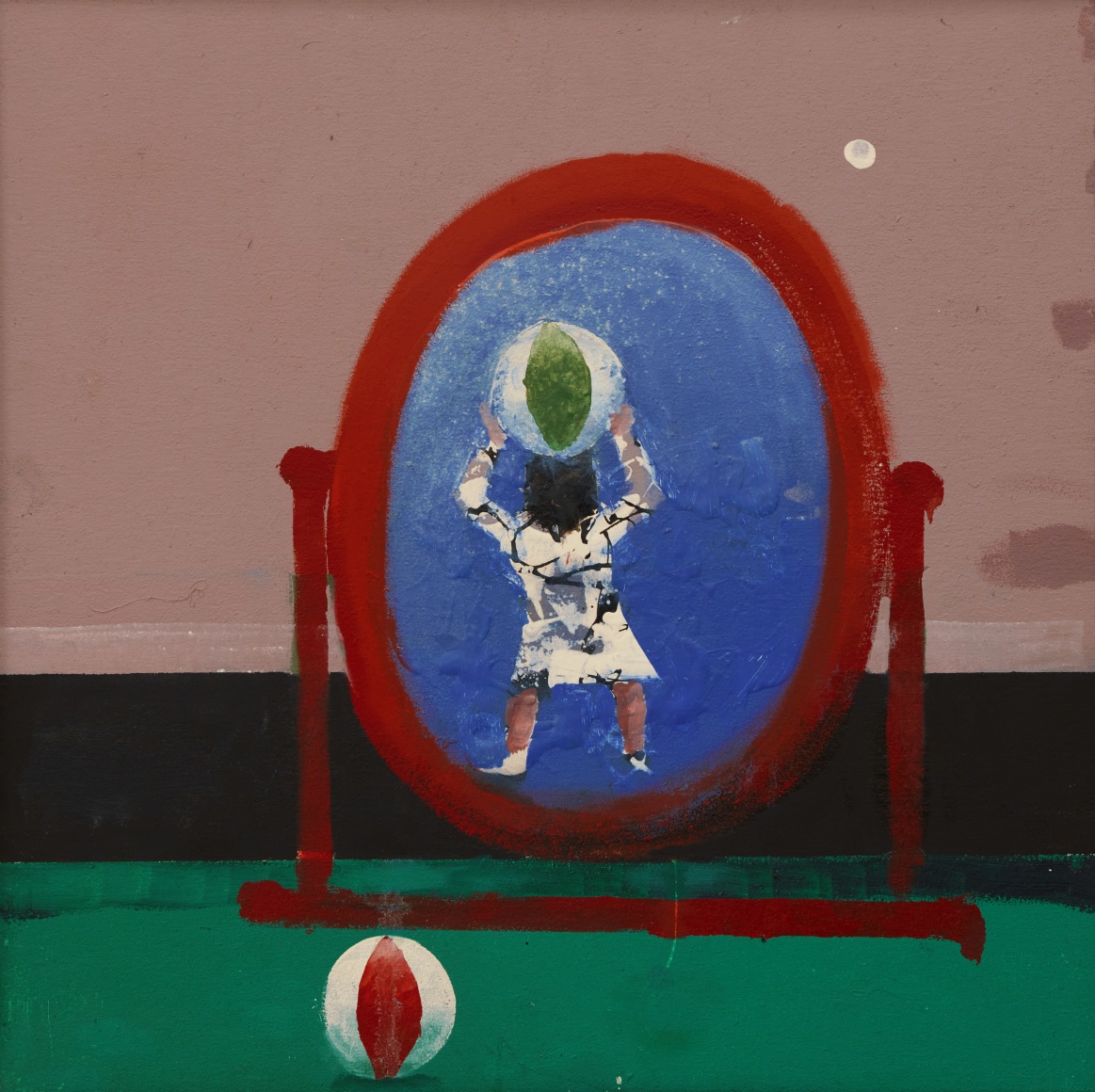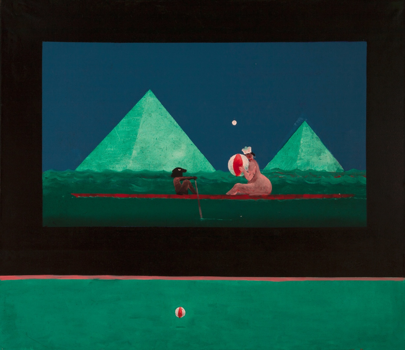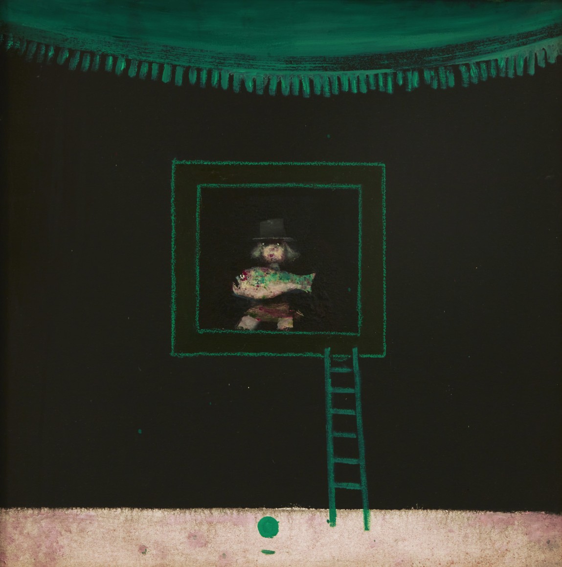 "Robert Hamilton retired to Port Clyde, Maine in 1981, after thirty four years of teaching at Rhode Island School of Design. His idiosyncratic paintings are variously inhabited by anonymous figures including tennis players, masked bandits who double as train conductors, museum guards, circus performers, military heroes, fellow artists, fighter pilots, opera singers and a menagerie of lions, tigers, and ‘Oh, my!’ characters snatched from dreams and free-floating, unbounded imagination. Within his dimly lit museum (a small octagonal room with clerestory admitting natural light), and like his cave painter ancestors, Hamilton conjured visions of what sustained him, fed his soul, a true shaman of magically real and deeply felt contemporary art.