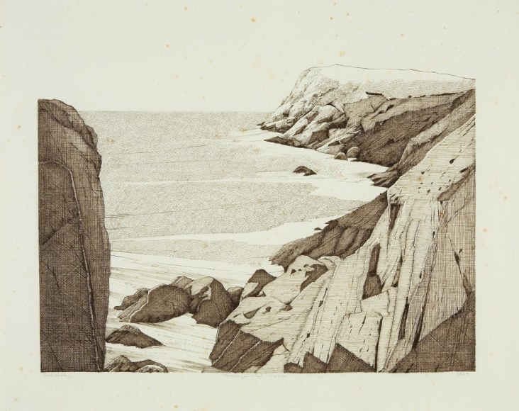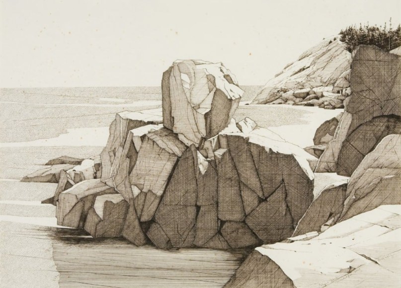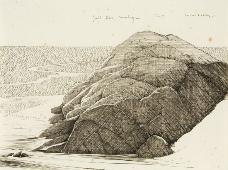 Kelley first registered warp as a subject during a stay on Monhegan, a favorite haunt since his first visit there as a teenager. Over the years the remote island has inspired a range of work, including a stunning group of sepia ink drawings of Pulpit Rock. The imposing outcrop is recreated with meticulous crosshatching and other marks as if by an architect infatuated with rock.