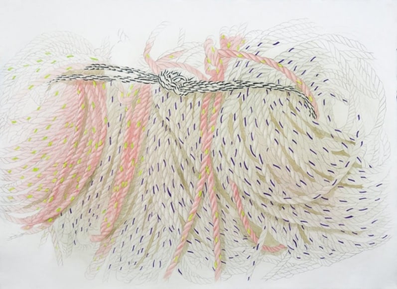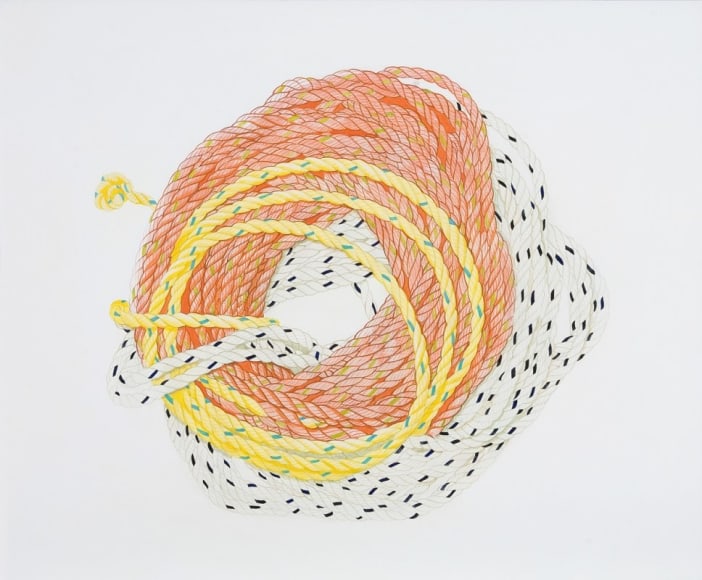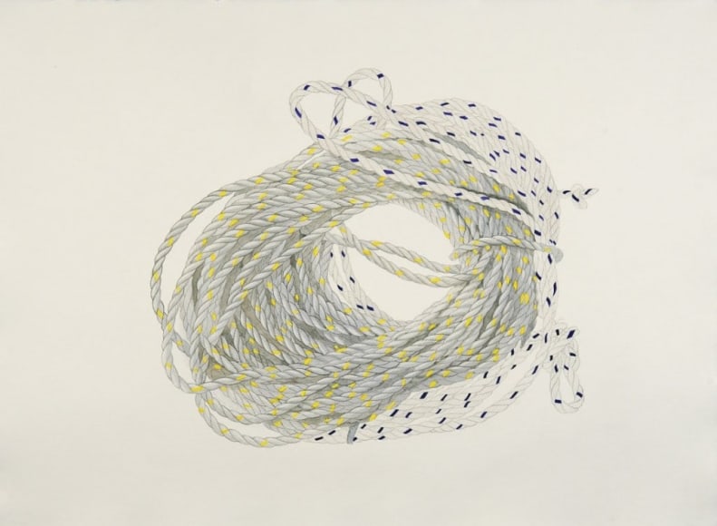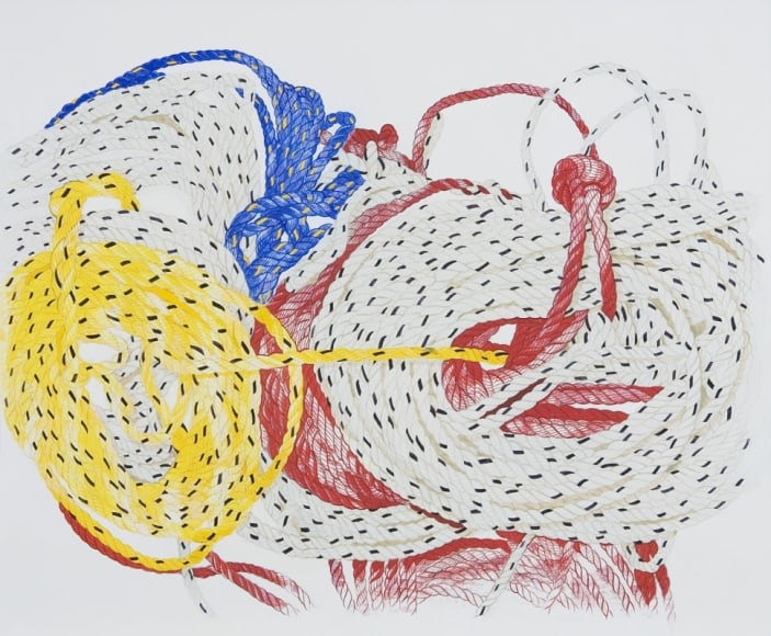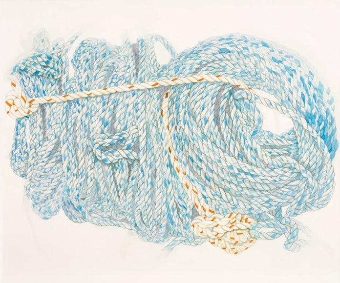 An obsessive artist, Kelley pursues his vision however daunting or complex it may be. This past winter he completed a remarkable series of watercolors of pot warp, the line used by lobstermen to secure their traps. Taken out of context of dock, deck or fish house, the coils of rope are transformed into lively abstract configurations, exquisite and often ethereal.