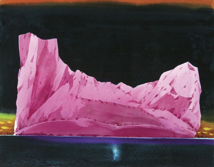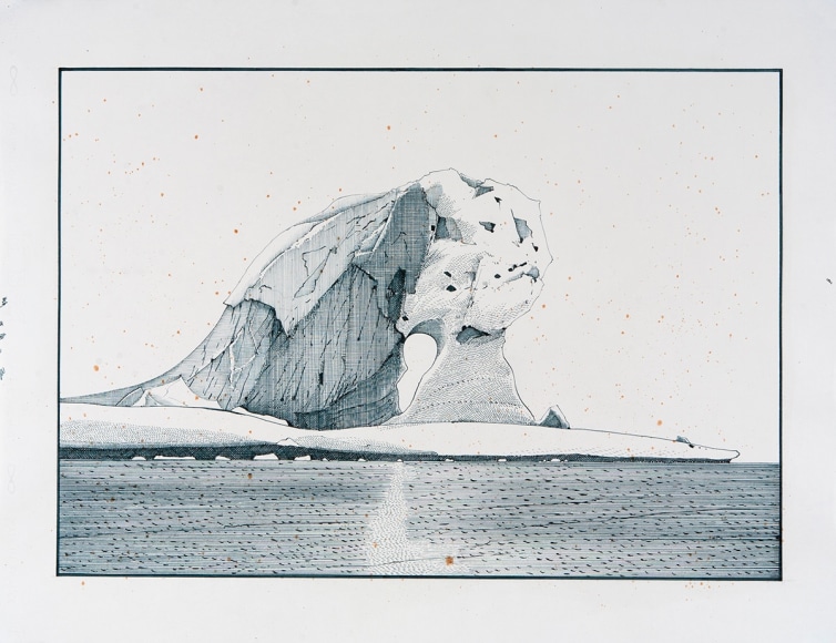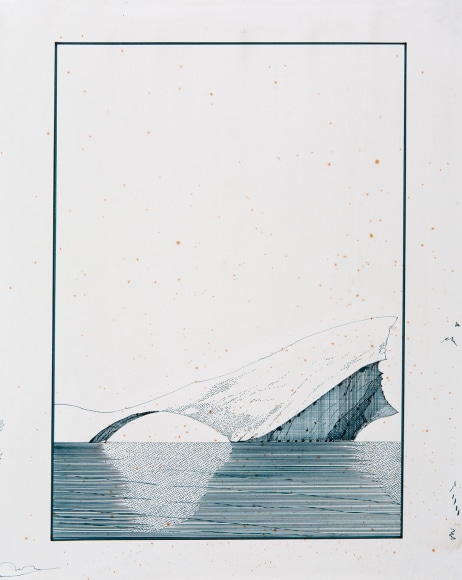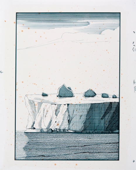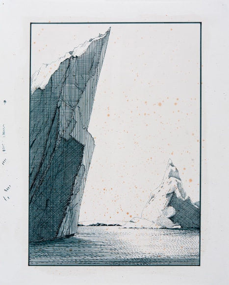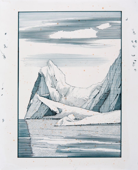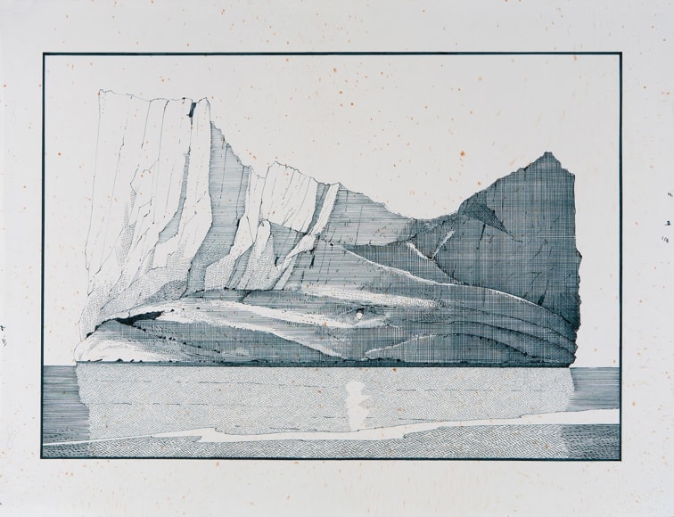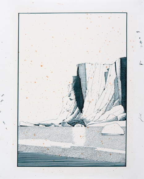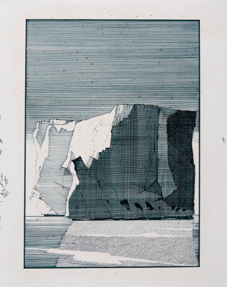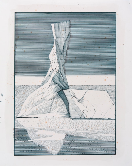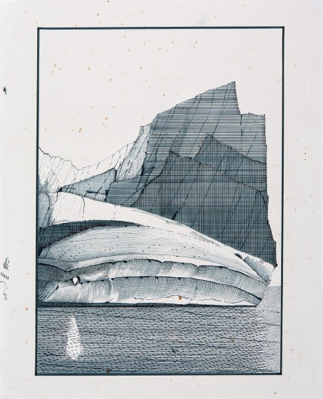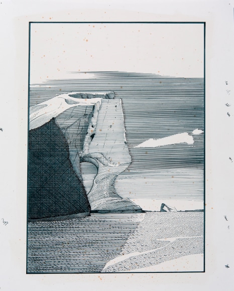 Kelley first registered warp as a subject during a stay on Monhegan, a favorite haunt since his first visit there as a teenager. Over the years the remote island has inspired a range of work, including a stunning group of sepia ink drawings of Pulpit Rock. The imposing outcrop is recreated with meticulous crosshatching and other marks as if by an architect infatuated with rock.