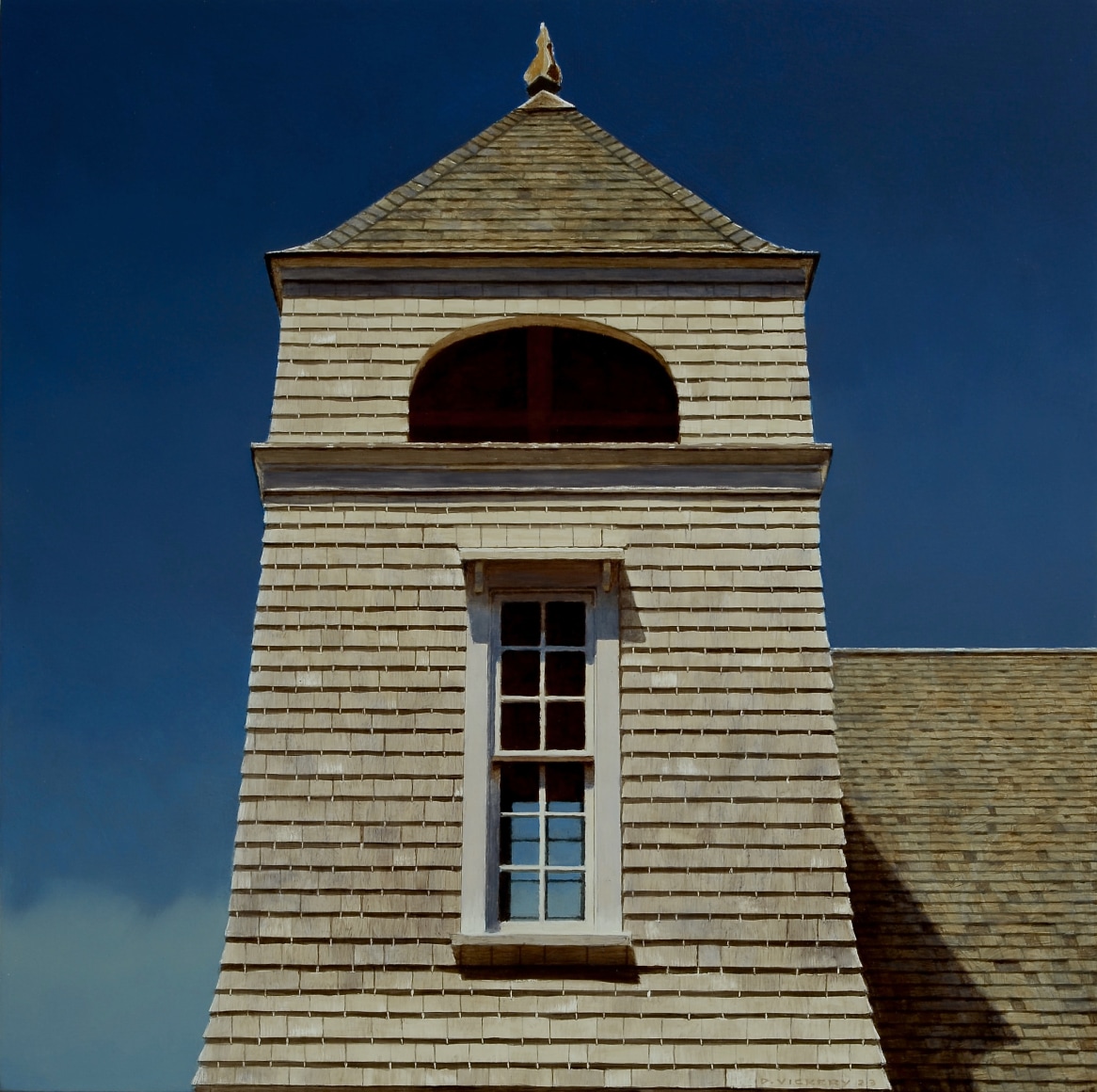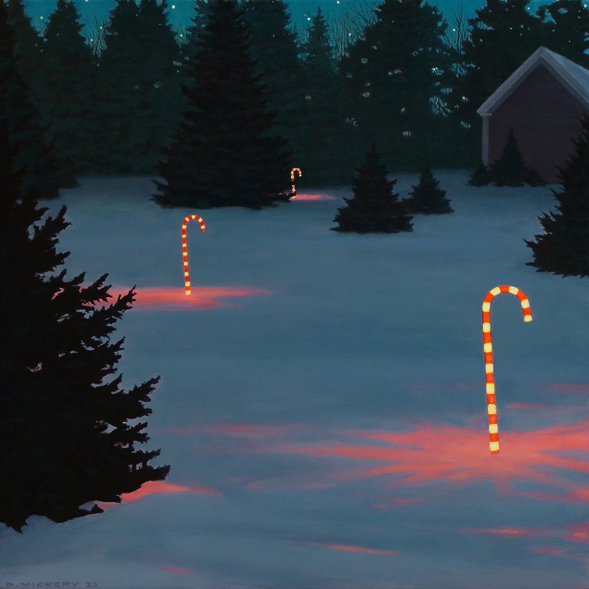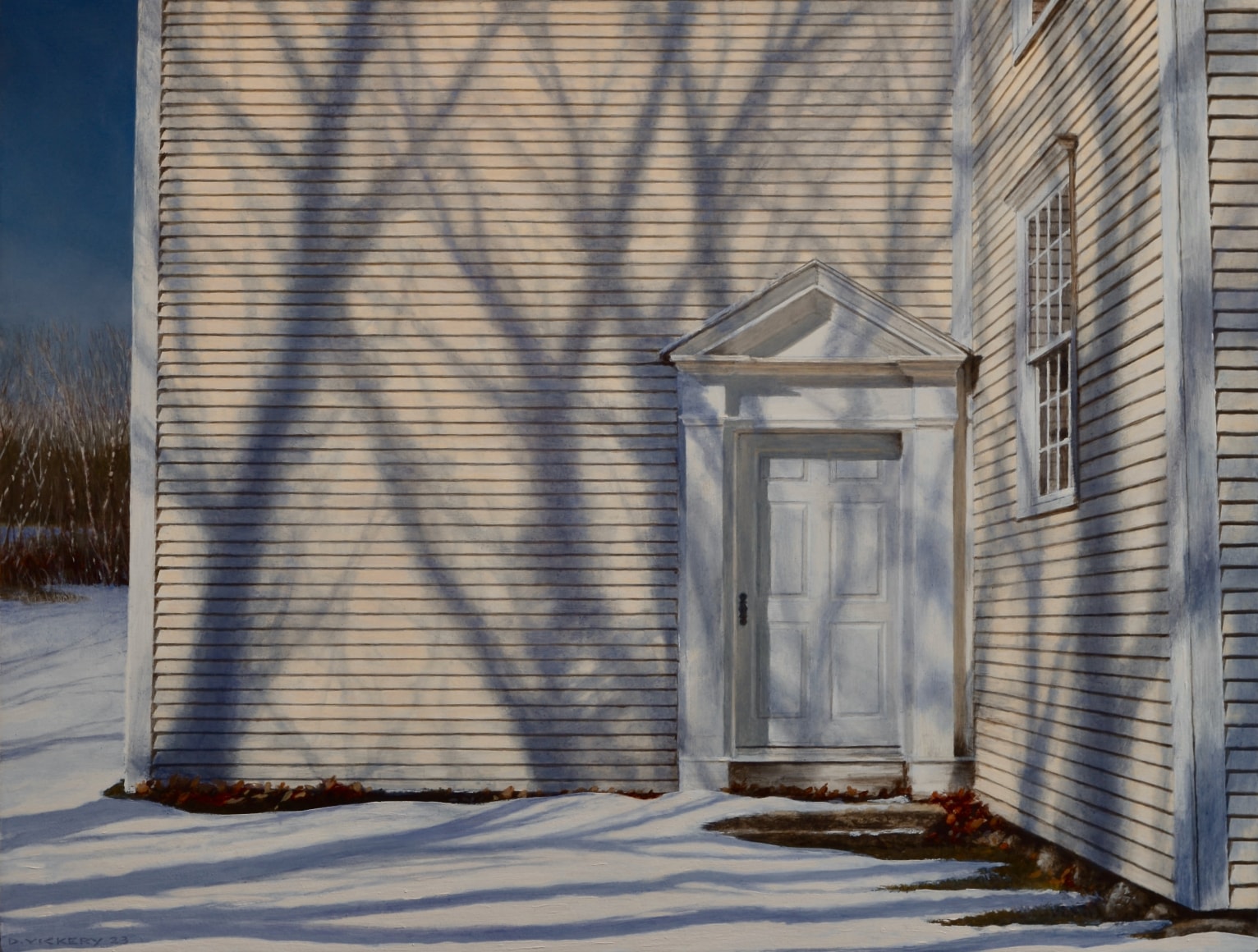 David Vickery makes carefully composed, exquisitely crafted paintings that arrest the eye, that draw our attention to the particular within the every day—a bit of sky and dark evergreens reflected in an oblique window, a network of leafless trees casting their shadows against white clapboards, the warm glow of a lit interior framed within the crisp geometry of a grey house—the transitory nature of light and places where the natural and man-made connect. His subjects are primarily drawn from his immediate environment, the landscape, and local villages near his studio in Cushing, Maine, and from his annual trips to Monhegan Island. The images are built up slowly in several thin layers of oil and varnish, a deliberate, contemplative process that lends a meditative quality to the finished, highly detailed paintings.
