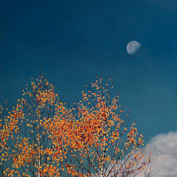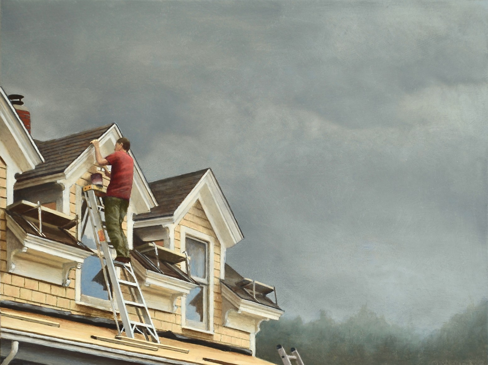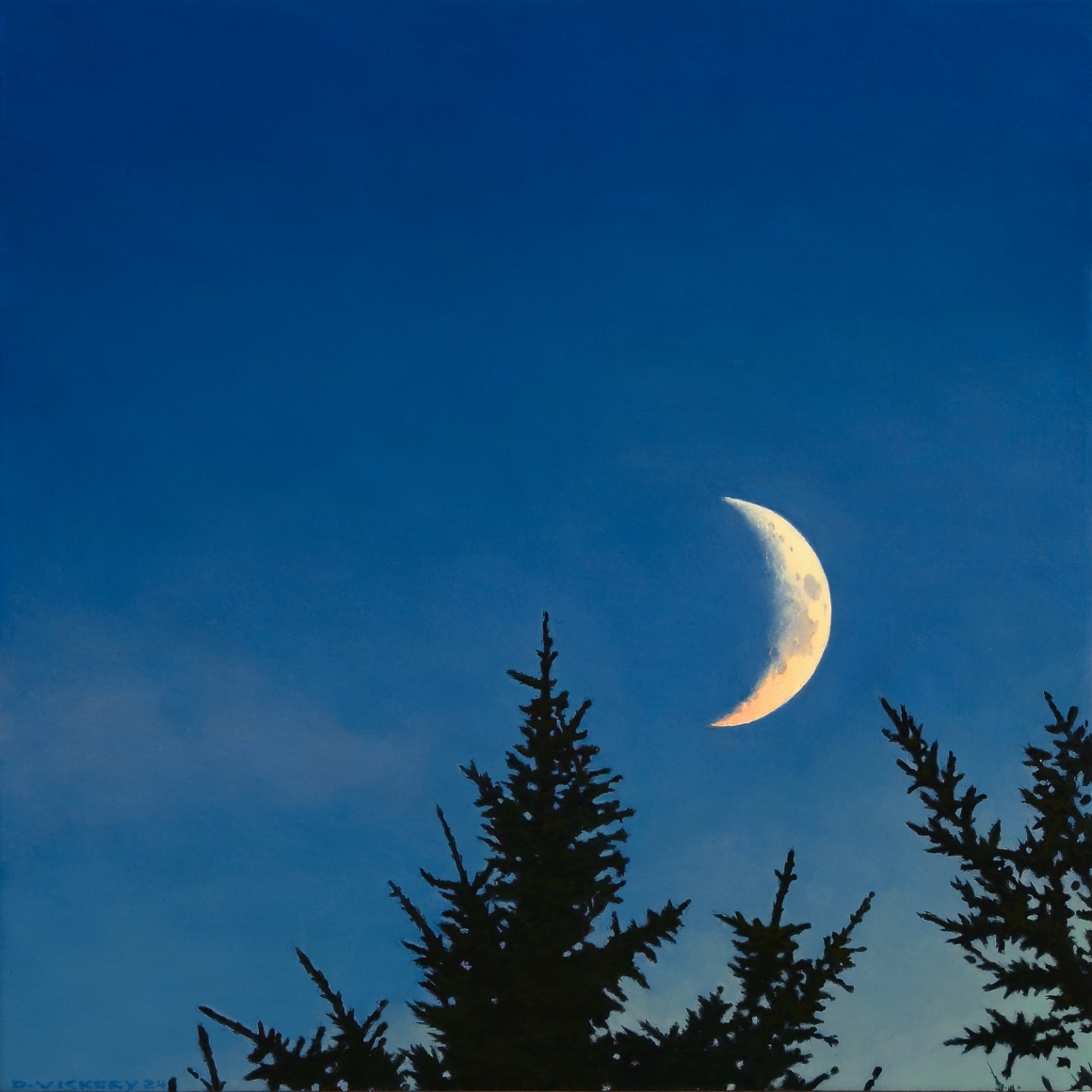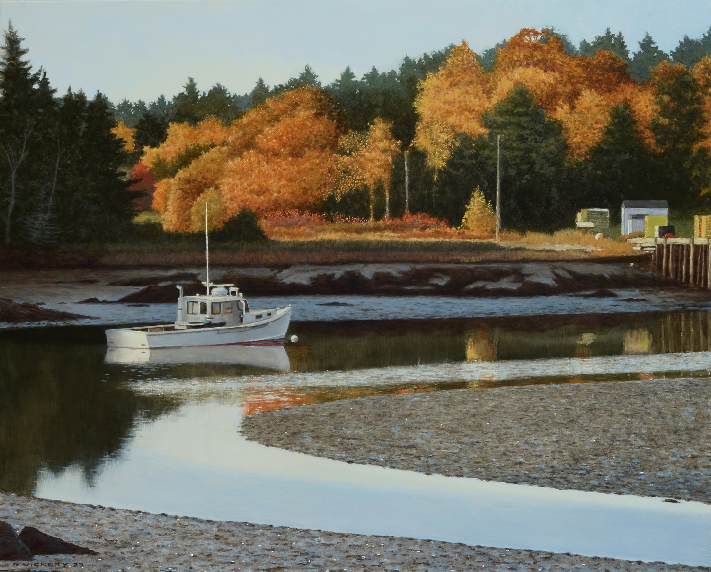 David Vickery makes carefully composed, exquisitely crafted paintings that arrest the eye, that draw our attention to the particular within the every day—a bit of sky and dark evergreens reflected in an oblique window, a network of leafless trees casting their shadows against white clapboards, the warm glow of a lit interior framed within the crisp geometry of a grey house—the transitory nature of light and places where the natural and man-made connect. His subjects are primarily drawn from his immediate environment, the landscape, and local villages near his studio in Cushing, Maine, and from his annual trips to Monhegan Island. The images are built up slowly in several thin layers of oil and varnish, a deliberate, contemplative process that lends a meditative quality to the finished, highly detailed paintings.