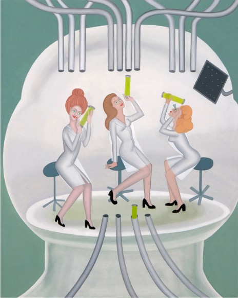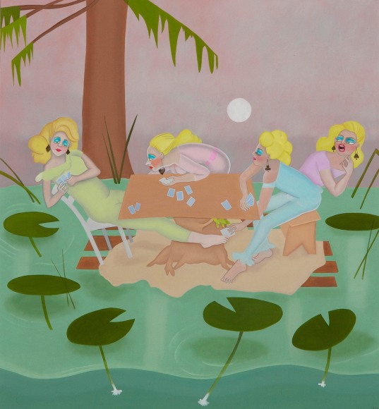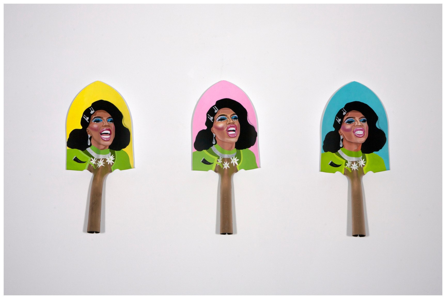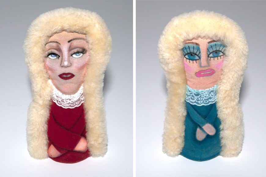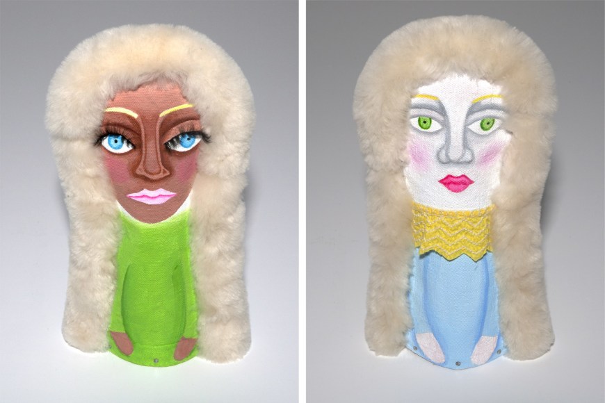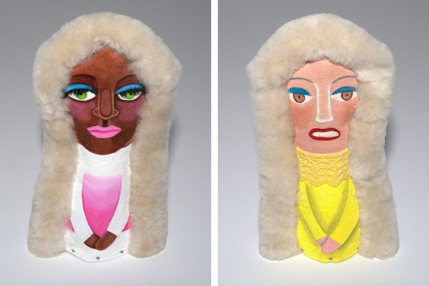 Acrylic on stuffed canvas, double sided with sheepskin trim, false eyelashes and fabric