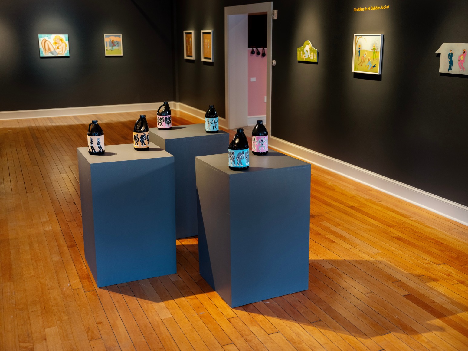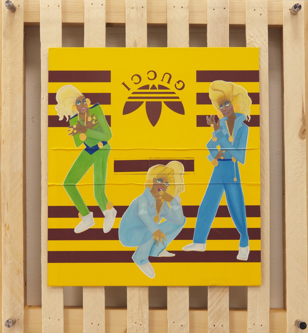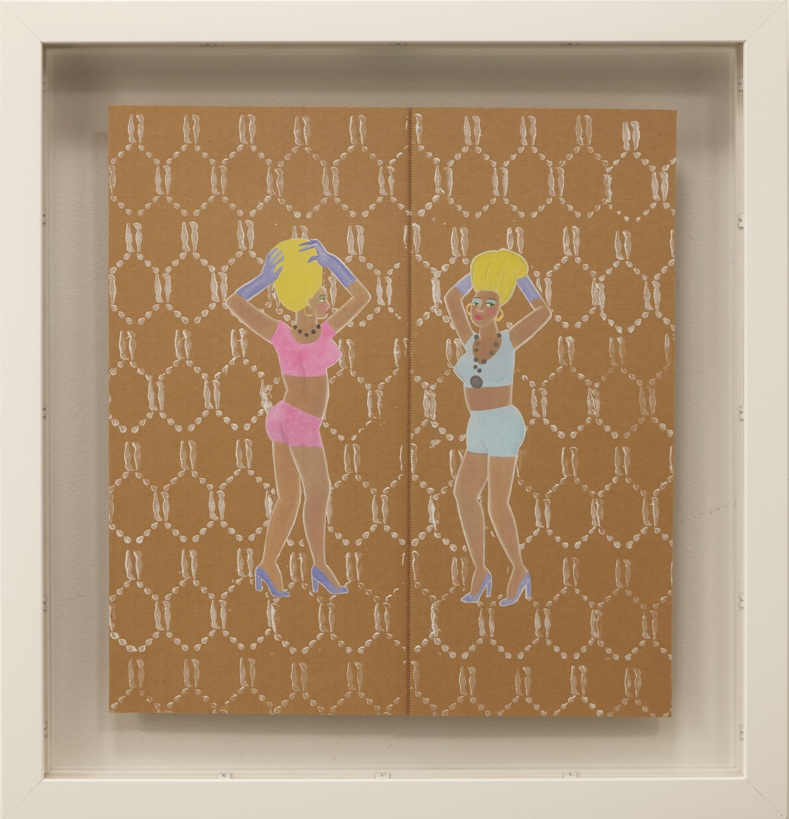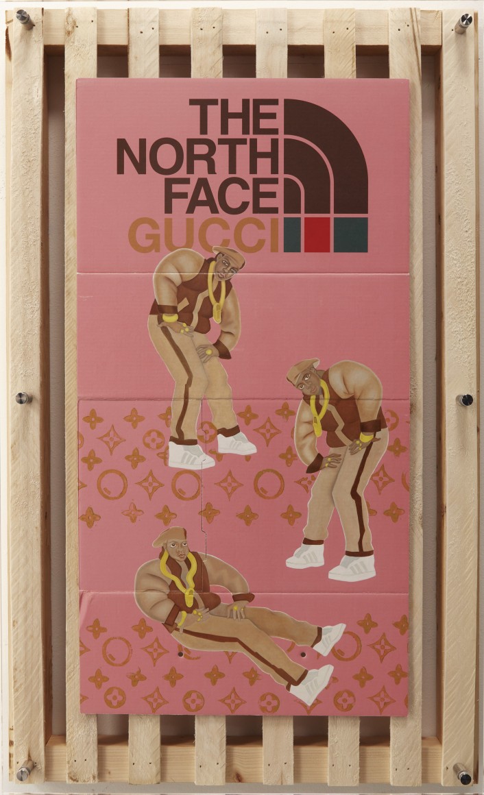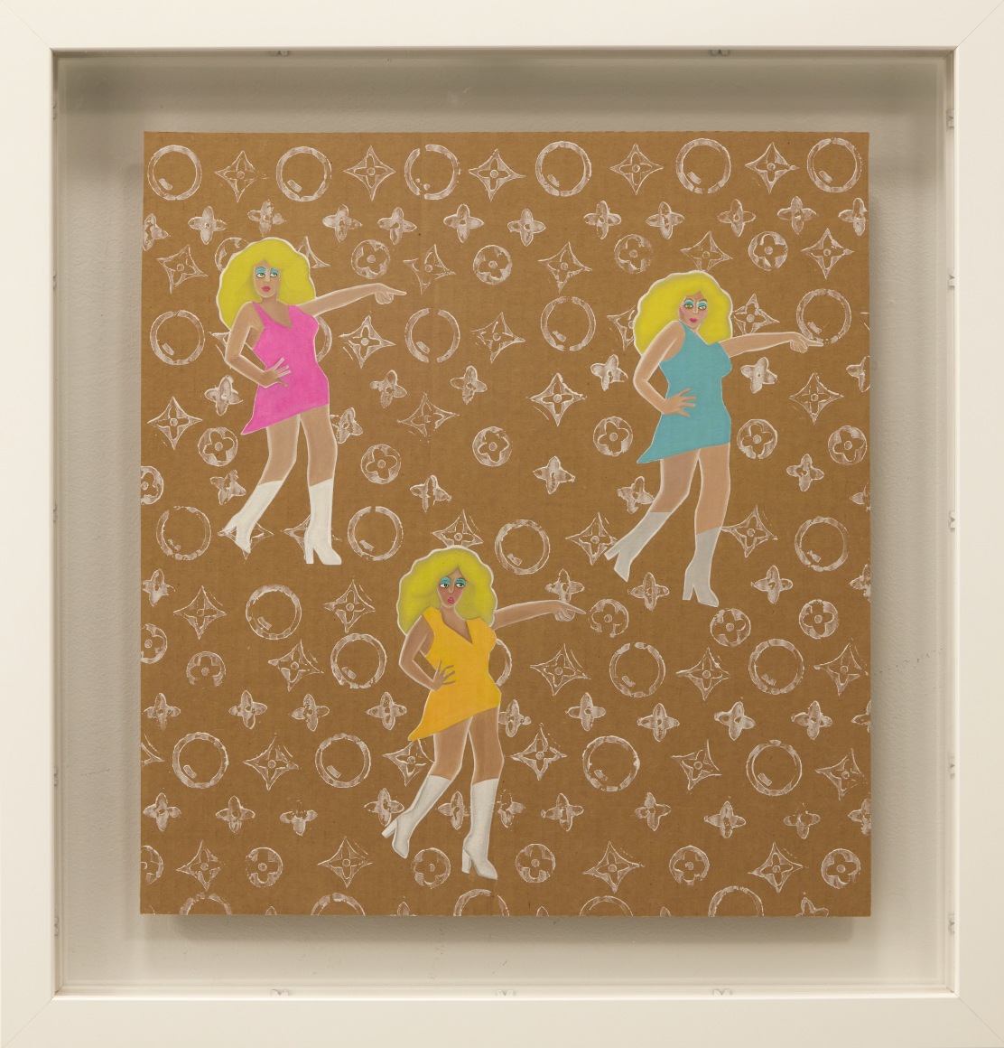 The cardboard pieces are a modern take on Bill Traylor’s folk art. In This Way the characters are pointing (a device in drag runway performance) to where they are walking toward. A place unseen, out of frame while swimming in a hand-printed zen (logo) mania of bubbles, a Louis Vuitton-esque homemade branding. The other, a character “Lil Paintsy” is reflecting on herself in a sea of paint brushes with paint drips, a Gucci-esque homemade branding.