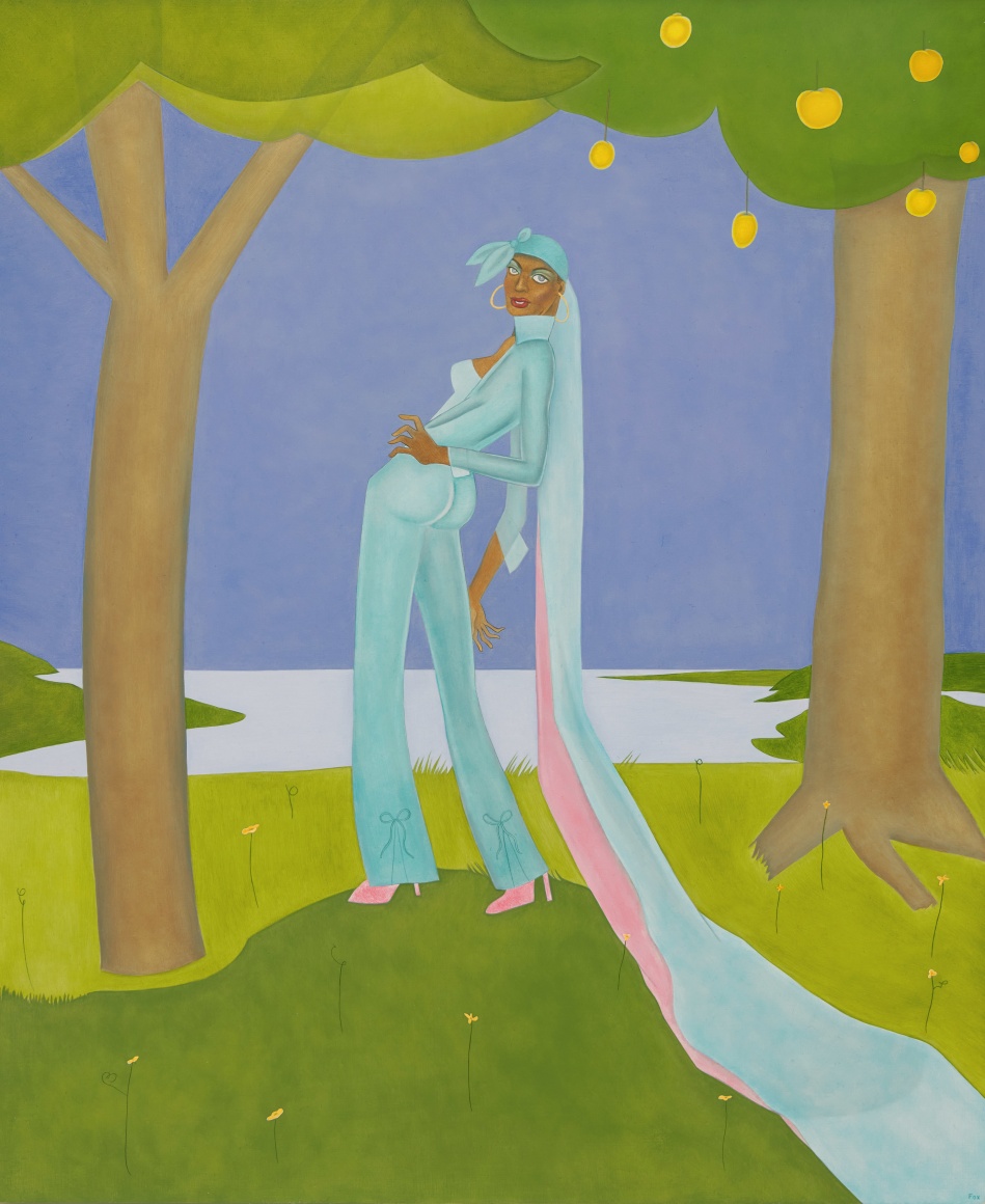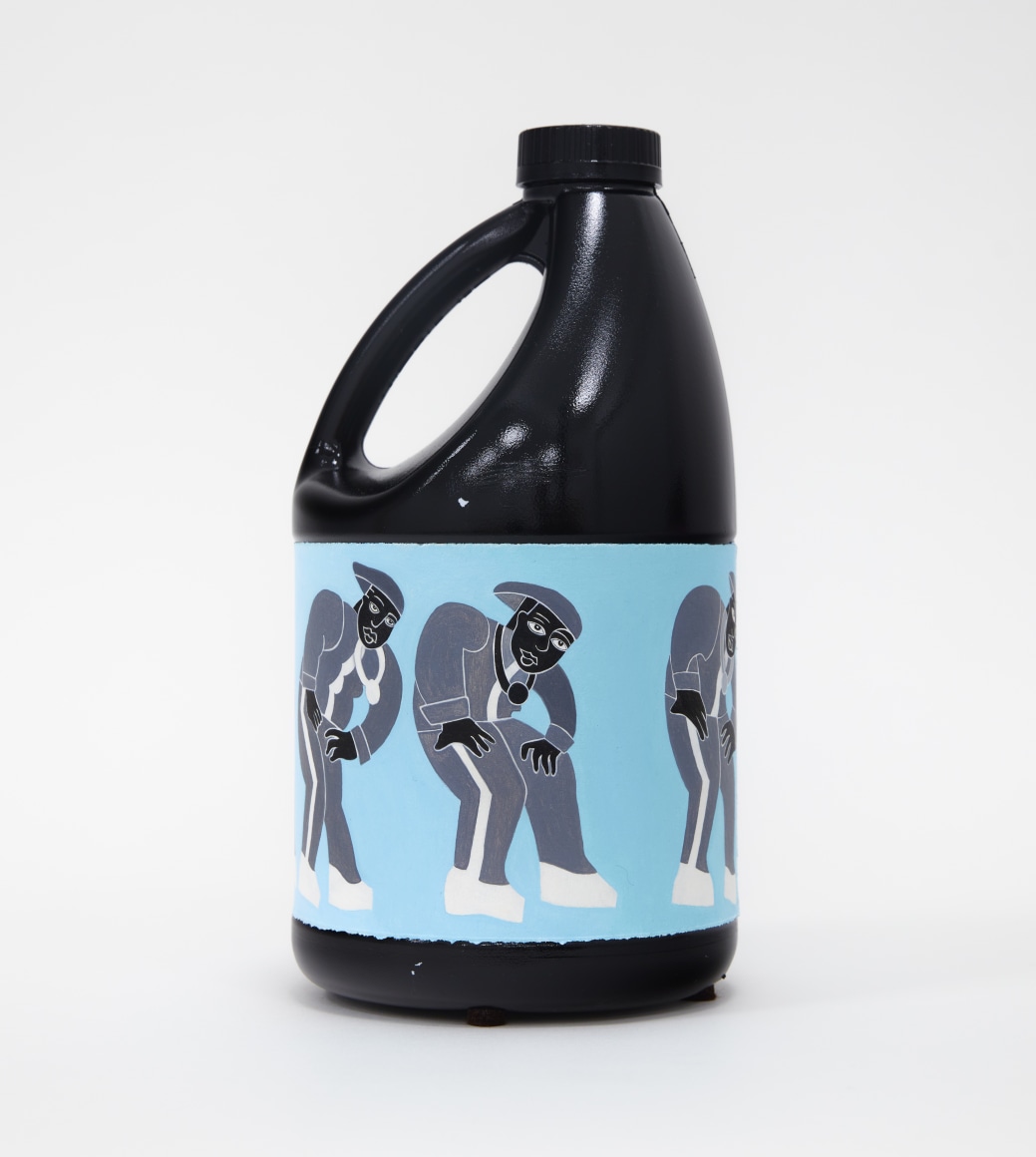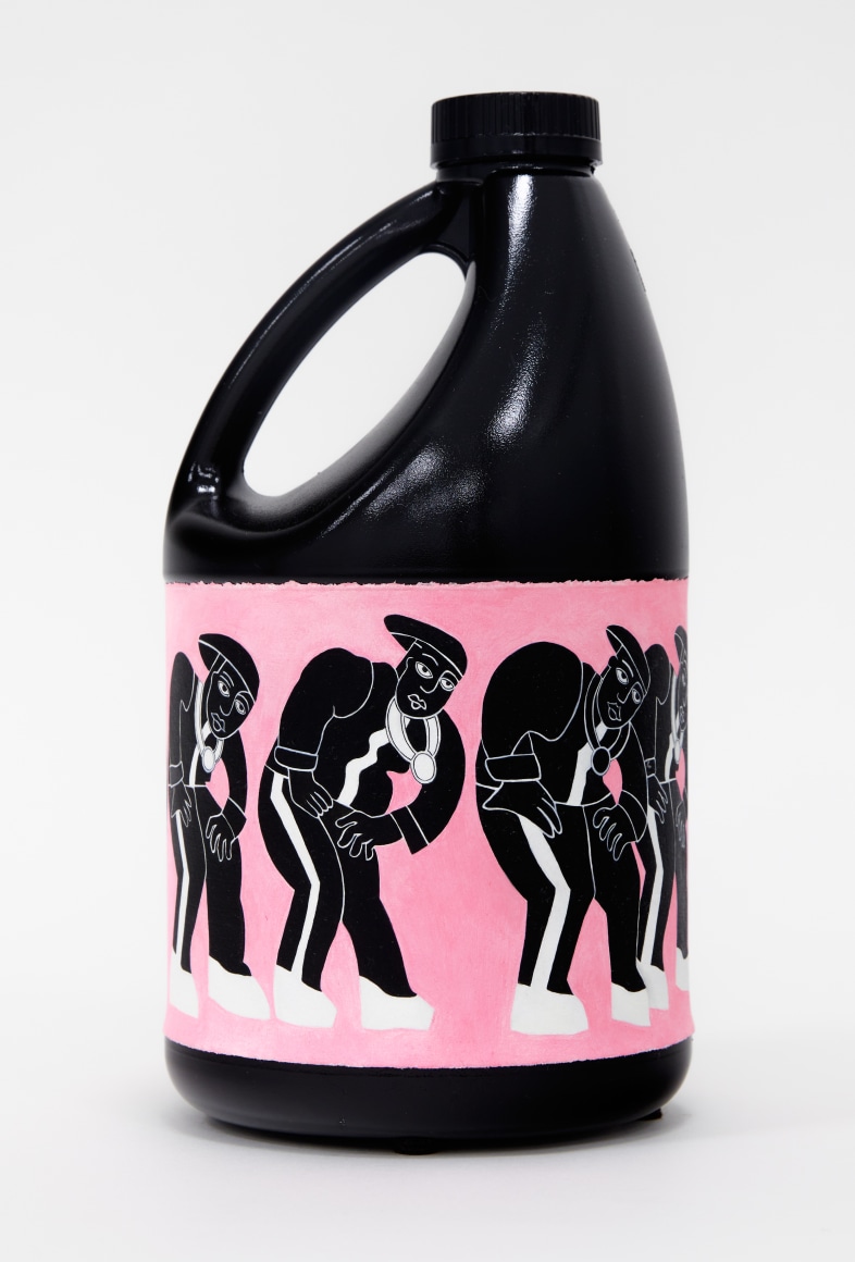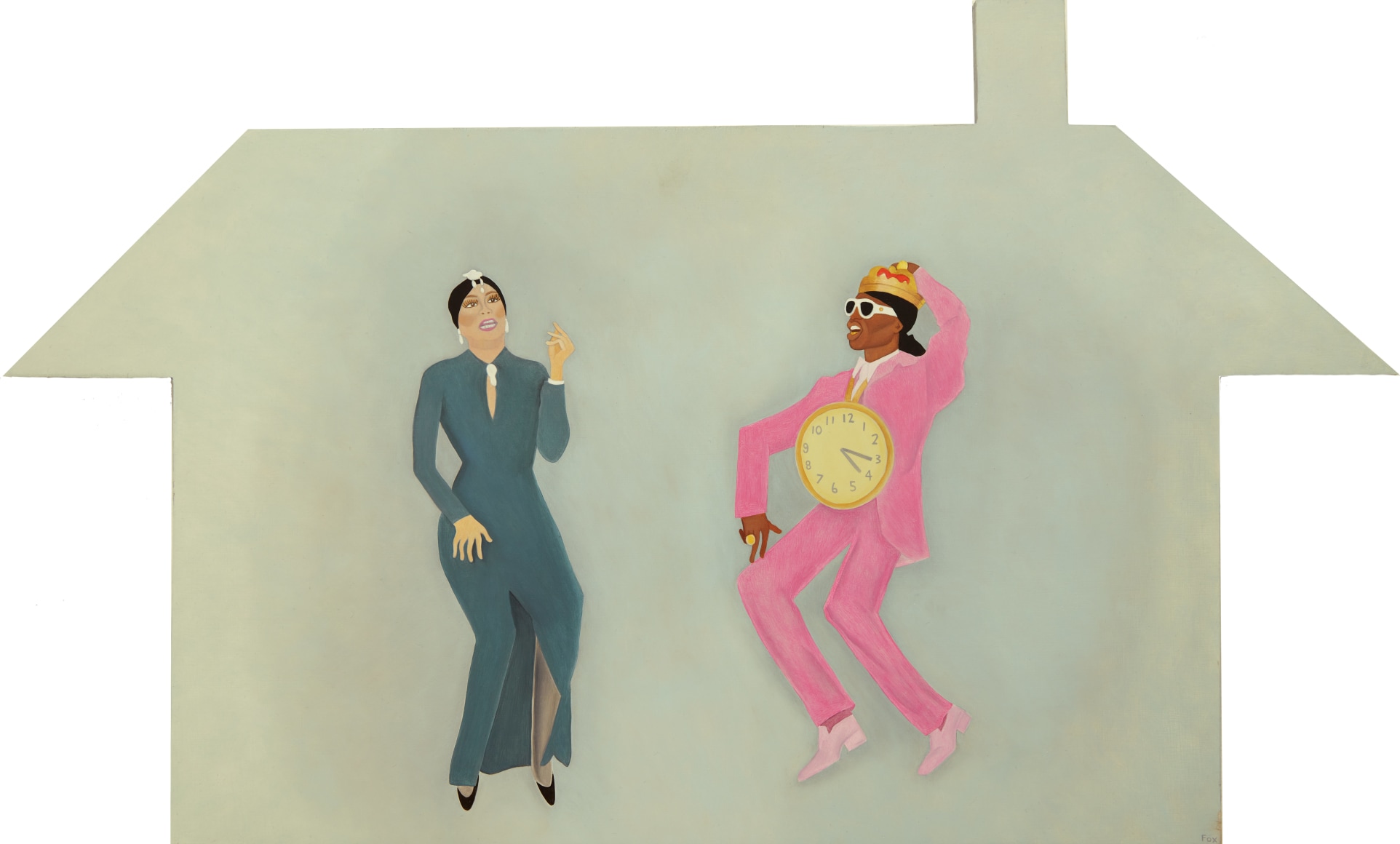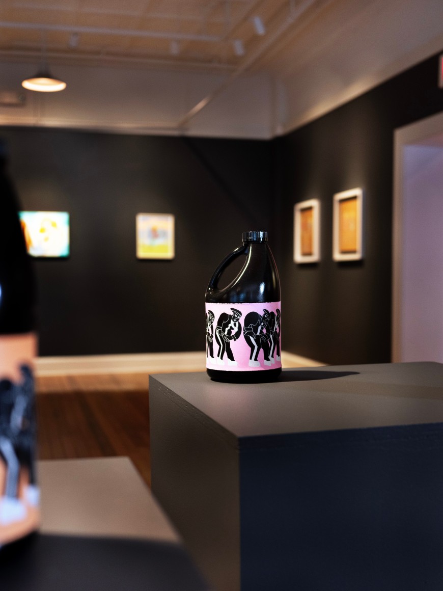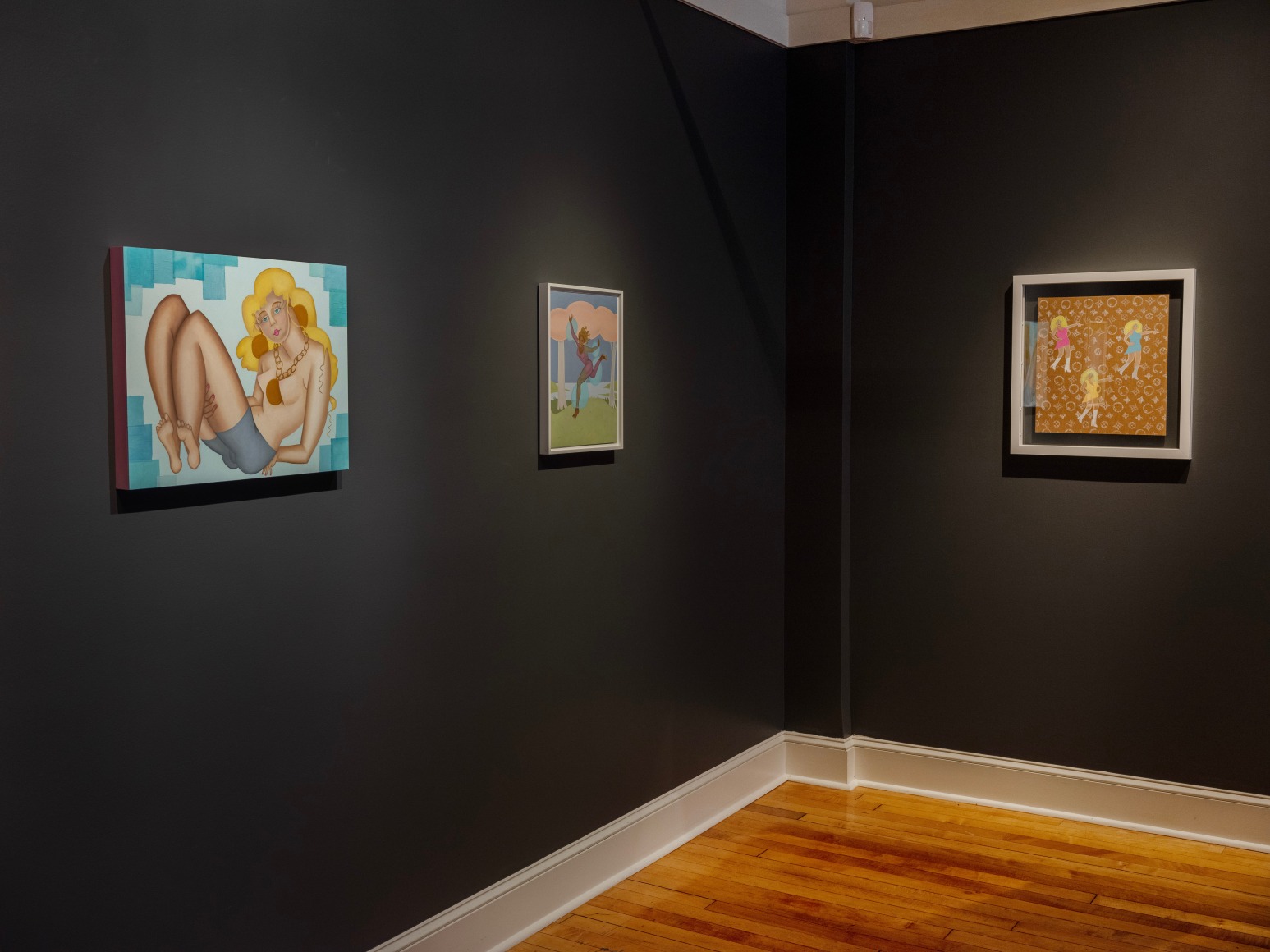 The cardboard pieces are a modern take on Bill Traylor’s folk art. In This Way the characters are pointing (a device in drag runway performance) to where they are walking toward. A place unseen, out of frame while swimming in a hand-printed zen (logo) mania of bubbles, a Louis Vuitton-esque homemade branding. The other, a character “Lil Paintsy” is reflecting on herself in a sea of paint brushes with paint drips, a Gucci-esque homemade branding.
