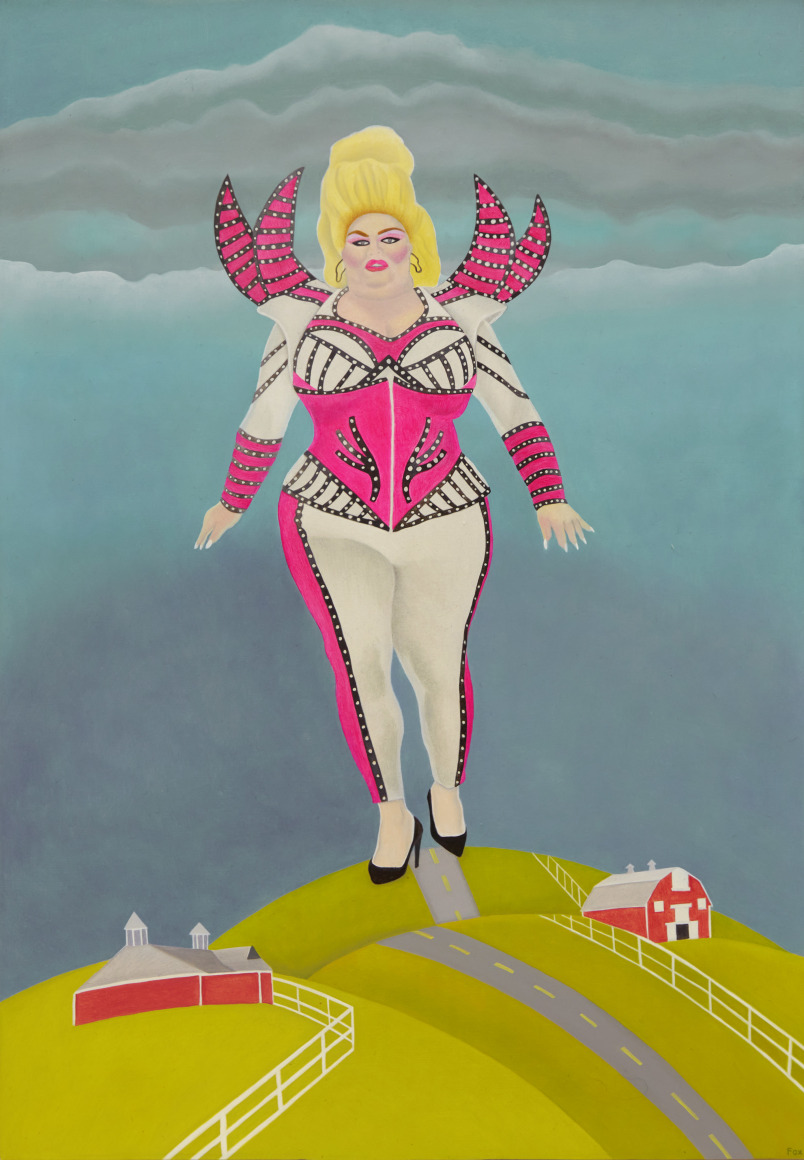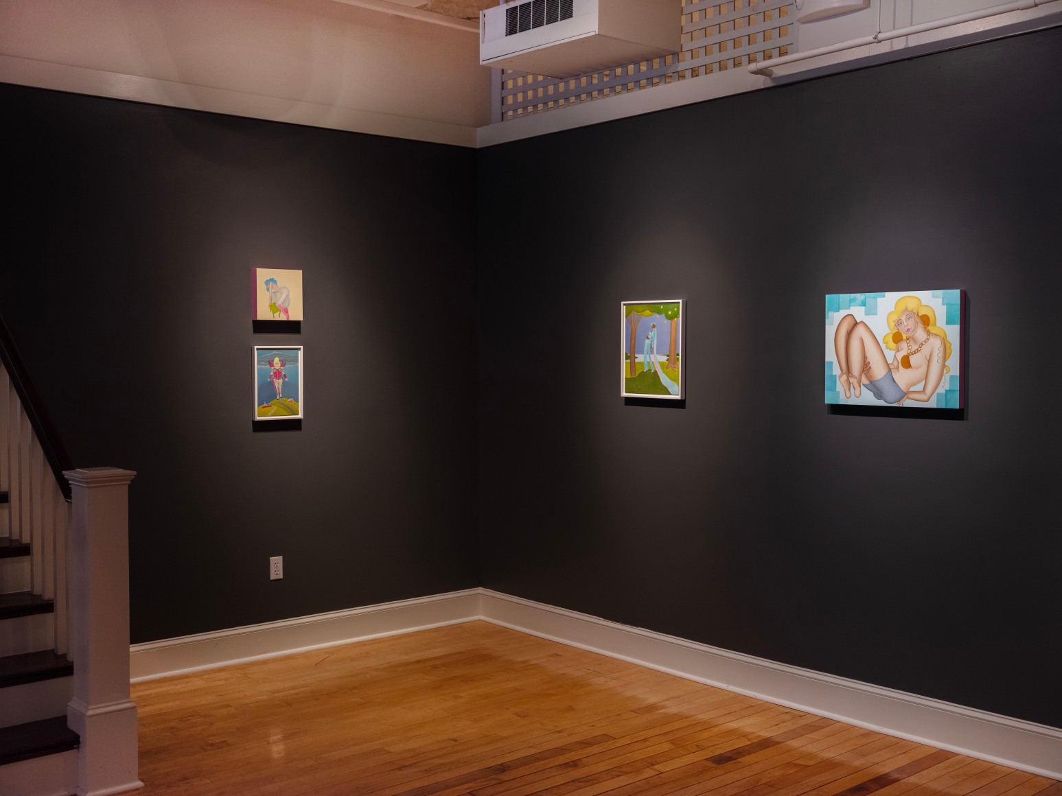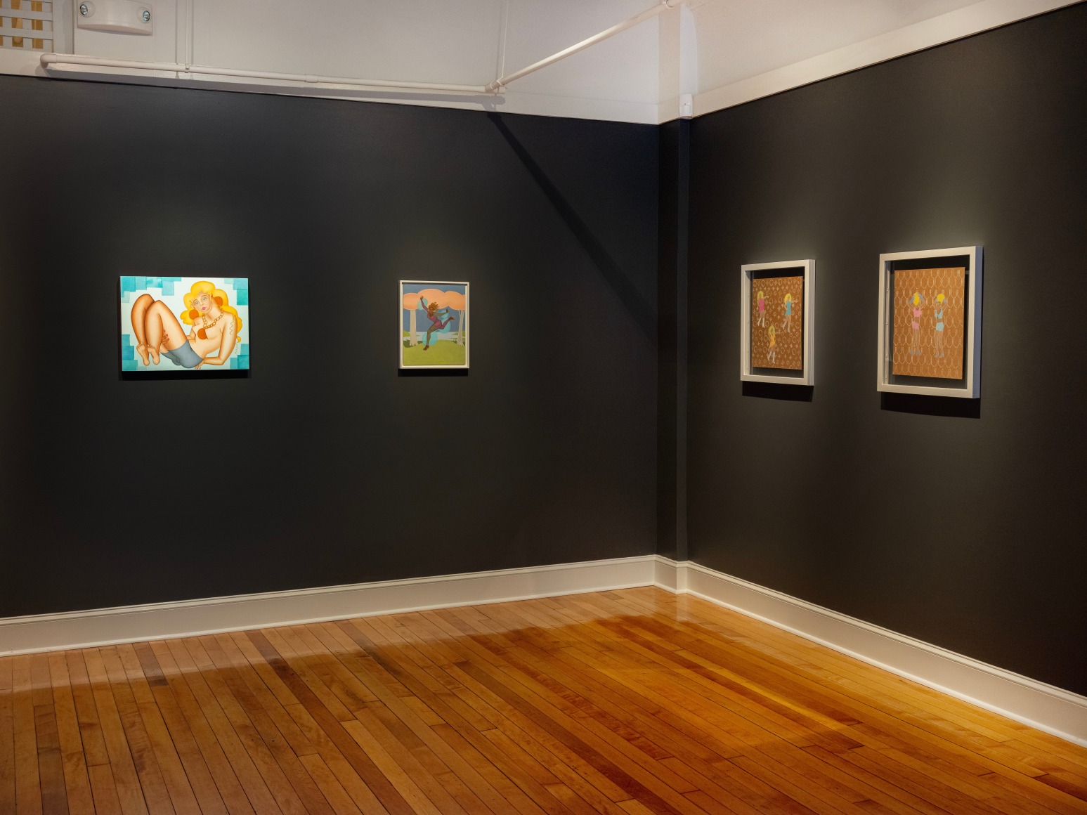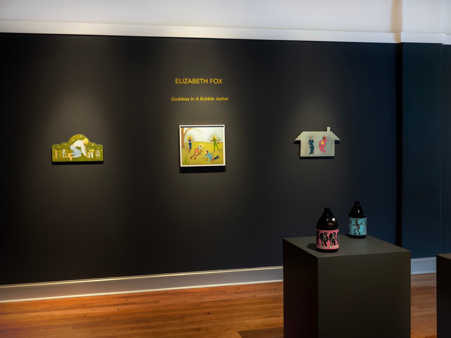 The exhibition Elizabeth Fox: Goddess In A Bubble Jacket presents new work by painter Elizabeth Fox, who lives in Standish, Maine. Fox is widely known for her carefully crafted paintings, whose tender colors and precisely drawn subjects belie their sly, dark humor. She works in an exacting, traditional method that connects her work to the early Renaissance masters. The pristine surfaces of her paintings are achieved by applying multiple thin layers of oil paint over a detailed black-and-white underpainting. Each layer is allowed to dry before adding the next, slowly building the image with each successive layer. Embracing “the beautiful and the mundane,” Fox’s meticulously constructed images reference Pop culture, art history, and the mysteries of everyday life. Populated by figures engaged in action and full of personality, her narratives are open-ended, allowing their interpretation to change over time. Each scene is caught in a frozen moment, a “cut” from a fantastical film of life. "By emphasizing the relationships between people, objects, color, and space, everyday scenes can become mysterious, funny, or strange,” she says.