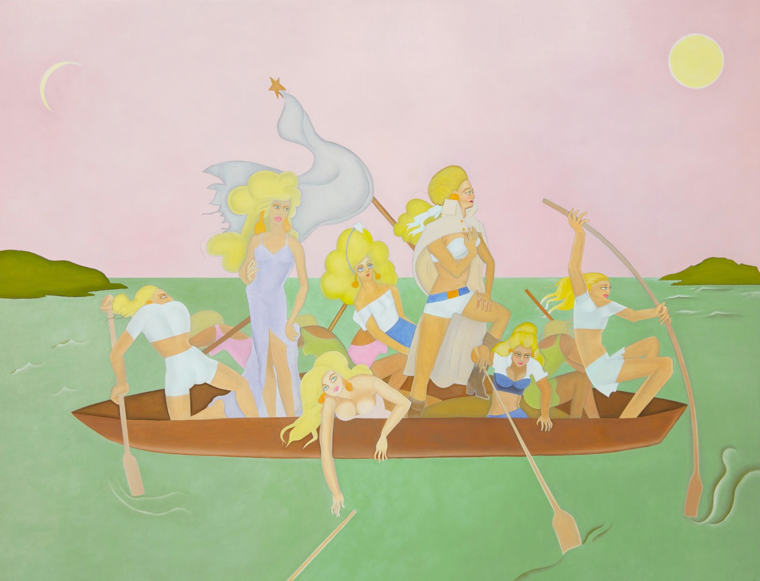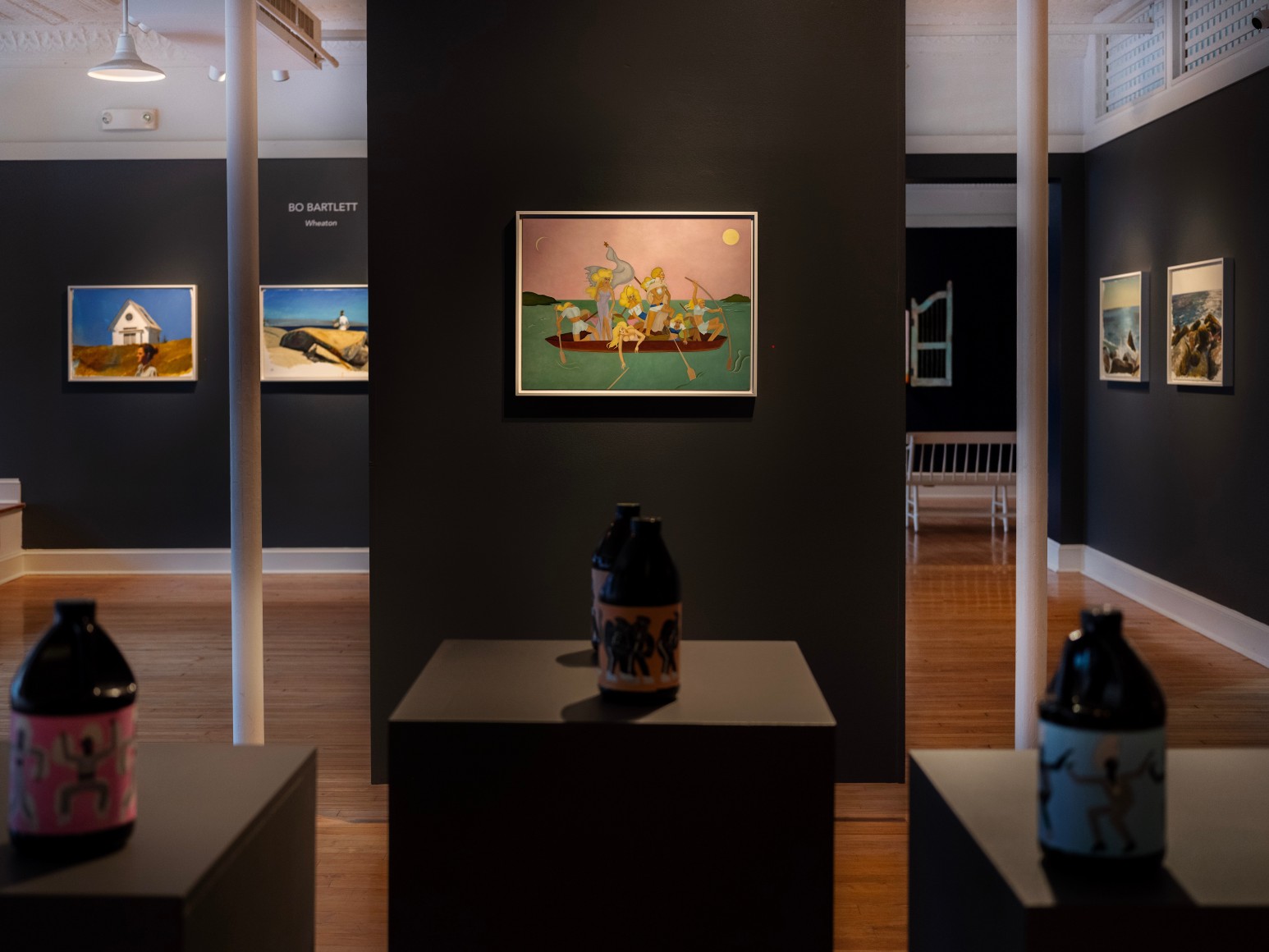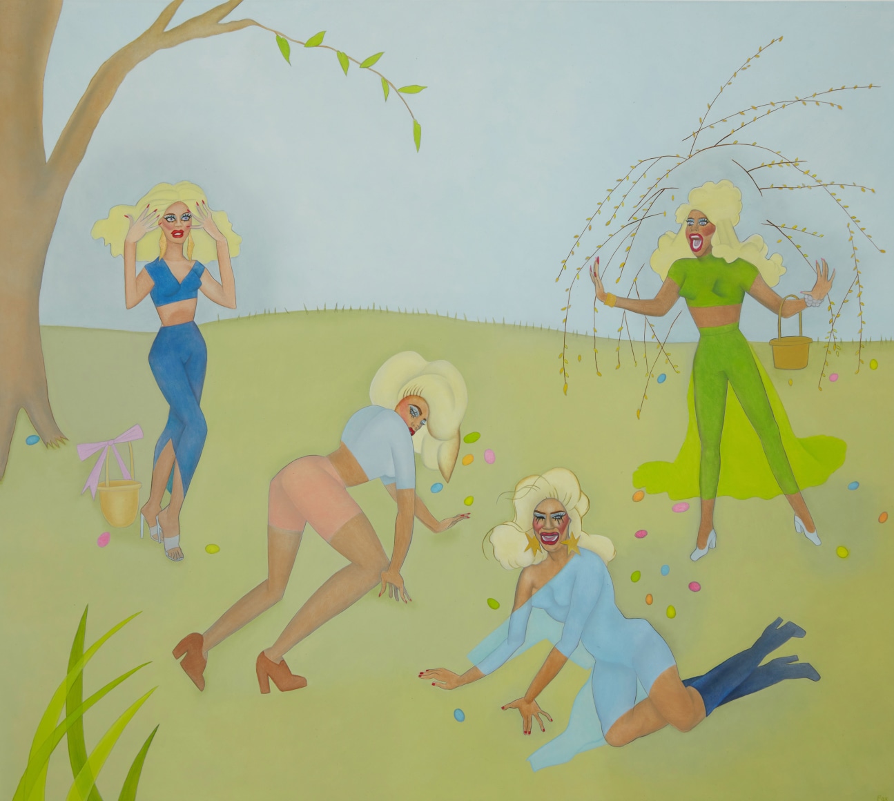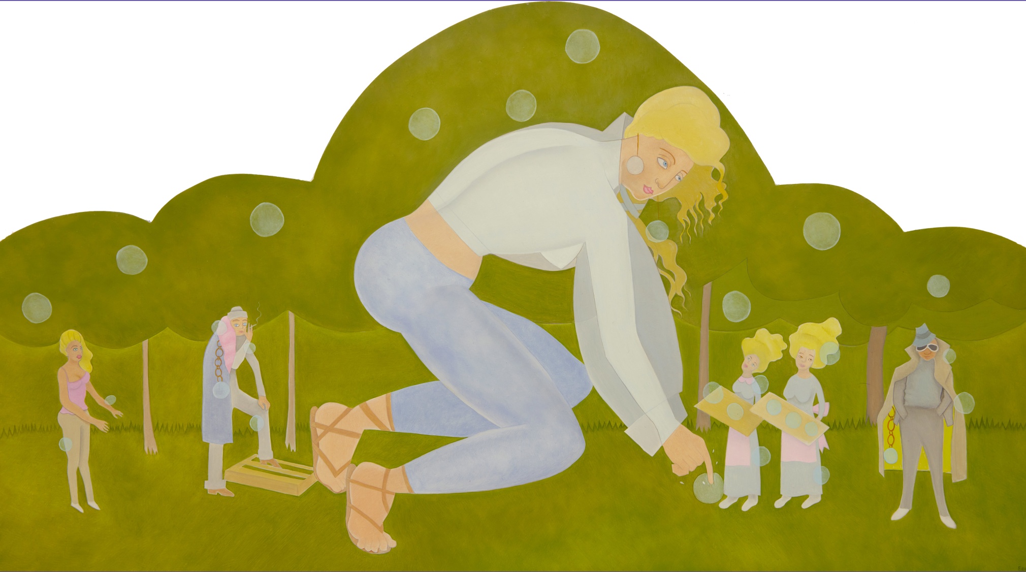 The exhibition Elizabeth Fox: Goddess In A Bubble Jacket presents new work by painter Elizabeth Fox, who lives in Standish, Maine. Fox is widely known for her carefully crafted paintings, whose tender colors and precisely drawn subjects belie their sly, dark humor. She works in an exacting, traditional method that connects her work to the early Renaissance masters. The pristine surfaces of her paintings are achieved by applying multiple thin layers of oil paint over a detailed black-and-white underpainting. Each layer is allowed to dry before adding the next, slowly building the image with each successive layer. Embracing “the beautiful and the mundane,” Fox’s meticulously constructed images reference Pop culture, art history, and the mysteries of everyday life. Populated by figures engaged in action and full of personality, her narratives are open-ended, allowing their interpretation to change over time. Each scene is caught in a frozen moment, a “cut” from a fantastical film of life. "By emphasizing the relationships between people, objects, color, and space, everyday scenes can become mysterious, funny, or strange,” she says.