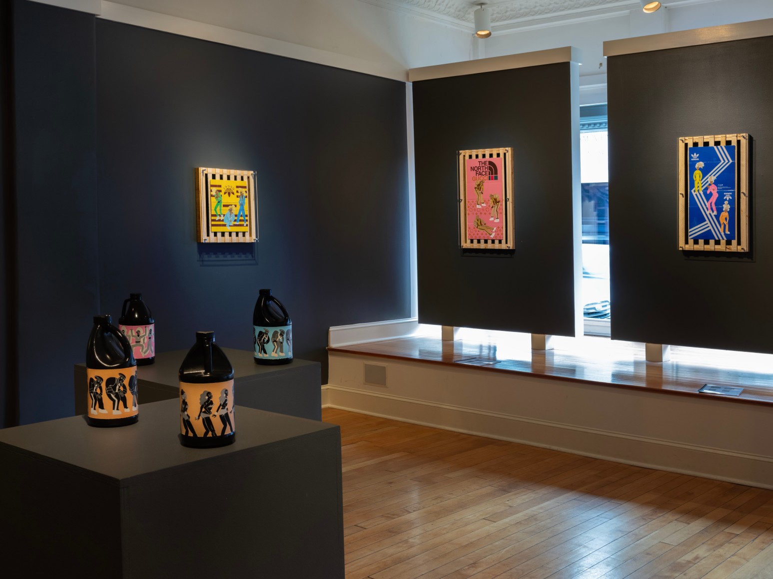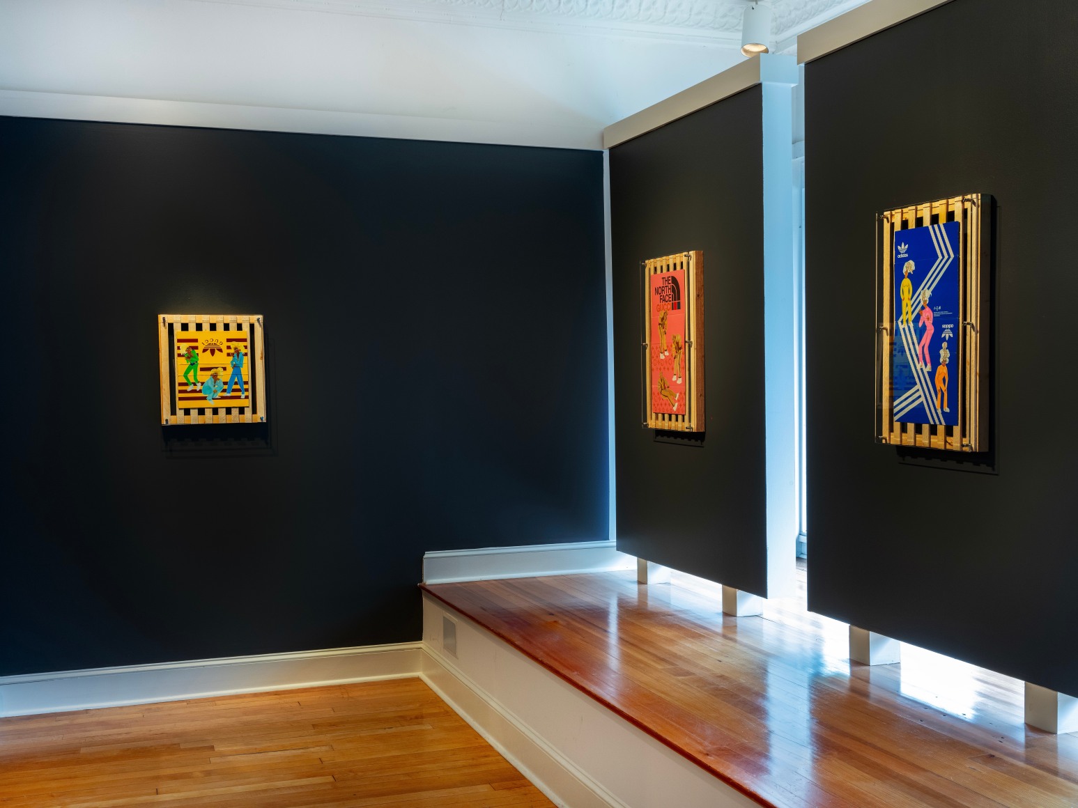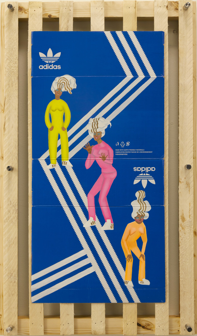 The 3 shoe box paintings mix folk, merchandising and streetwear. Depicting hip-hop fashion and bad-ass poses to bring you power and freedom. They are painted on collaborative logo shoe boxes acting as a fashion backdrop to the characters. One has several portrayals of Jam Master Jay from Run DMC and others have hip-hop poses from early male groups but with women instead of men. The Jam Master Jay collection has a field of self styled hand printed zen (logo) mania (a nod to Dapper Dan) on which the characters stand. Framed on shipping pallets made to scale and showcased with display case plexiglass.