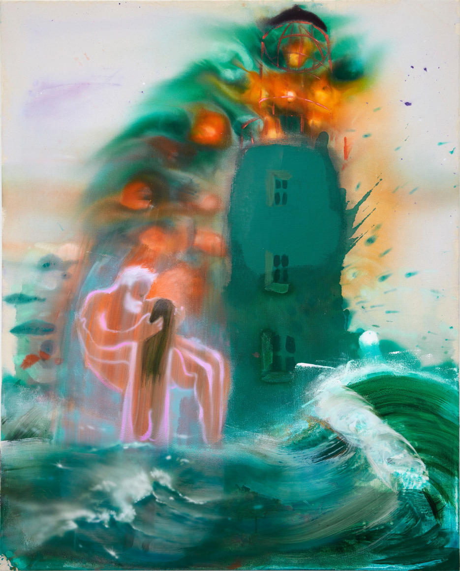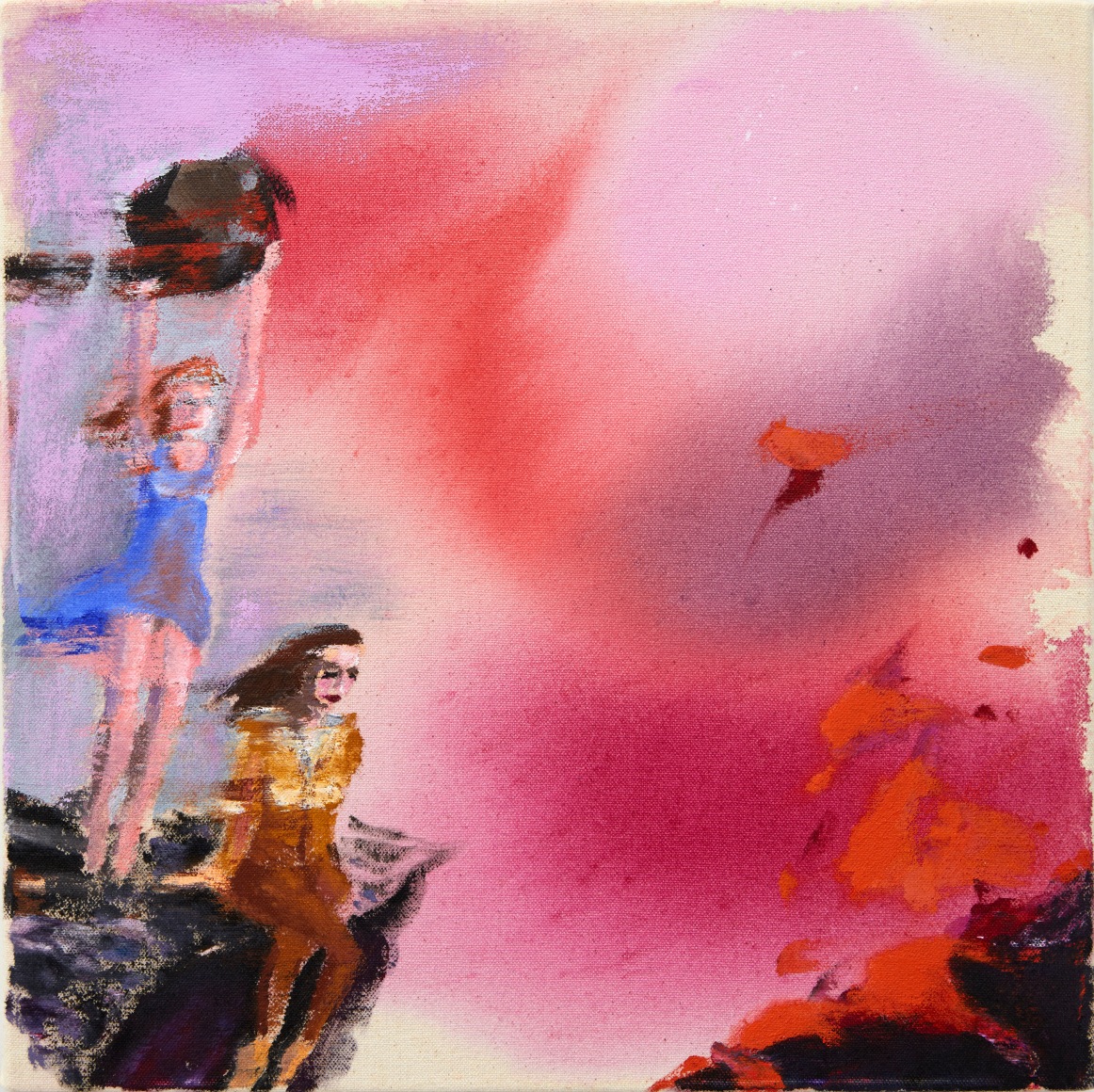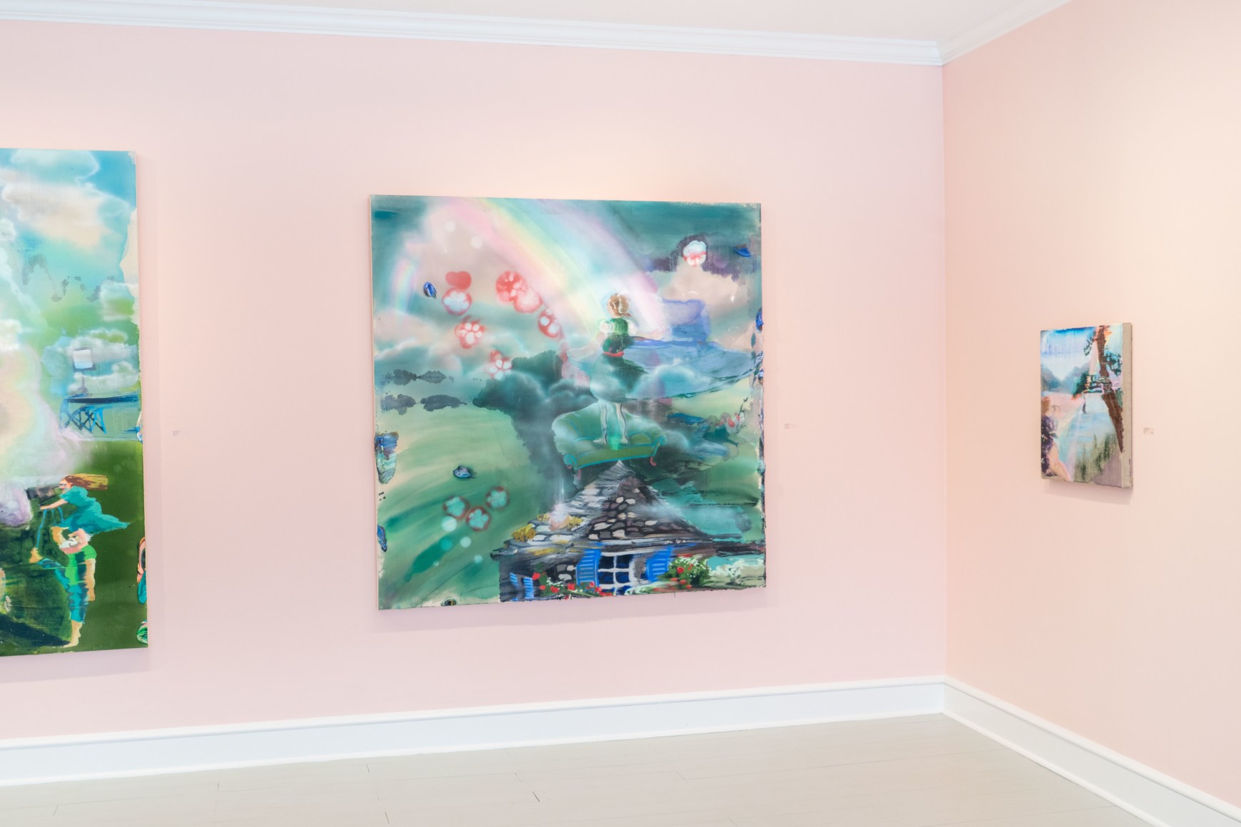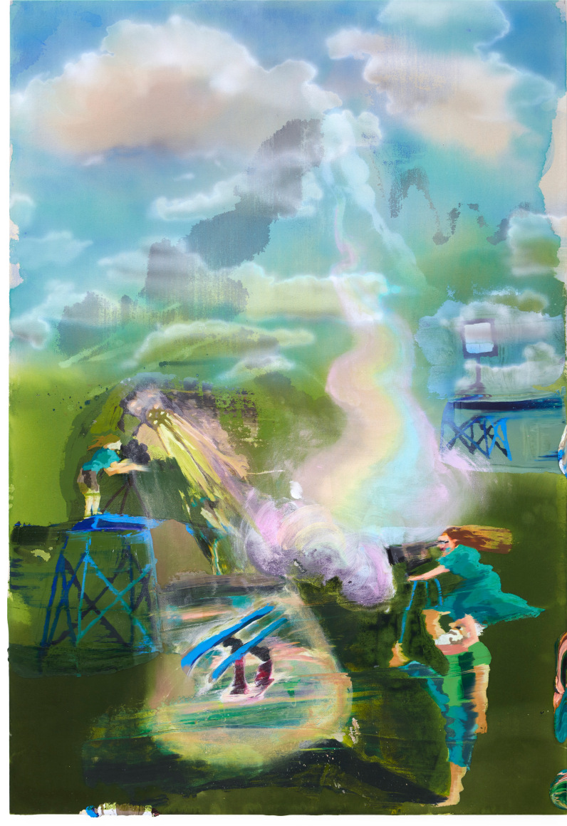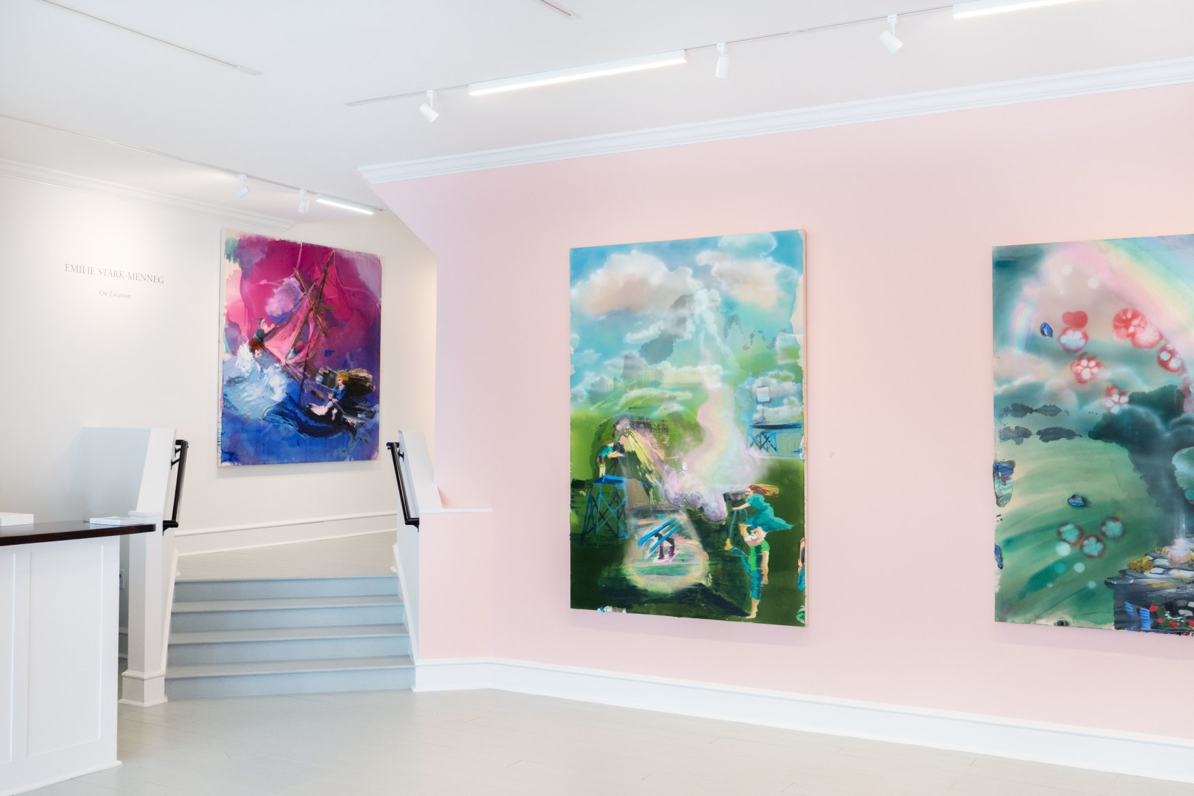 A throughline informing the works in the exhibition is Stark-Menneg’s extensive background in performance, video, and film. In the studio, she uses paint to set the scene for imagined “site-specific stunts.” For example, in the title painting On Location, she was “thinking about filmmakers Alejandro Jodorowsky, Agnes Varda, and Werner Herzog, and how far they would go to get the shot.” Another work, Take Us With You, references the final scene in Fellini’s 8 ½ where the band marches onto the set of the spaceship. “Cinematic moments often appear as mirages in these paintings,” says Stark-Menneg, “recalling how the imagination flows over our perception of the world.”