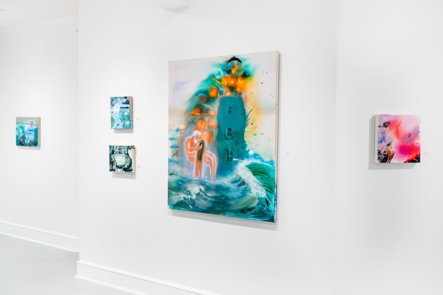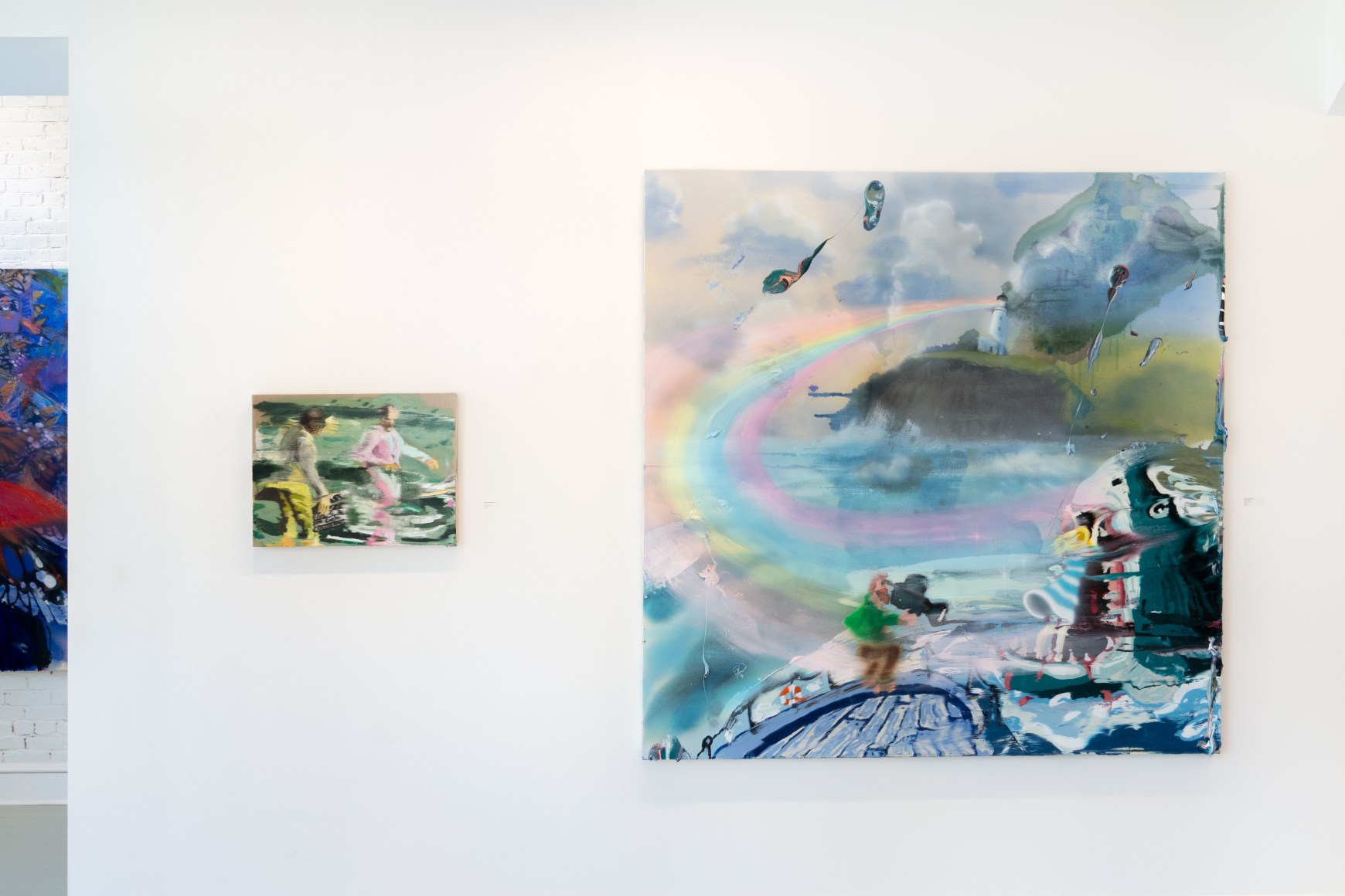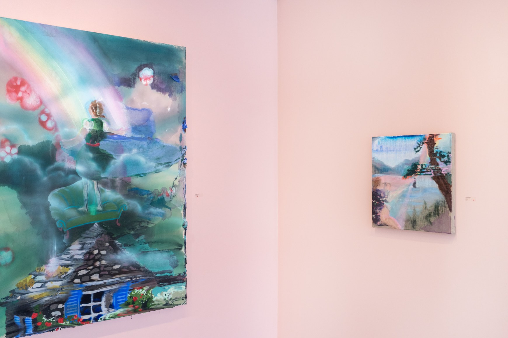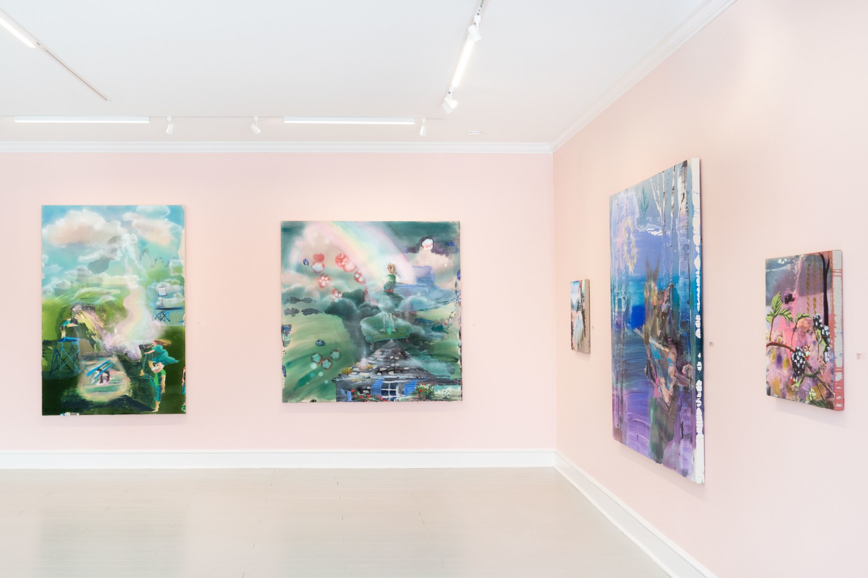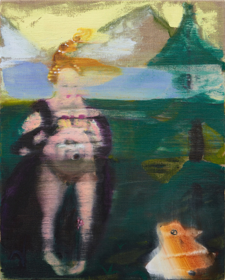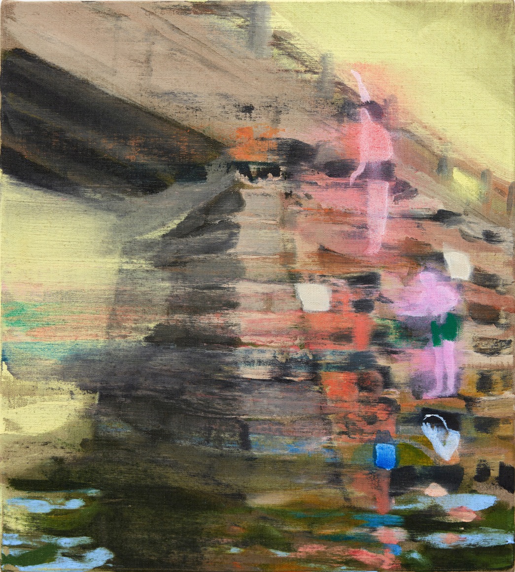 A throughline informing the works in the exhibition is Stark-Menneg’s extensive background in performance, video, and film. In the studio, she uses paint to set the scene for imagined “site-specific stunts.” For example, in the title painting On Location, she was “thinking about filmmakers Alejandro Jodorowsky, Agnes Varda, and Werner Herzog, and how far they would go to get the shot.” Another work, Take Us With You, references the final scene in Fellini’s 8 ½ where the band marches onto the set of the spaceship. “Cinematic moments often appear as mirages in these paintings,” says Stark-Menneg, “recalling how the imagination flows over our perception of the world.”