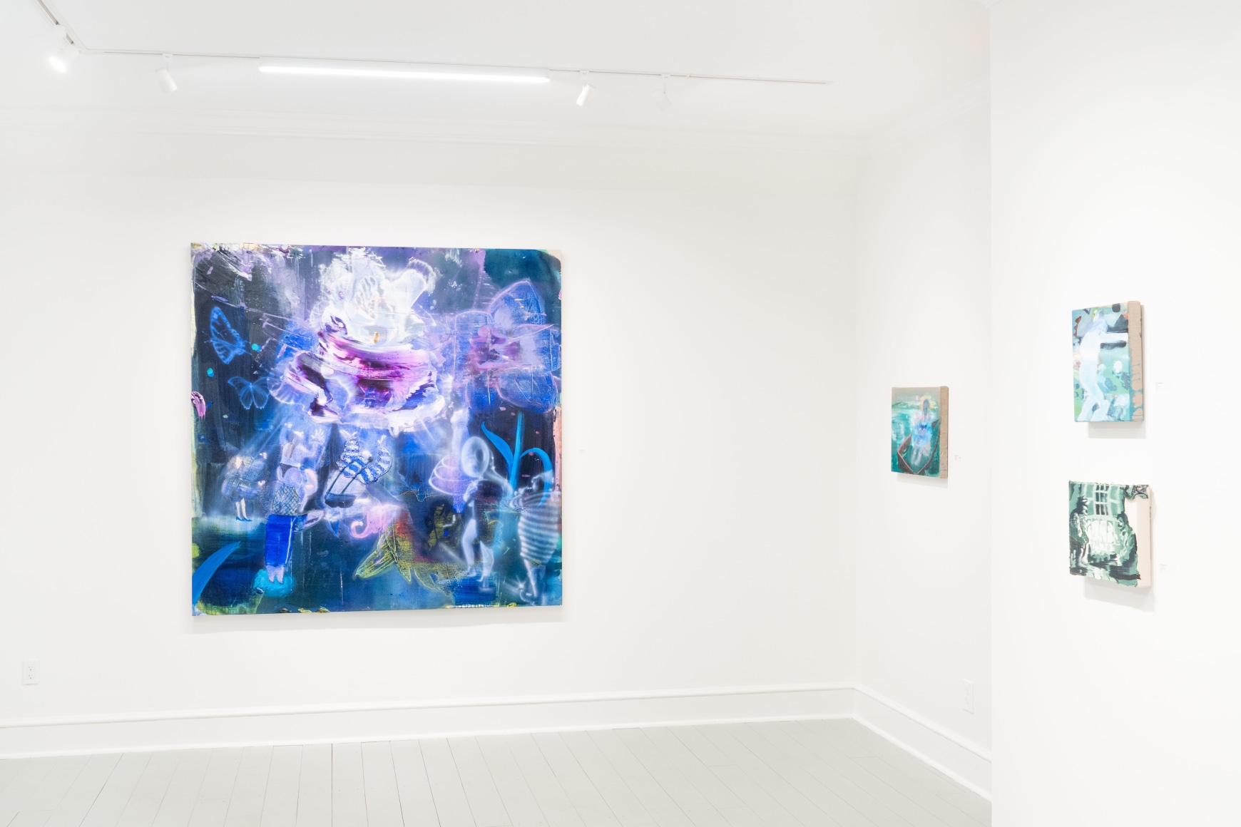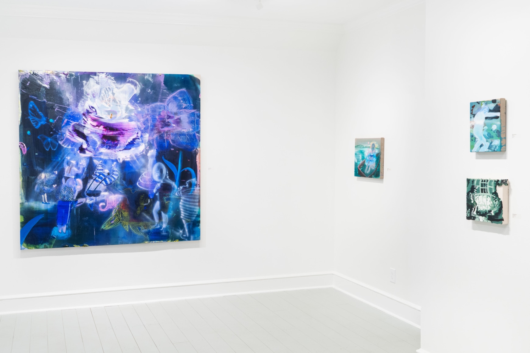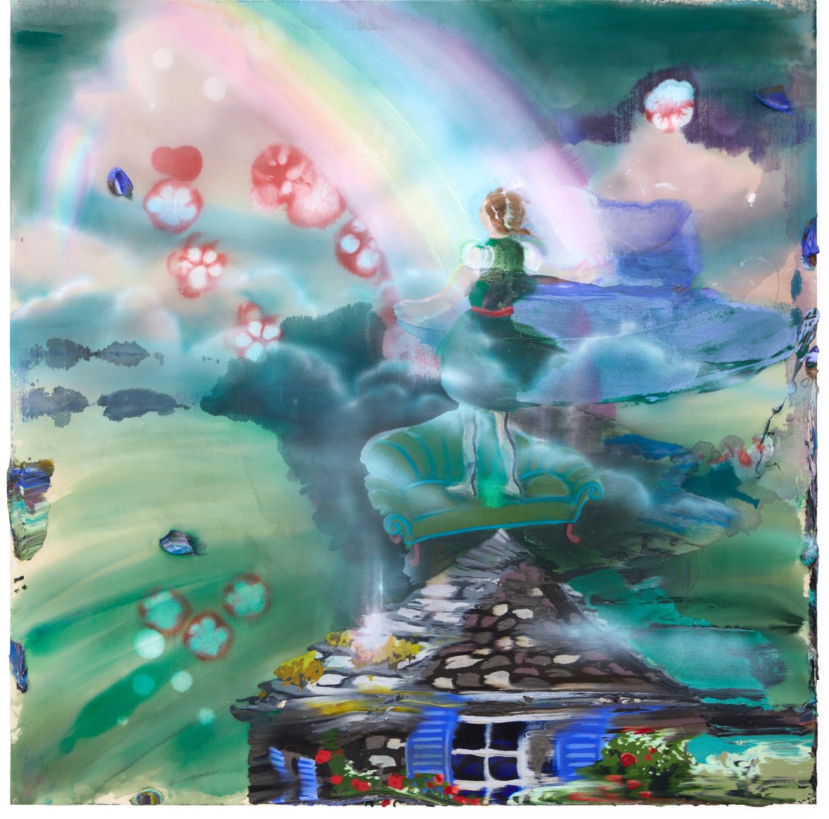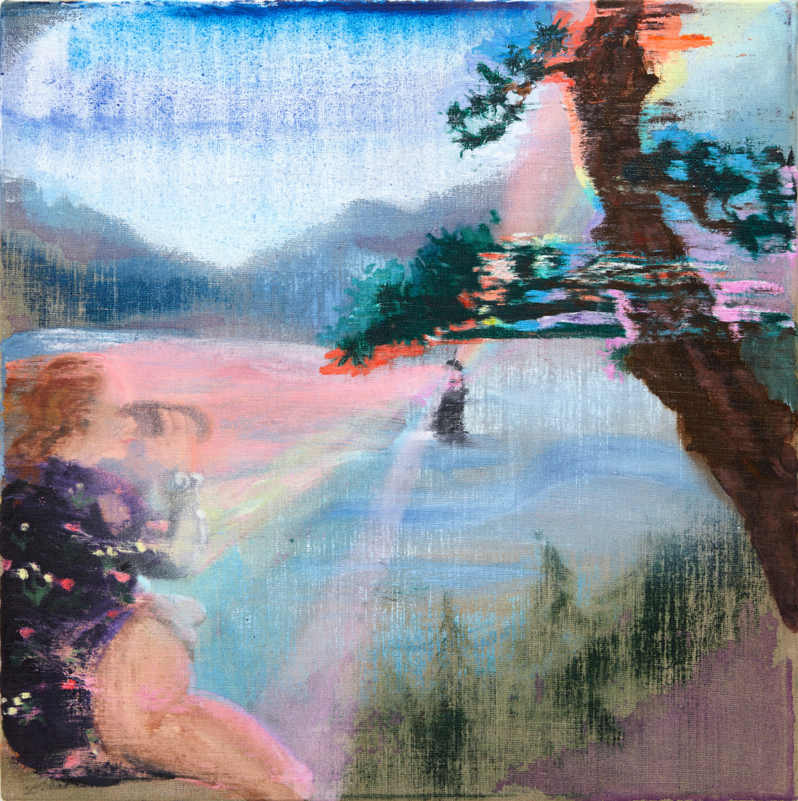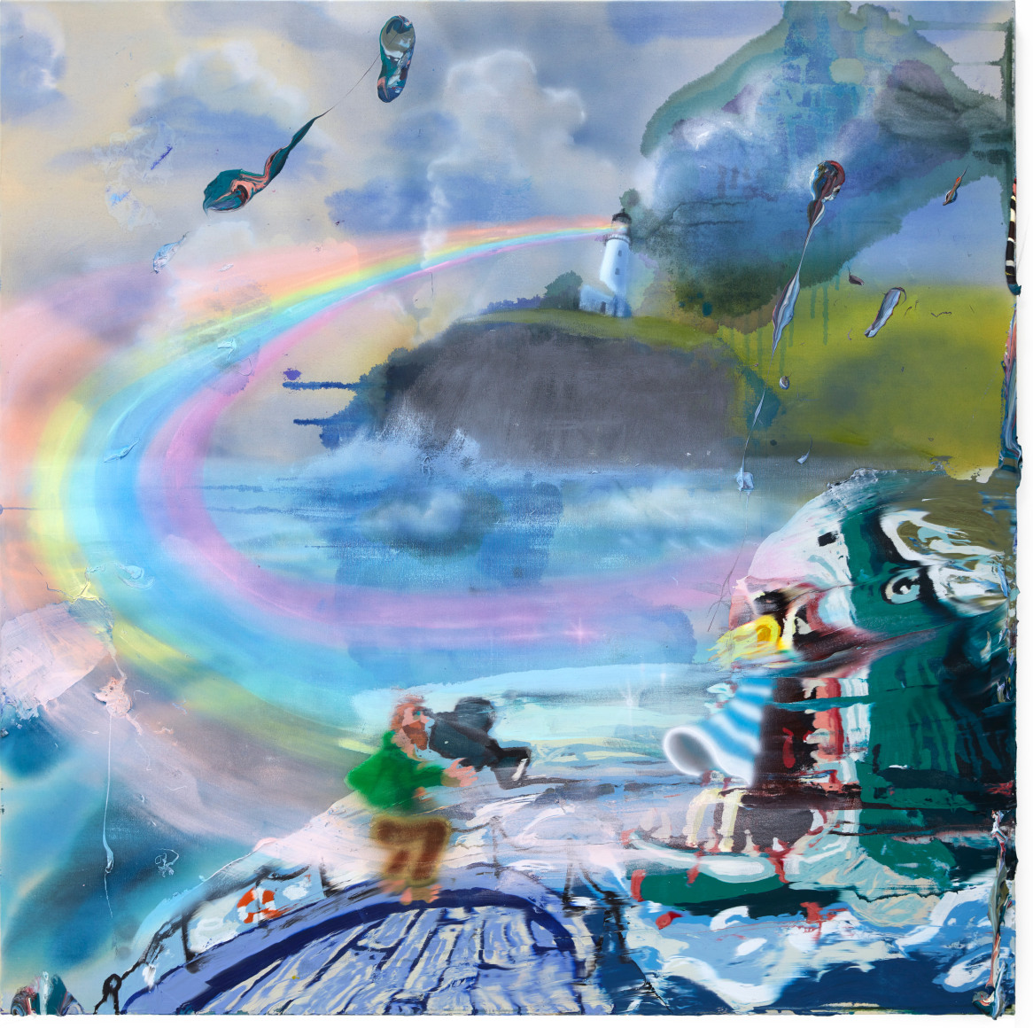 A throughline informing the works in the exhibition is Stark-Menneg’s extensive background in performance, video, and film. In the studio, she uses paint to set the scene for imagined “site-specific stunts.” For example, in the title painting On Location, she was “thinking about filmmakers Alejandro Jodorowsky, Agnes Varda, and Werner Herzog, and how far they would go to get the shot.” Another work, Take Us With You, references the final scene in Fellini’s 8 ½ where the band marches onto the set of the spaceship. “Cinematic moments often appear as mirages in these paintings,” says Stark-Menneg, “recalling how the imagination flows over our perception of the world.”