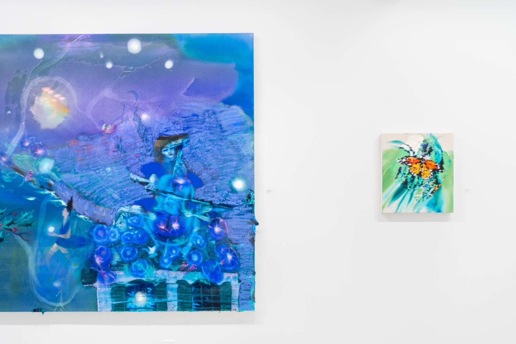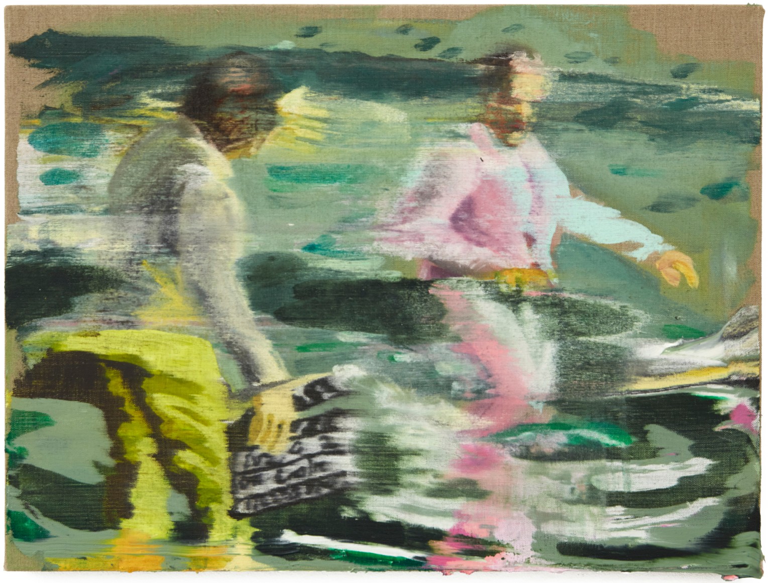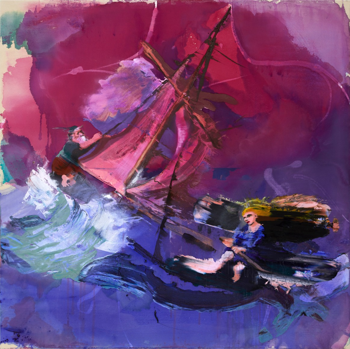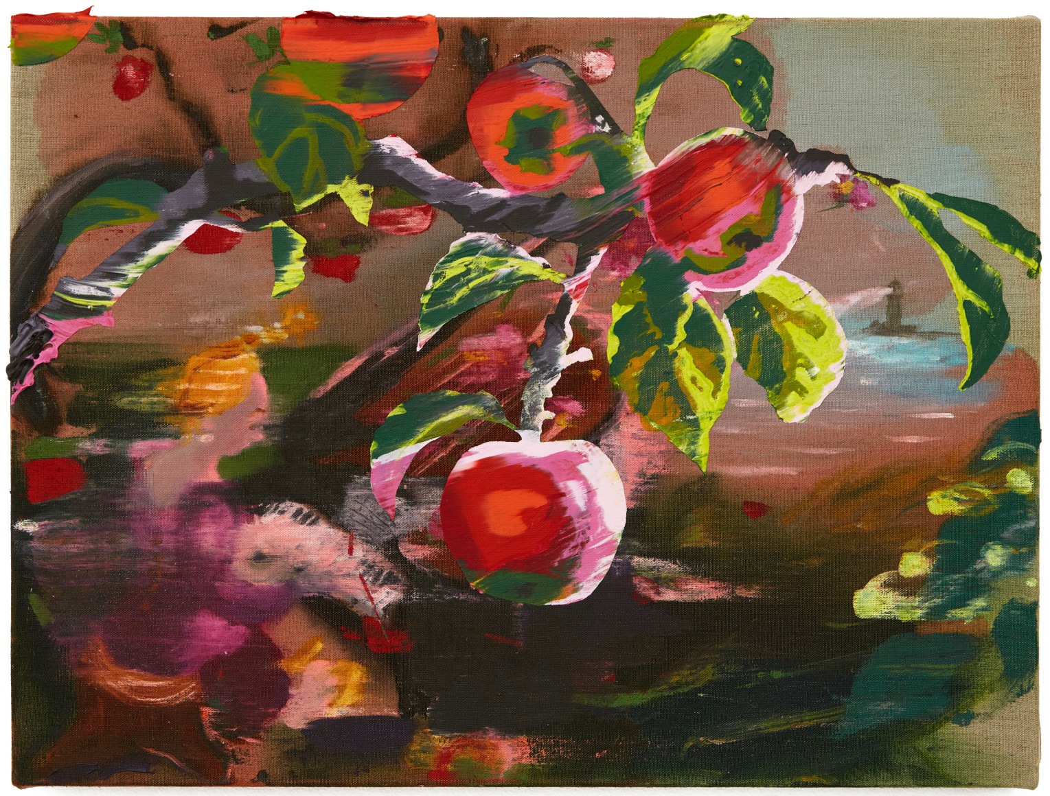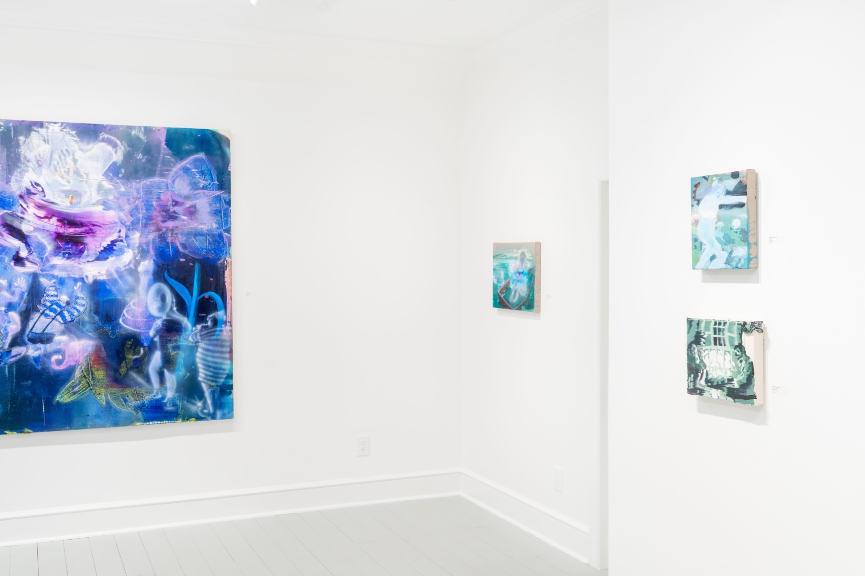 A throughline informing the works in the exhibition is Stark-Menneg’s extensive background in performance, video, and film. In the studio, she uses paint to set the scene for imagined “site-specific stunts.” For example, in the title painting On Location, she was “thinking about filmmakers Alejandro Jodorowsky, Agnes Varda, and Werner Herzog, and how far they would go to get the shot.” Another work, Take Us With You, references the final scene in Fellini’s 8 ½ where the band marches onto the set of the spaceship. “Cinematic moments often appear as mirages in these paintings,” says Stark-Menneg, “recalling how the imagination flows over our perception of the world.”