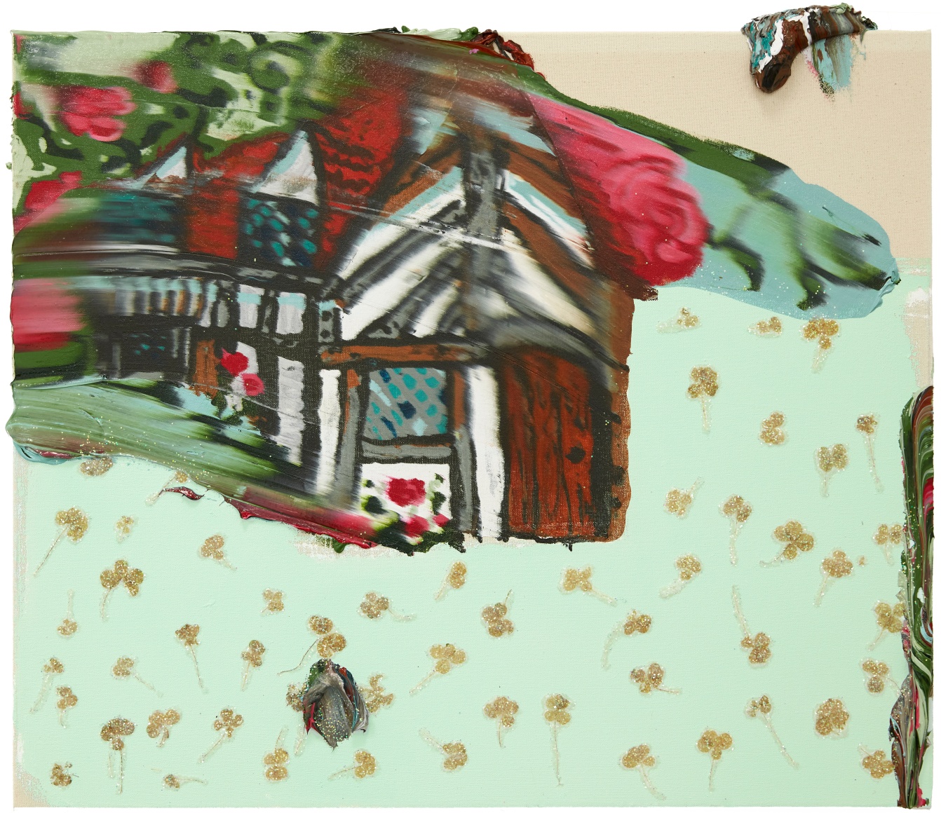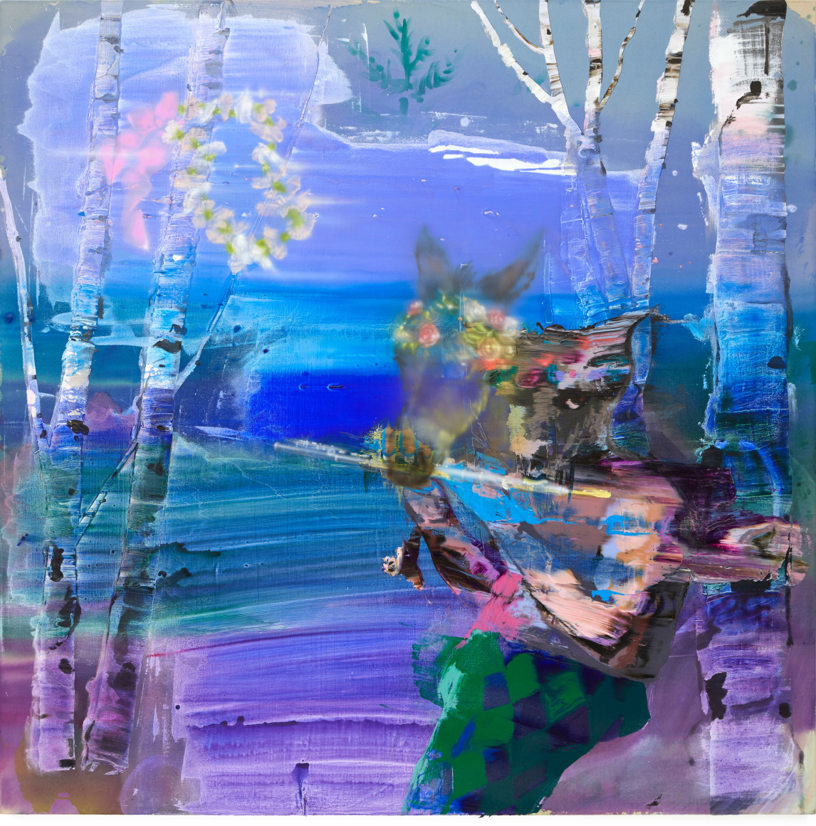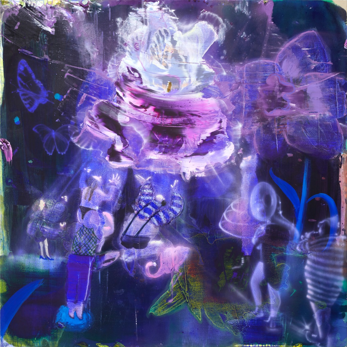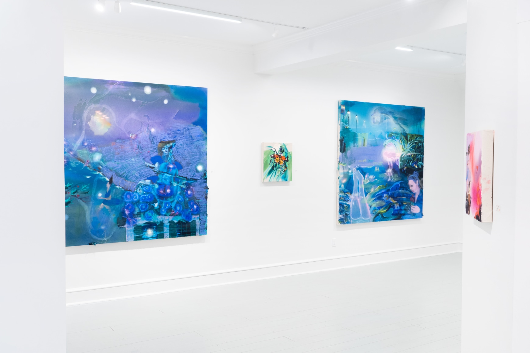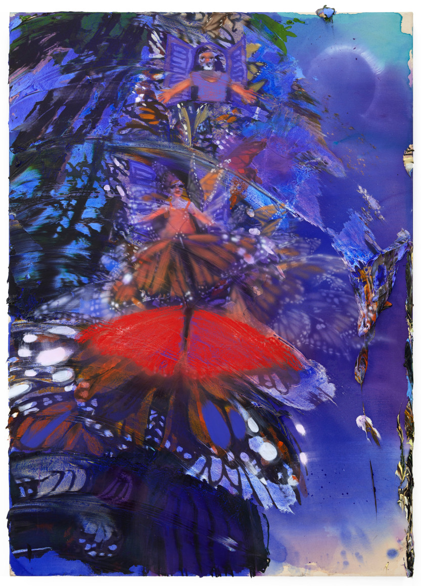 A throughline informing the works in the exhibition is Stark-Menneg’s extensive background in performance, video, and film. In the studio, she uses paint to set the scene for imagined “site-specific stunts.” For example, in the title painting On Location, she was “thinking about filmmakers Alejandro Jodorowsky, Agnes Varda, and Werner Herzog, and how far they would go to get the shot.” Another work, Take Us With You, references the final scene in Fellini’s 8 ½ where the band marches onto the set of the spaceship. “Cinematic moments often appear as mirages in these paintings,” says Stark-Menneg, “recalling how the imagination flows over our perception of the world.”