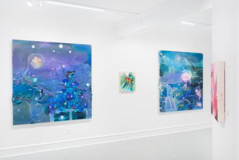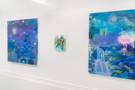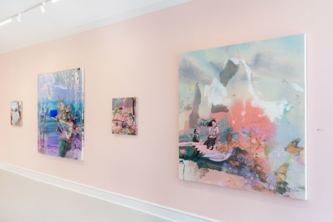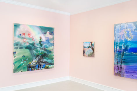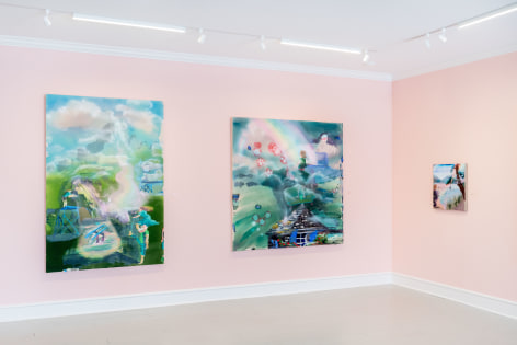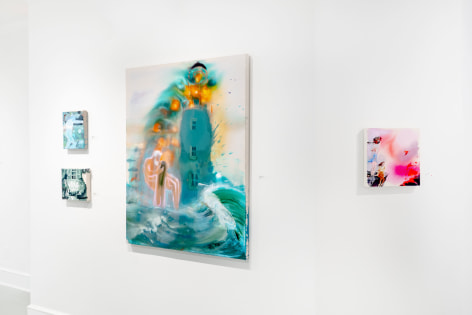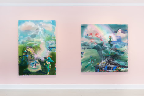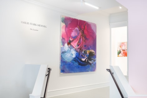 A throughline informing the works in the exhibition is Stark-Menneg’s extensive background in performance, video, and film. In the studio, she uses paint to set the scene for imagined “site-specific stunts.” For example, in the title painting On Location, she was “thinking about filmmakers Alejandro Jodorowsky, Agnes Varda, and Werner Herzog, and how far they would go to get the shot.” Another work, Take Us With You, references the final scene in Fellini’s 8 ½ where the band marches onto the set of the spaceship. “Cinematic moments often appear as mirages in these paintings,” says Stark-Menneg, “recalling how the imagination flows over our perception of the world.”