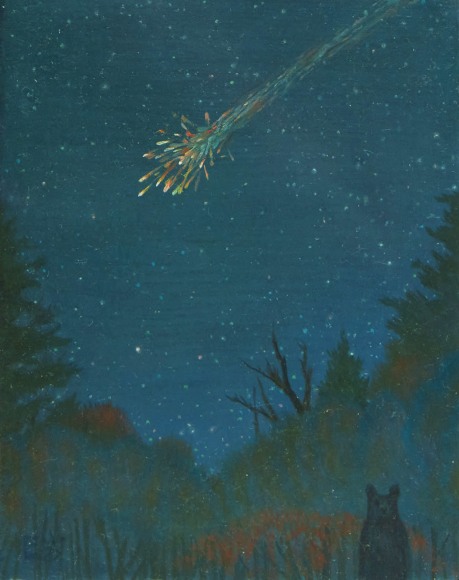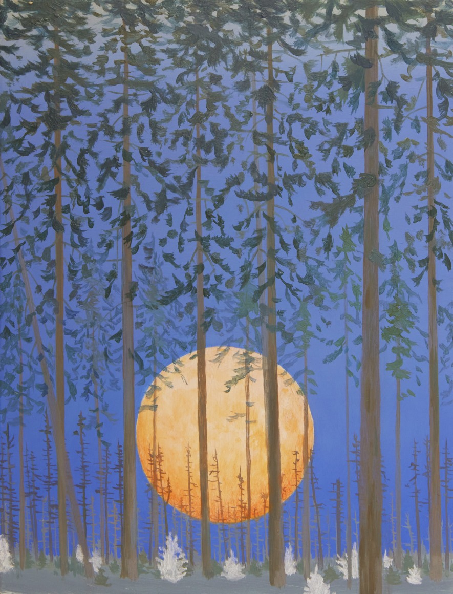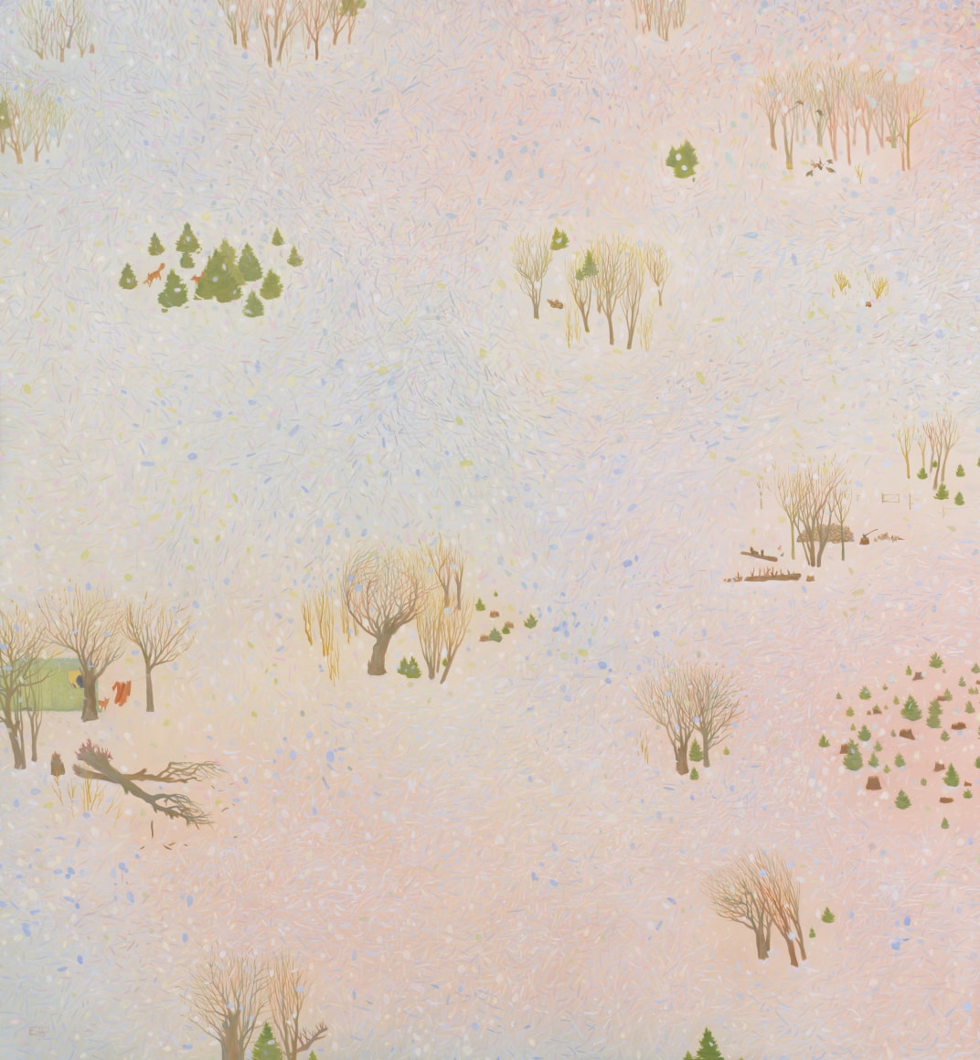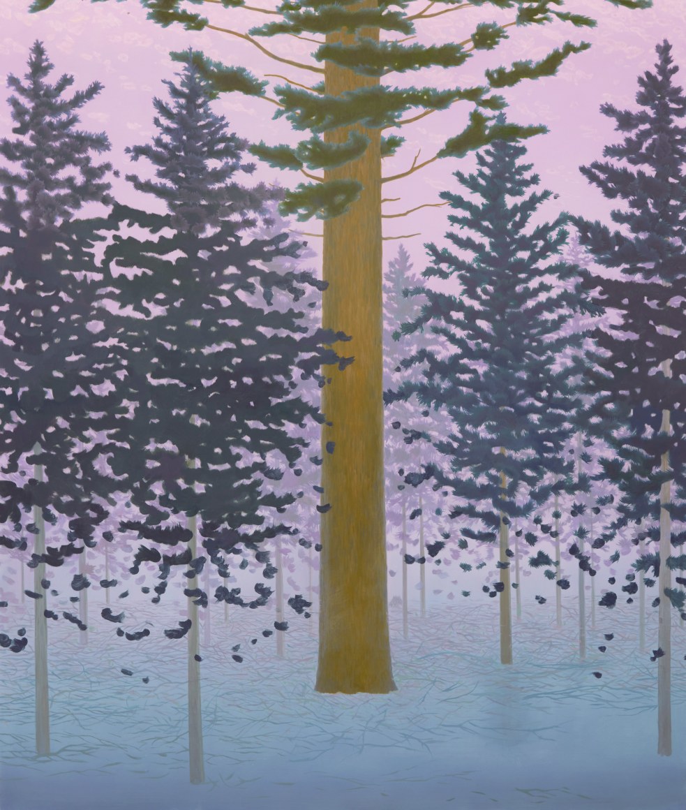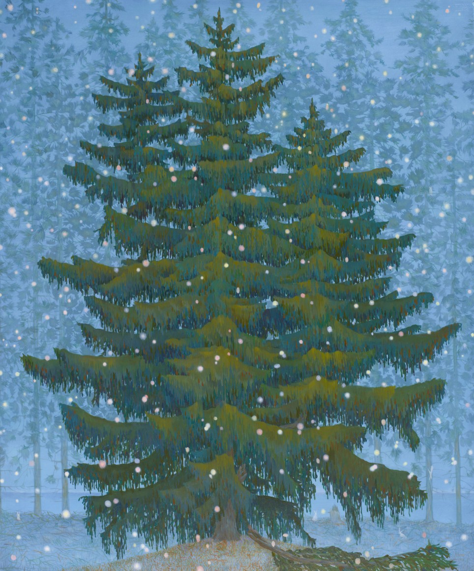 Erik Weisenburger paints the natural world as a place of mystery and beauty. His precisely crafted images resonate with intricate detail and a sense of wonder, reflecting his interests in folk tales, myths, and history. His exquisitely rendered scenes are created using a painting method developed by the early Northern European masters that imparts an internal glow to the finished compositions. After preparing a wood panel with layers of gesso and sanding it smooth, the subject is sketched in, and the image is built up through multiple layers of thinned oil paint and varnish to achieve a satiny, lustrous finish. Weisenburger has said this method "best allows me to explore and interpret the mingling of memories, monuments, permanence, and impermanence." A recent painting, Red Shirt, is a pastel-hued landscape, sparsely populated by bare-limbed trees and tiny conifers. A hush falls over the vast space, the only human presence appearing in the lone cabin with laundry on the line. In Weisenburger’s painted world, nature persists in its timeless splendor.