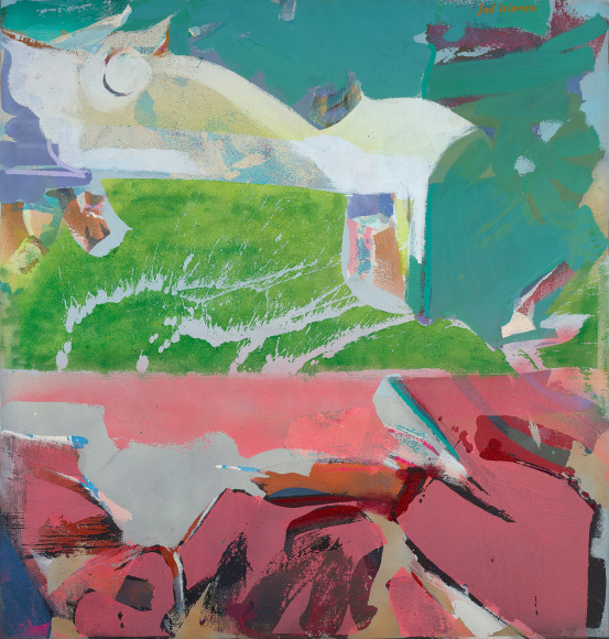 Solomon creates depth through layering acrylic and aerosol enamel. His paintings Flightfancy, 1979 and Spar, 1973 are featured in this exhibition. These pieces, from a bit later in his career, lean more graphic and with brighter colors. Solomon was recognized as one of the first artists to use acrylic paint, experimenting with the new medium in many ways. He was also one of the first artists to use aerosol sprays and combine them with resists. He has multiple layered gestures on the canvas with larger sections of flat tones on top, creating vantage points that push visually in and out of the works.
