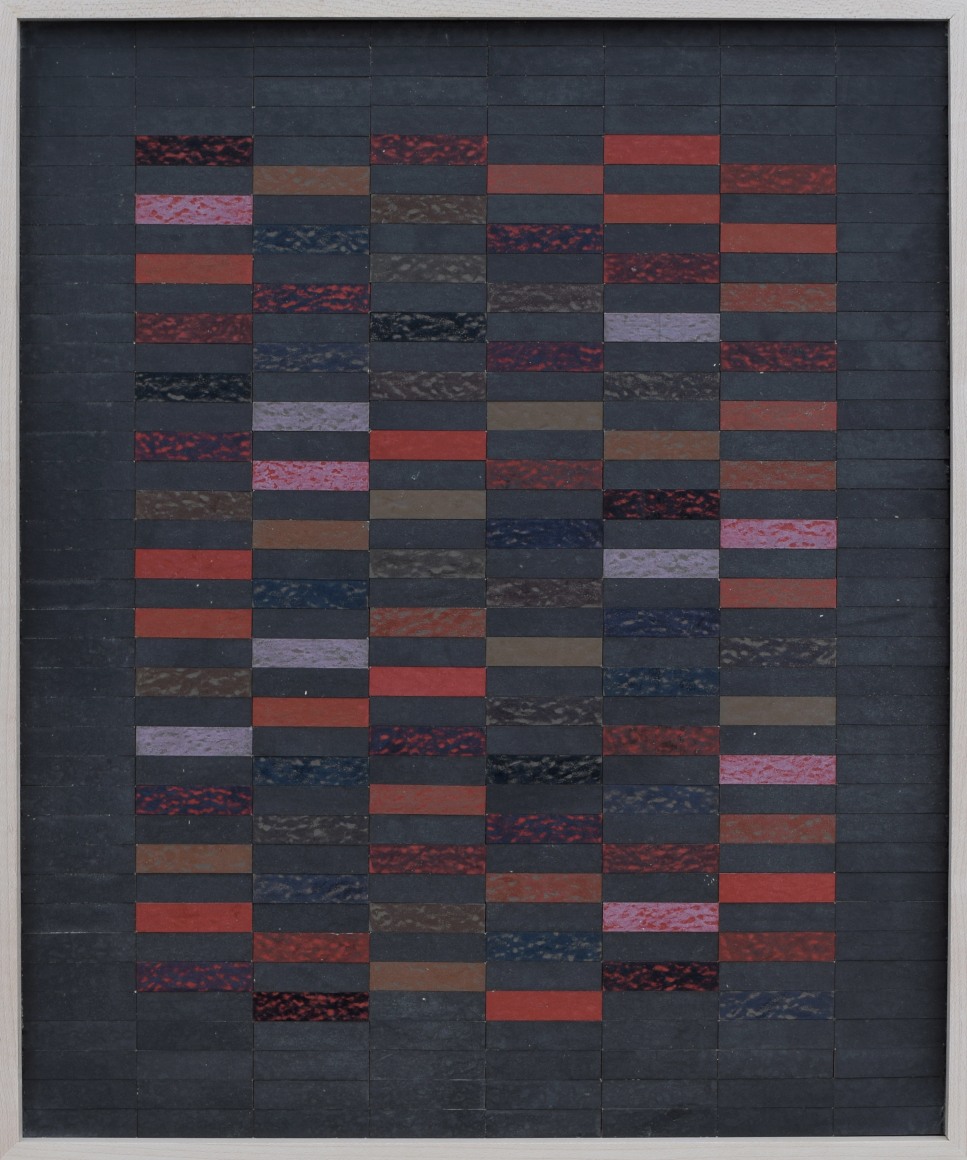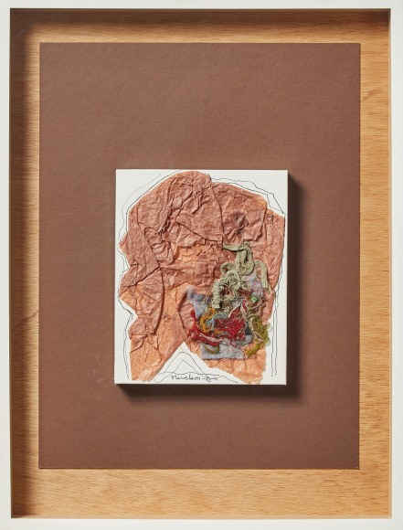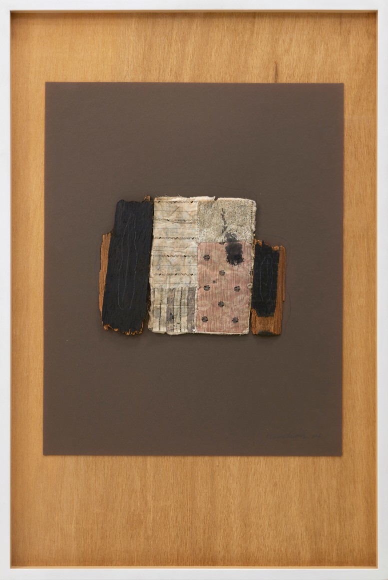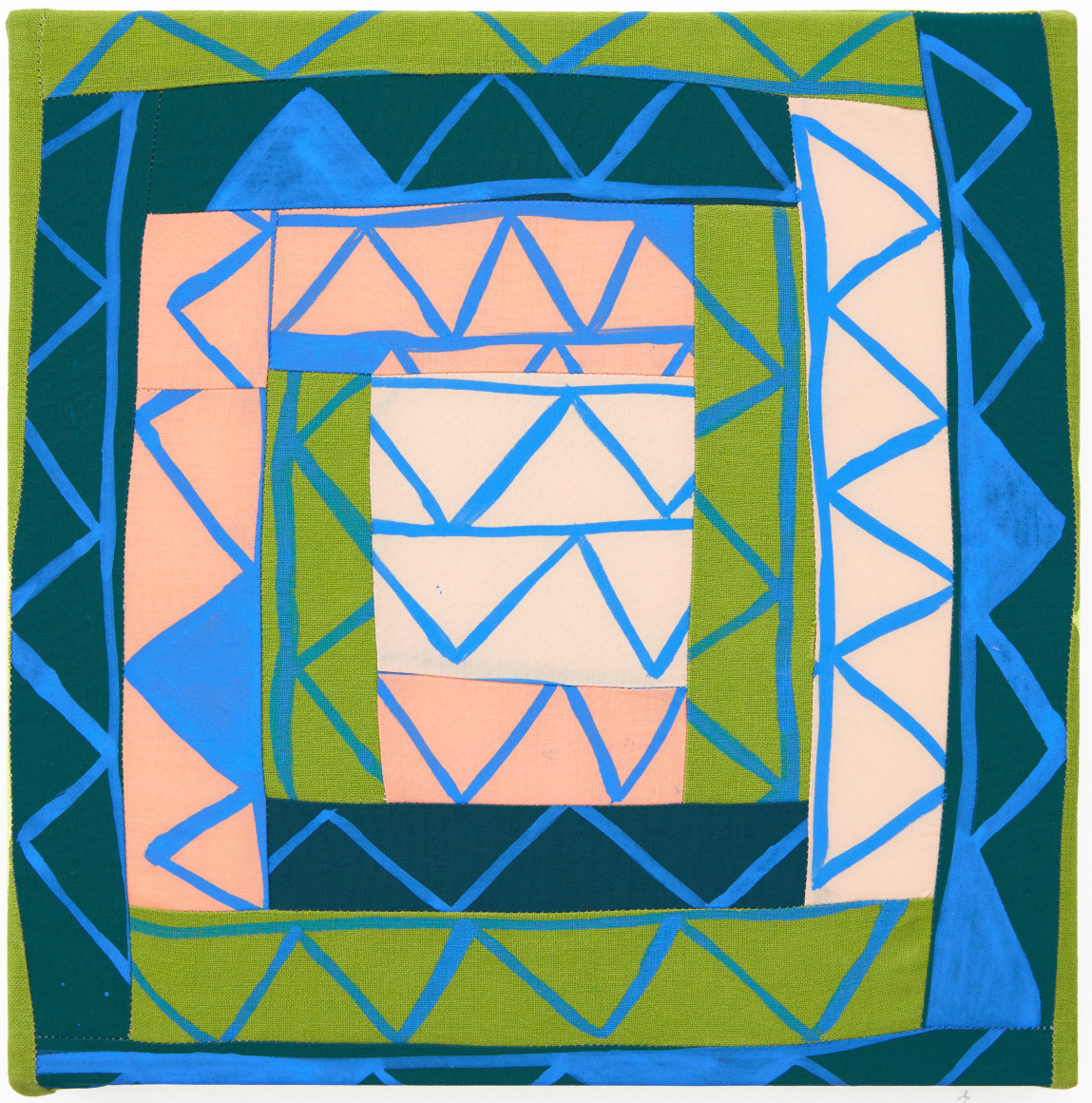 Found textile and fiber scraps, and ink on cardboard and colored mat board mounted on 1/4 in. Luan plywood
