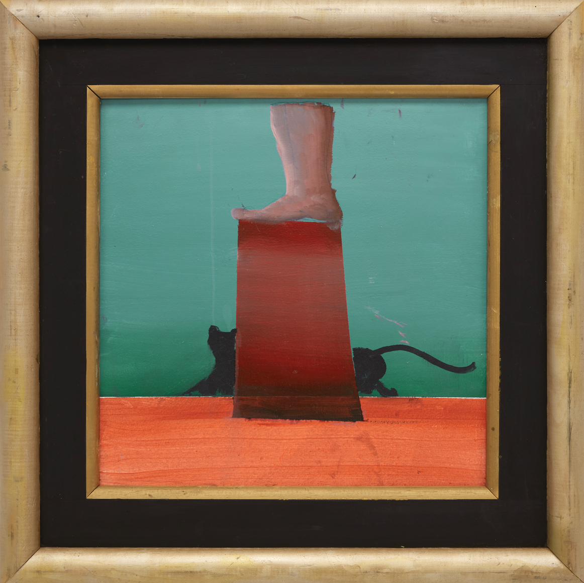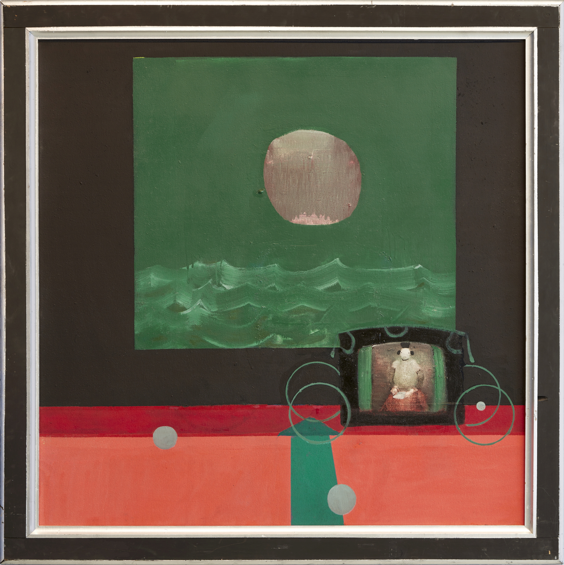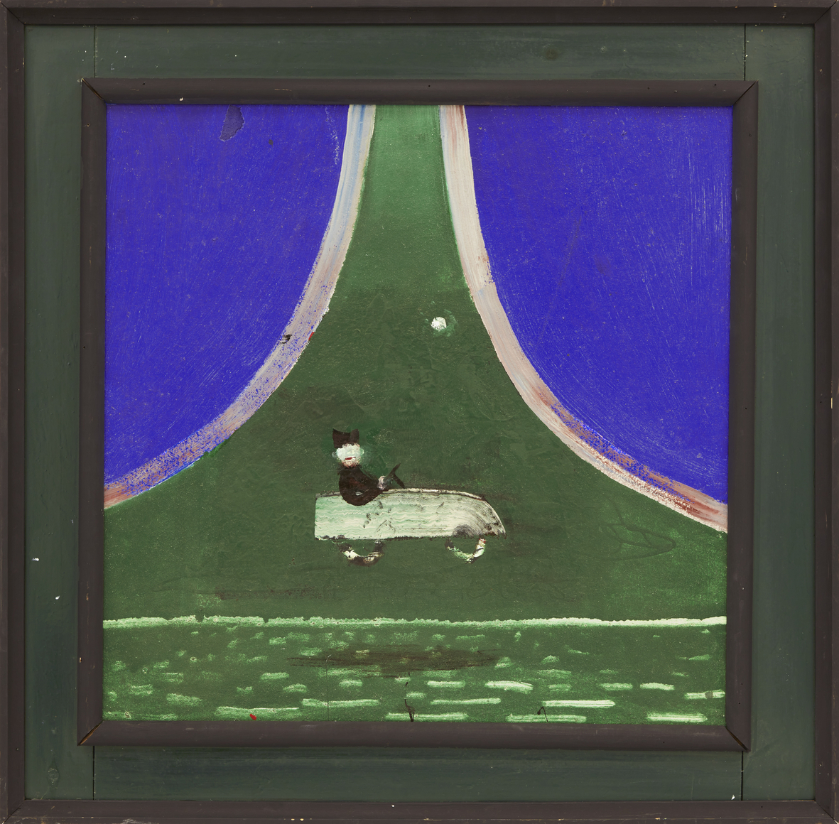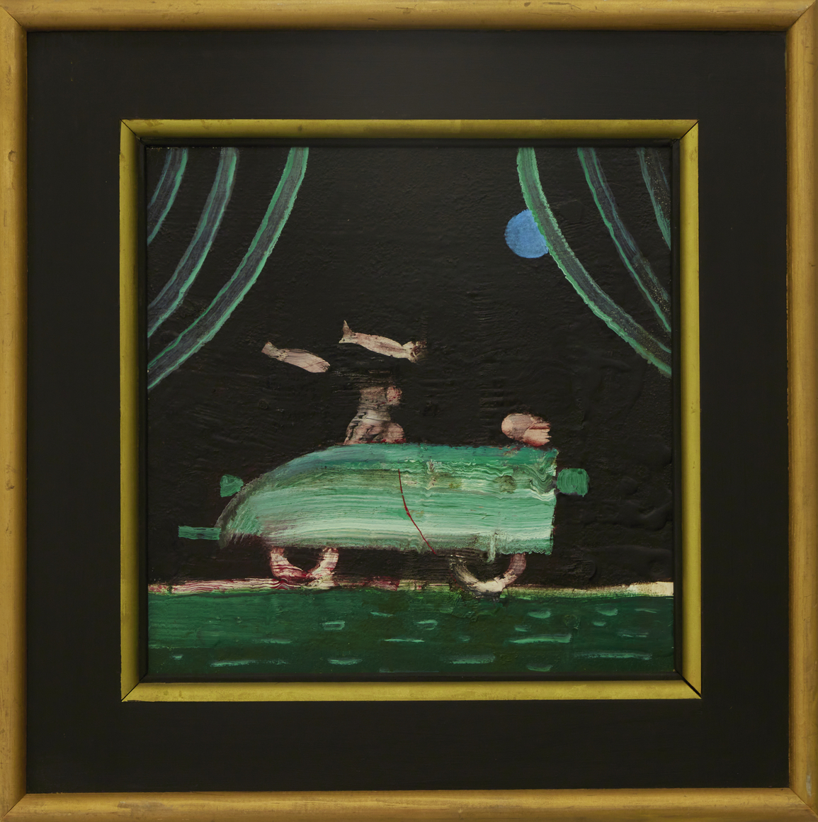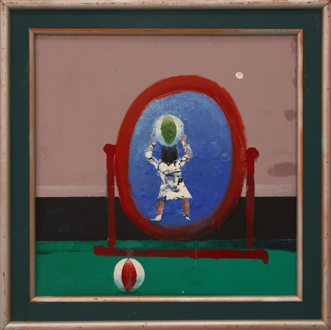 In his characteristic make-do fashion, Hamilton mostly used house paint from the local hardware store, stretching his own canvases or more often working on Masonite panels. He fabricated and painted his own bespoke frames, adding a Baroque, old-world flair to his dreamlike compositions. In the late 1970s, he withdrew from the art world, choosing to exhibit his work primarily at The Octagon, an eight-sided gallery he built on his property in Port Clyde, Maine, where he and his family had spent summers since the 1950s, and where he lived full-time after retiring from RISD in 1981.