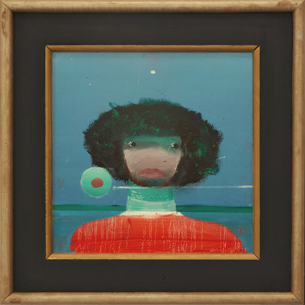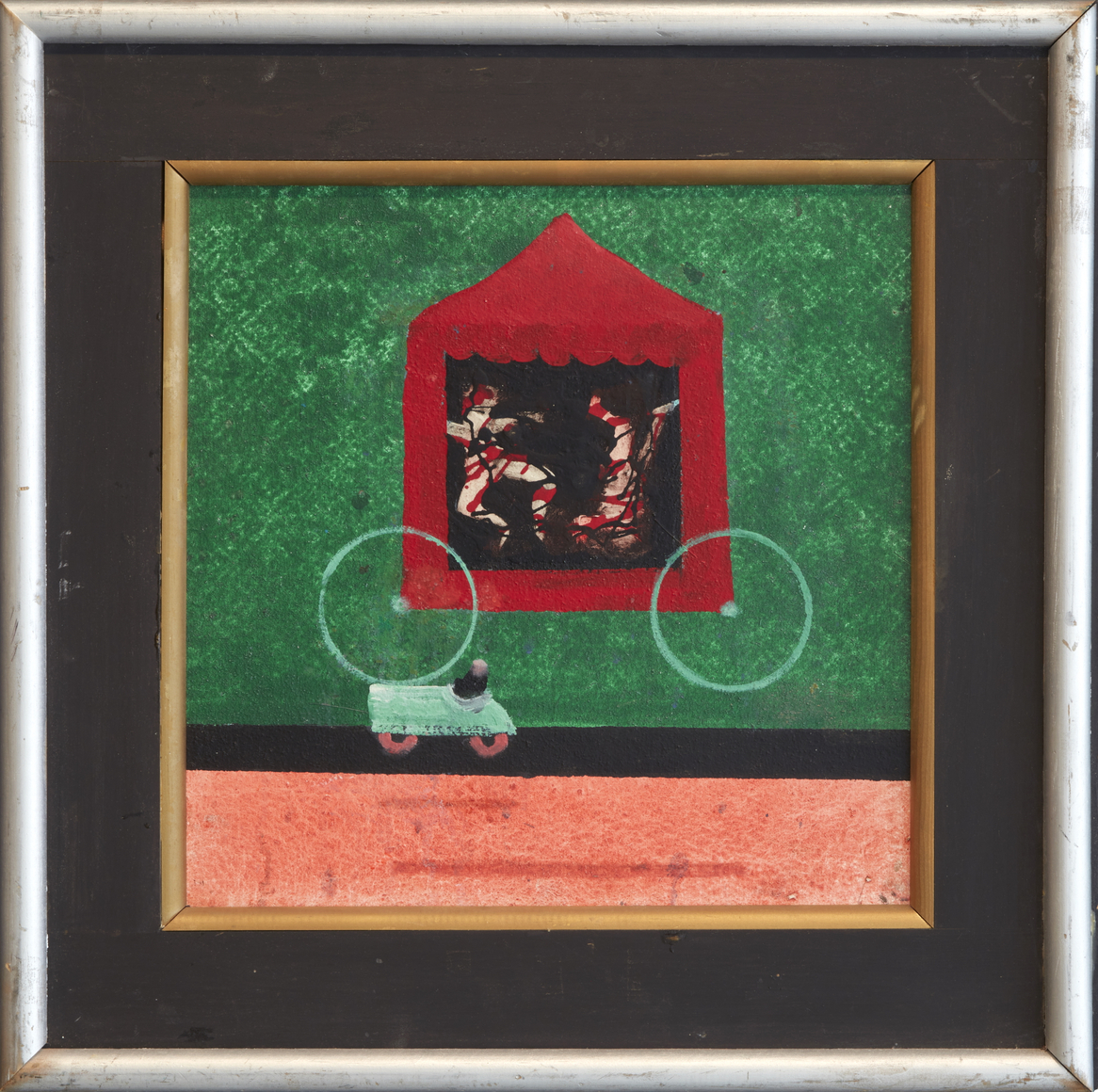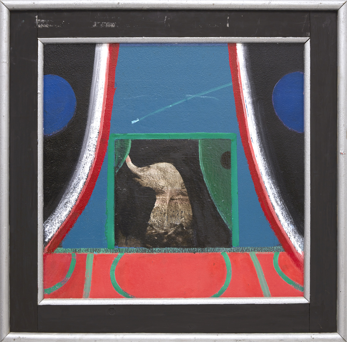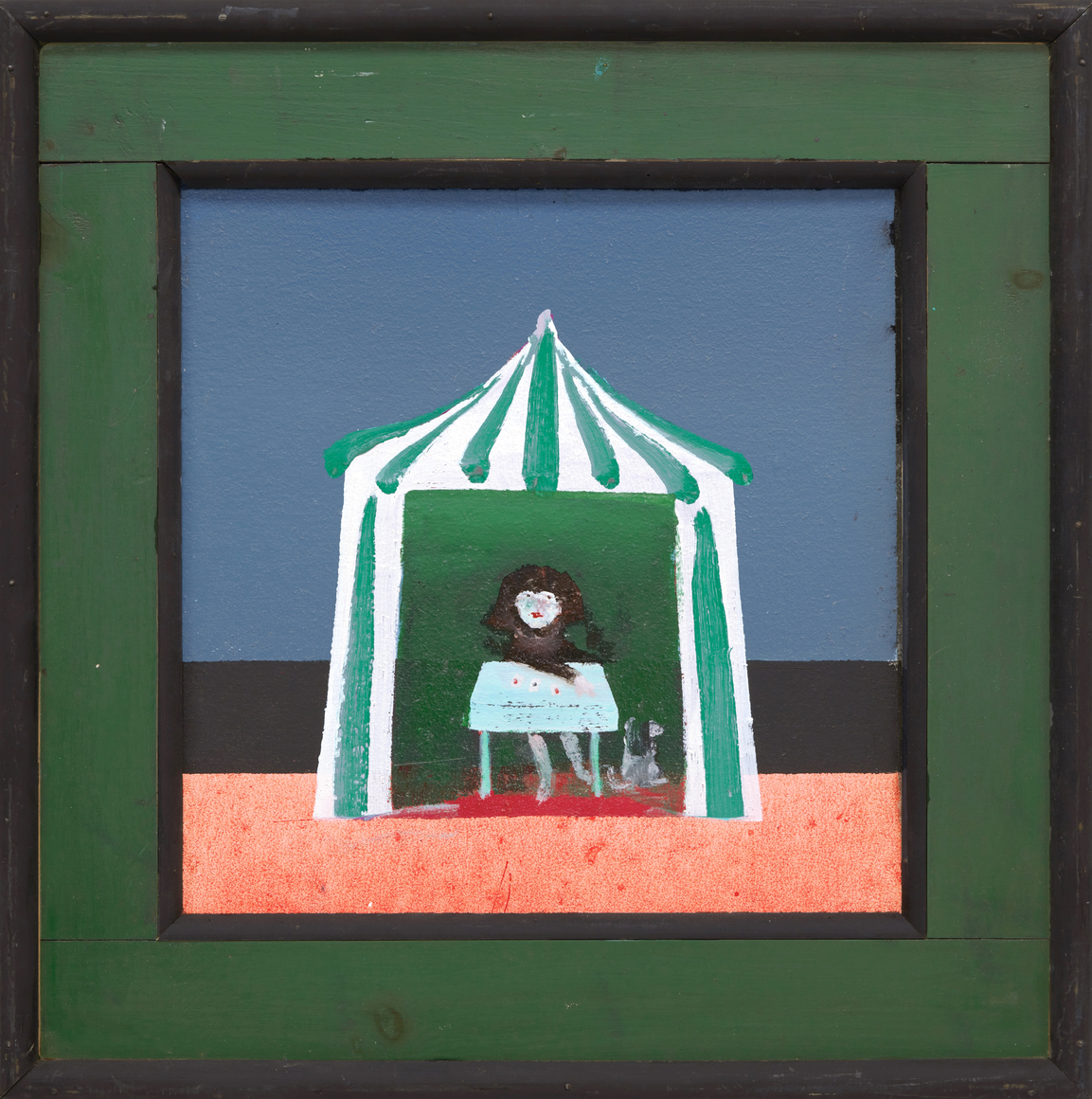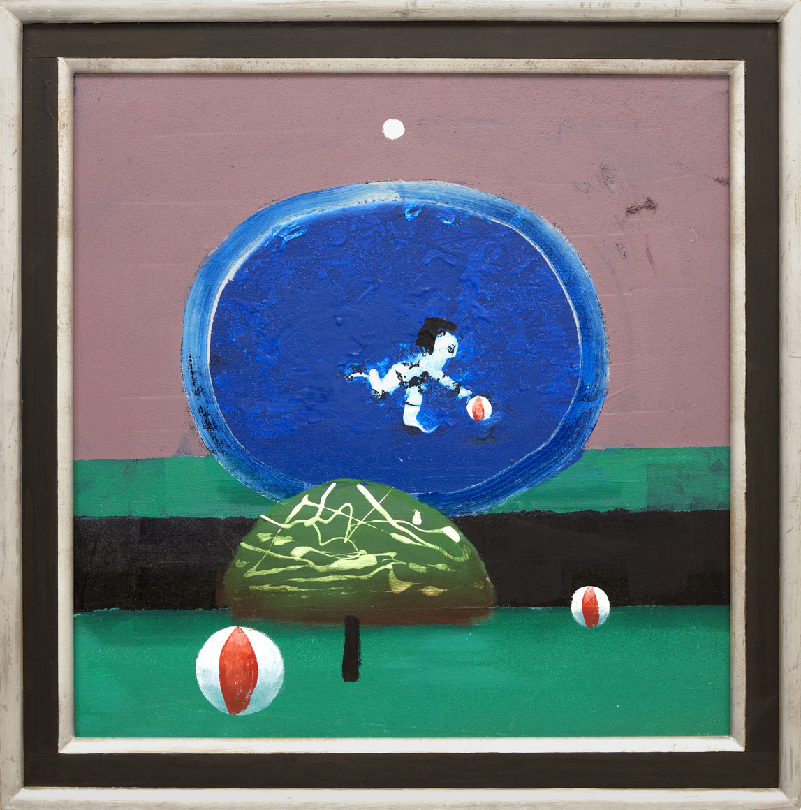 In his characteristic make-do fashion, Hamilton mostly used house paint from the local hardware store, stretching his own canvases or more often working on Masonite panels. He fabricated and painted his own bespoke frames, adding a Baroque, old-world flair to his dreamlike compositions. In the late 1970s, he withdrew from the art world, choosing to exhibit his work primarily at The Octagon, an eight-sided gallery he built on his property in Port Clyde, Maine, where he and his family had spent summers since the 1950s, and where he lived full-time after retiring from RISD in 1981.
