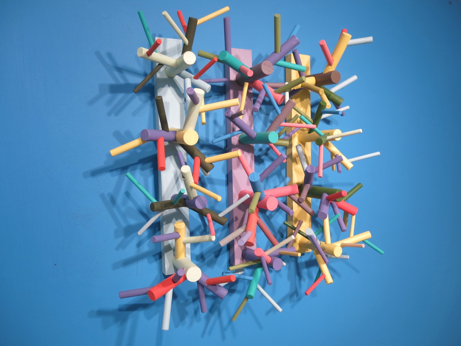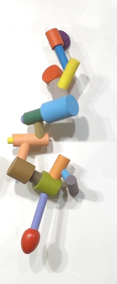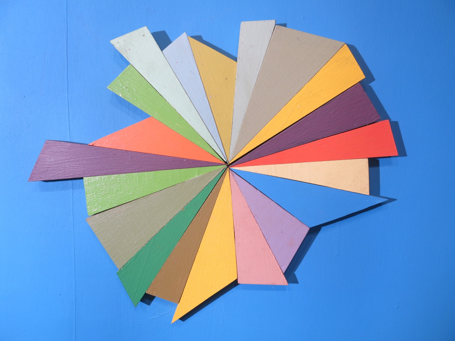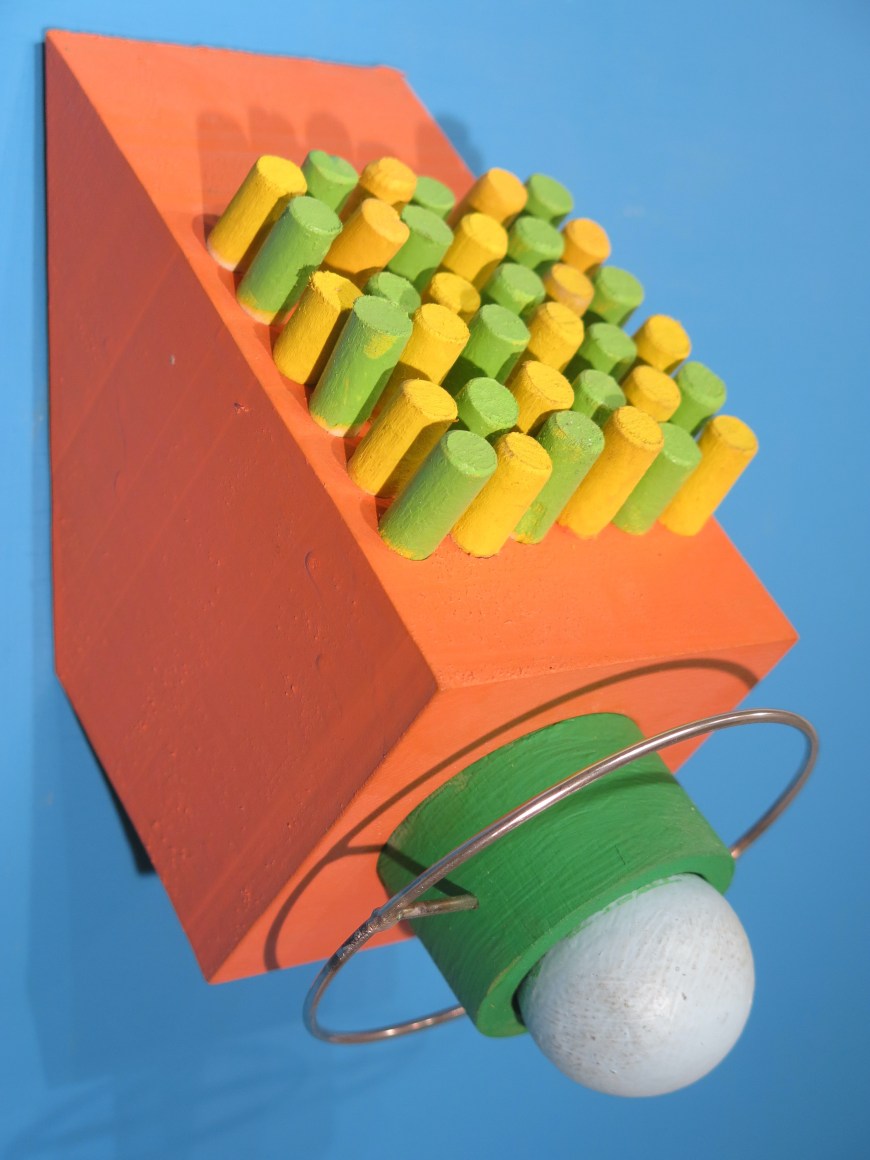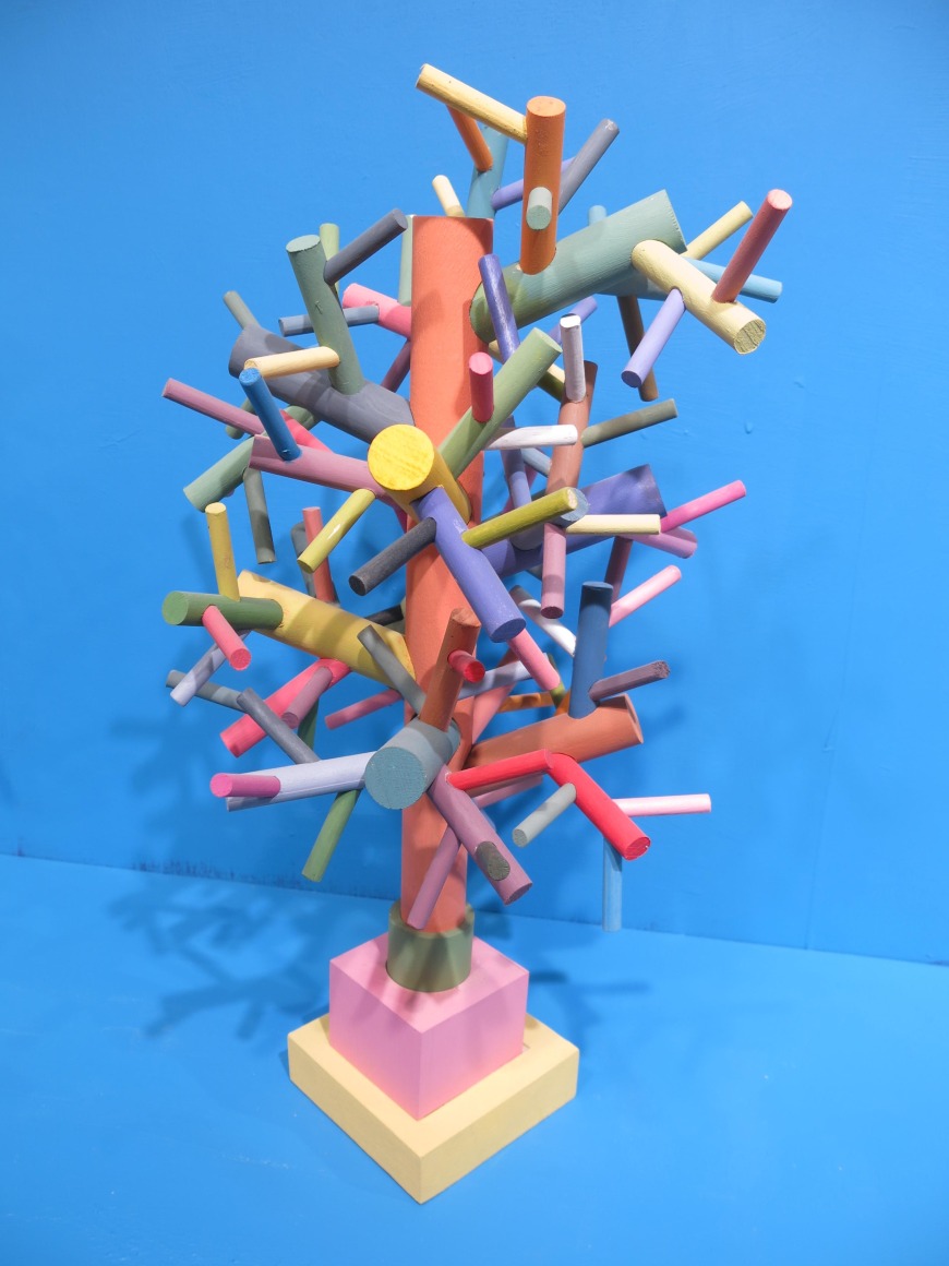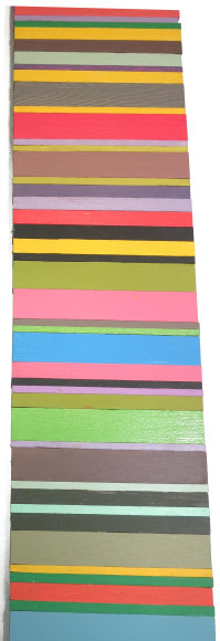 After Words is an experiment in making without thinking in advance of what it is that will be made. For me it relies on coming in touch with a few ordinary materials and flat, saturated color, allowing material and color to suggest ways of working. Materials, color, and a few hand tools in combination with “manual imagination” result in discovering an abstract object or sculptural form of some sort. It is my way of freely mining the subconscious through making something by hand. Words and meaning emerge later.