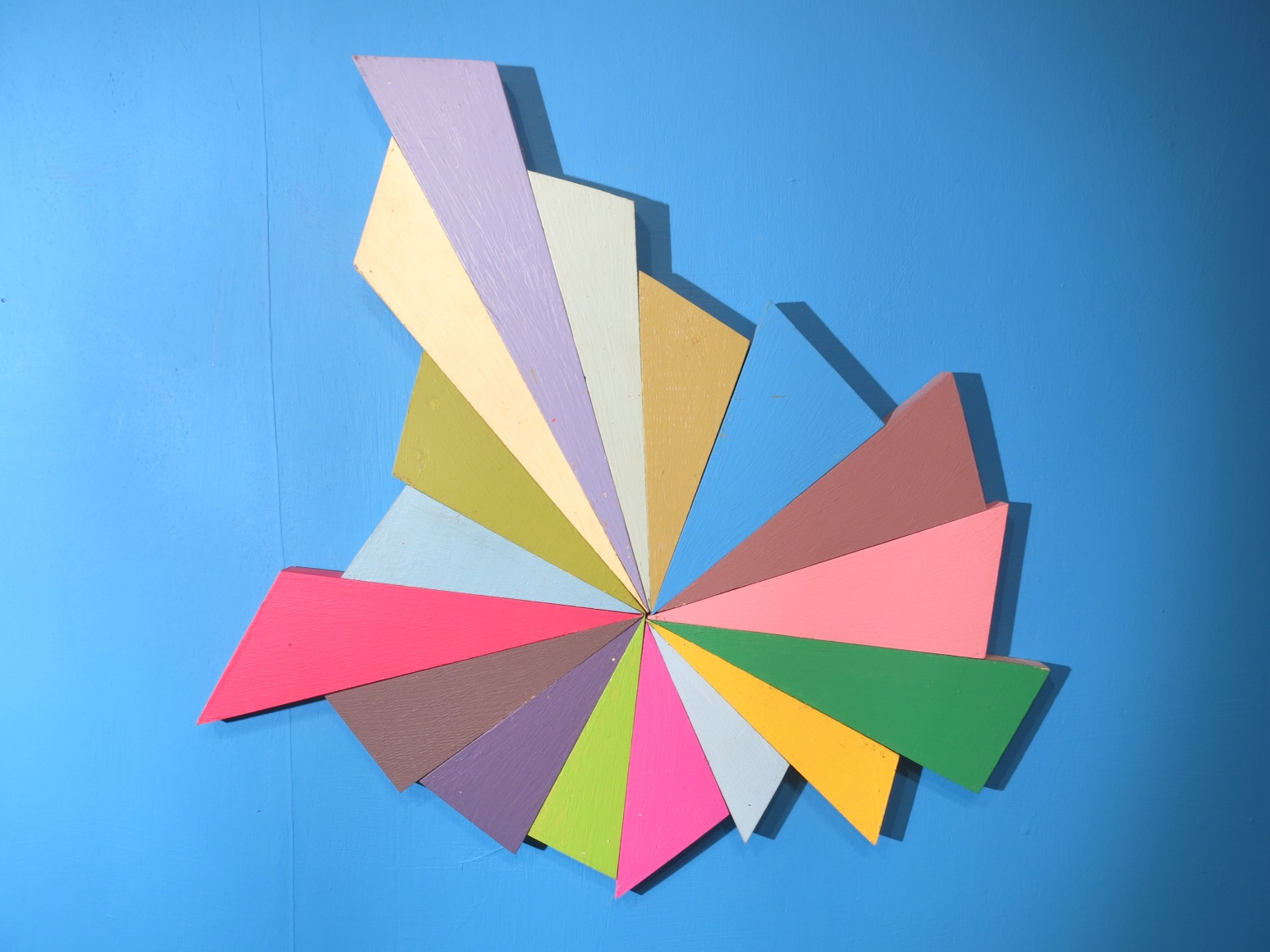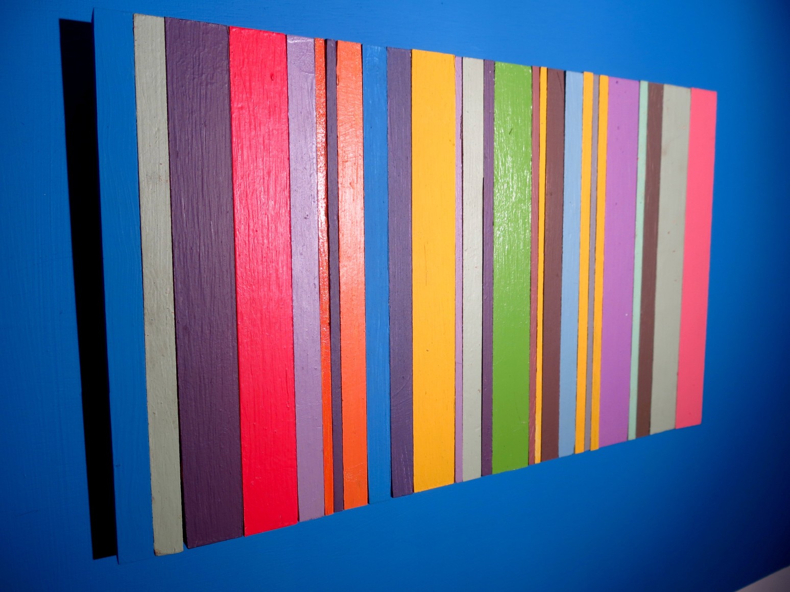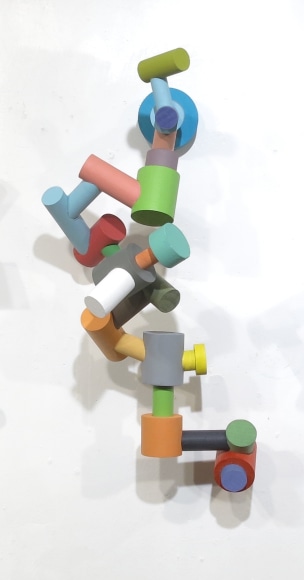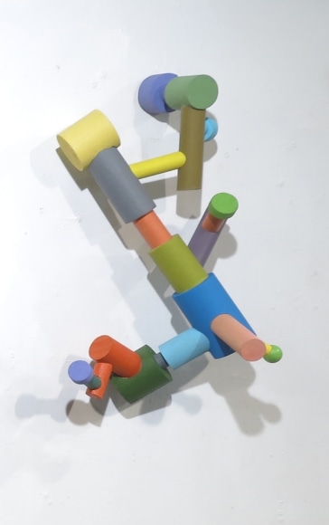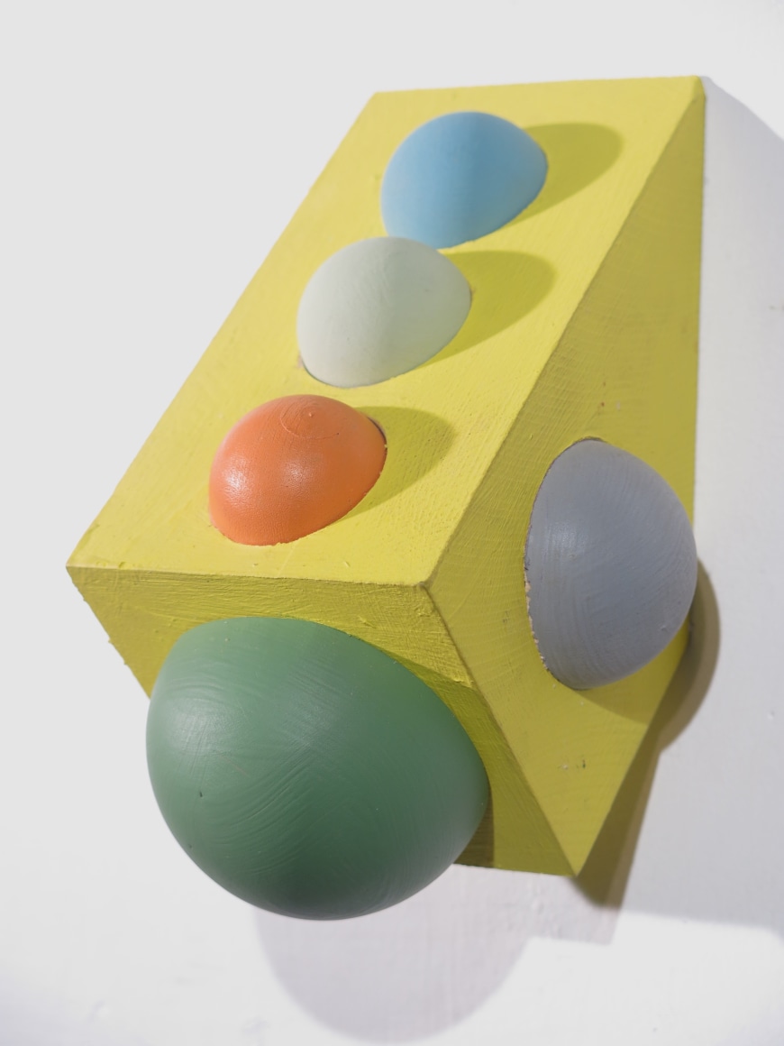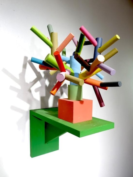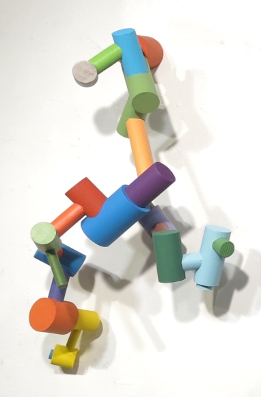 After Words is an experiment in making without thinking in advance of what it is that will be made. For me it relies on coming in touch with a few ordinary materials and flat, saturated color, allowing material and color to suggest ways of working. Materials, color, and a few hand tools in combination with “manual imagination” result in discovering an abstract object or sculptural form of some sort. It is my way of freely mining the subconscious through making something by hand. Words and meaning emerge later.