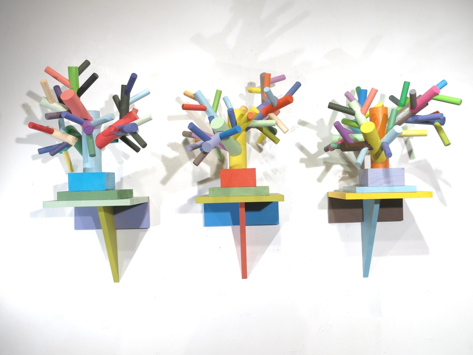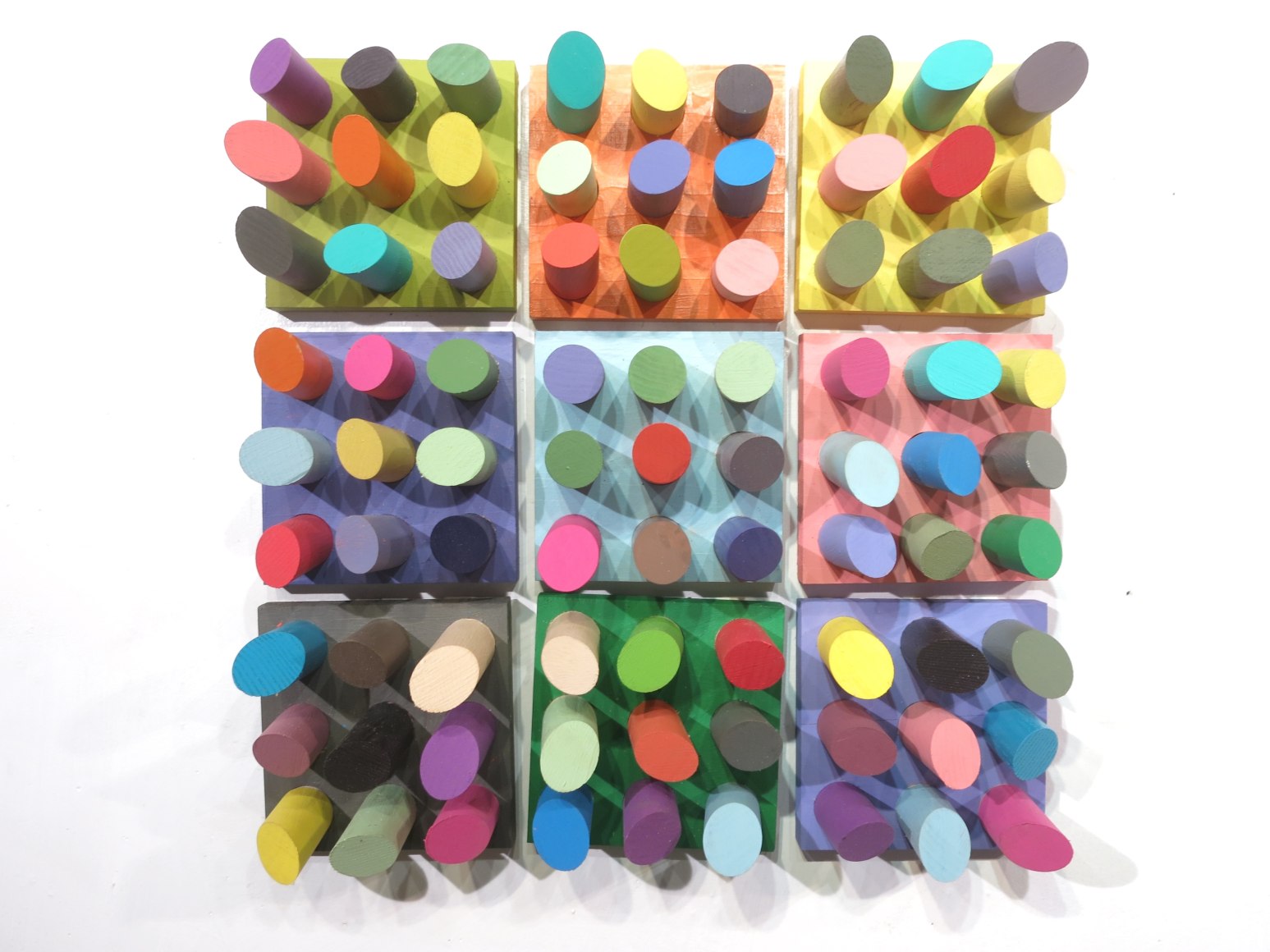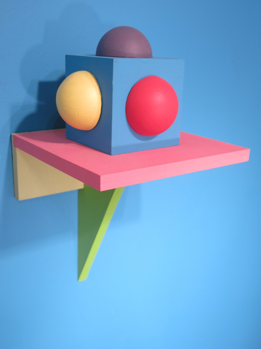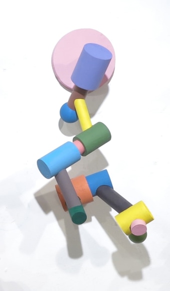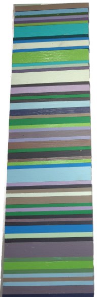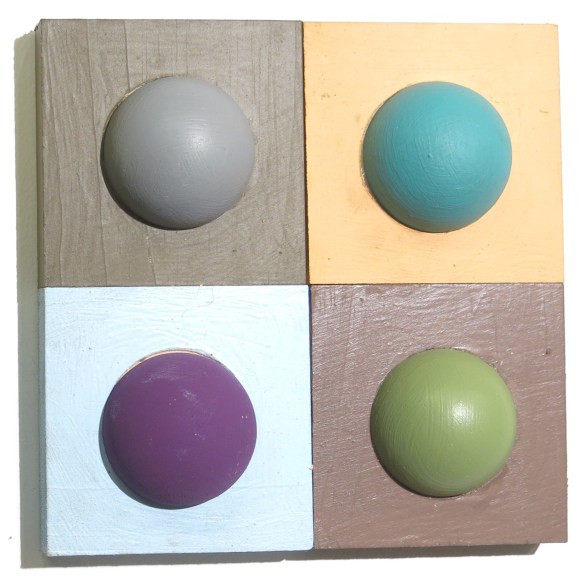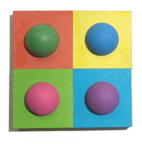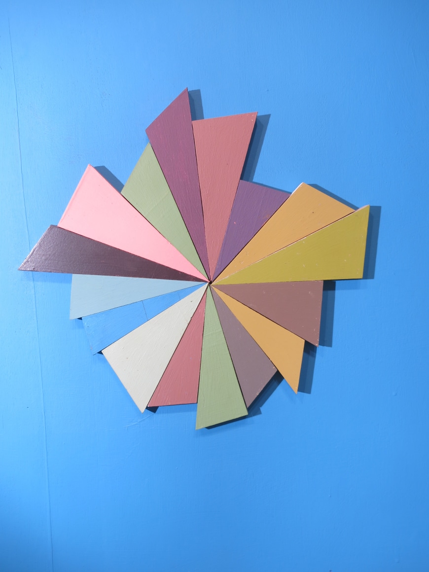 After Words is an experiment in making without thinking in advance of what it is that will be made. For me it relies on coming in touch with a few ordinary materials and flat, saturated color, allowing material and color to suggest ways of working. Materials, color, and a few hand tools in combination with “manual imagination” result in discovering an abstract object or sculptural form of some sort. It is my way of freely mining the subconscious through making something by hand. Words and meaning emerge later.