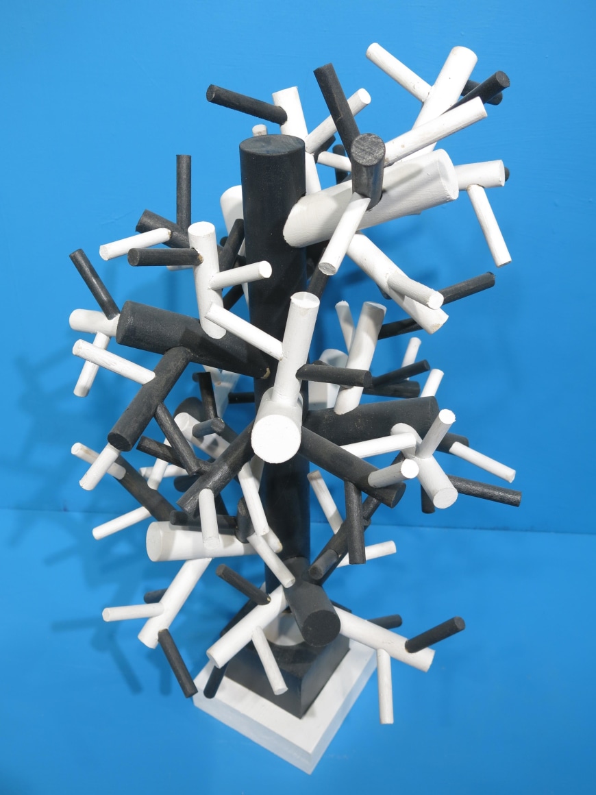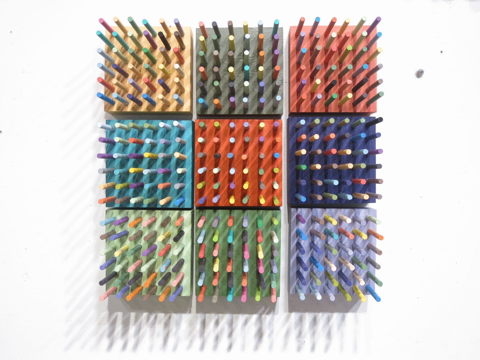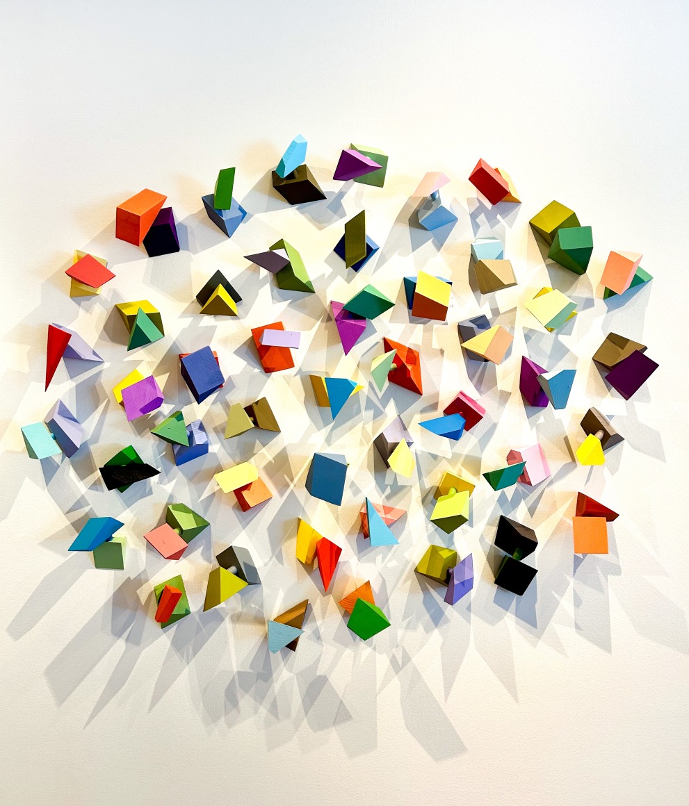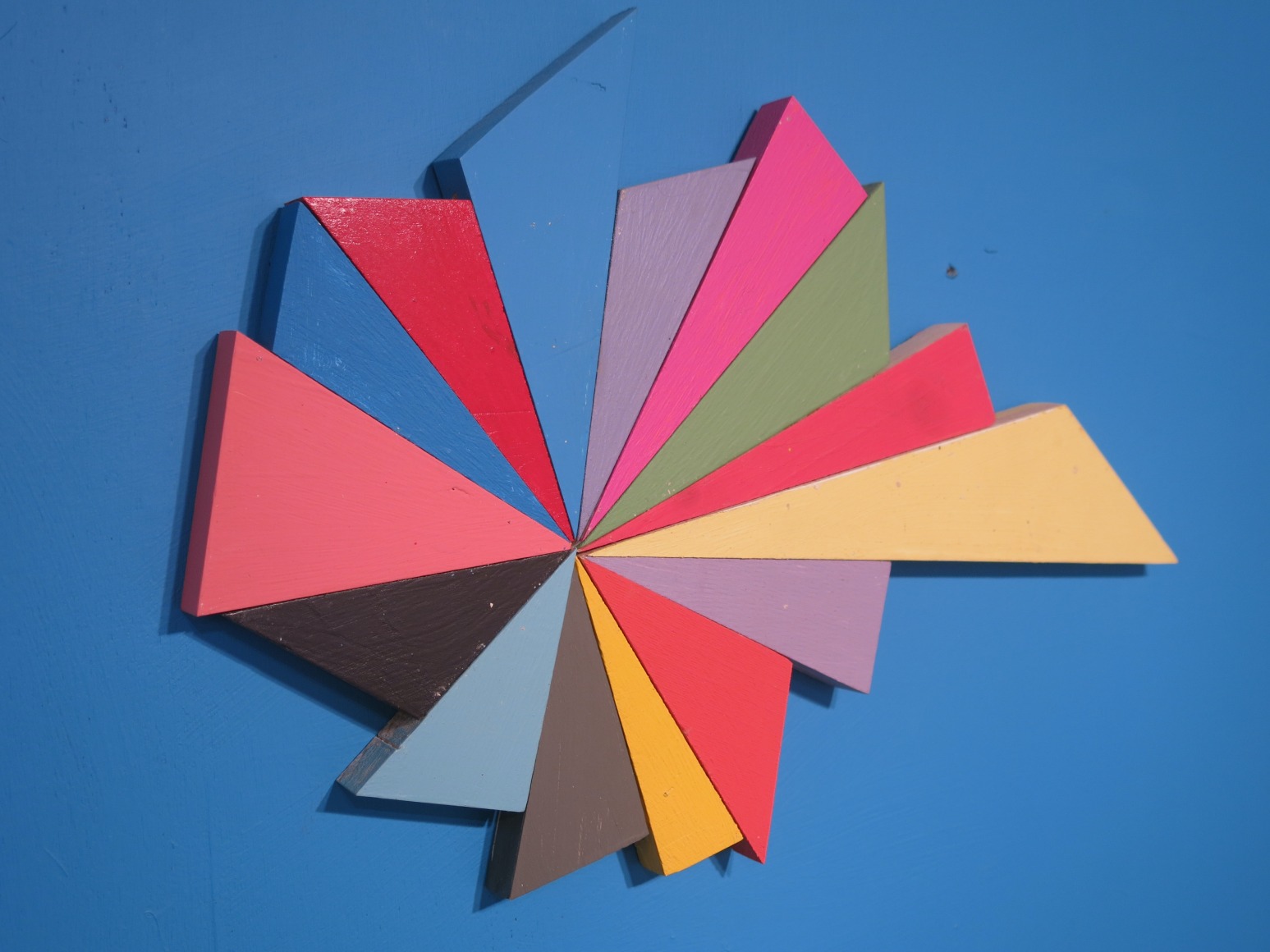 After Words is an experiment in making without thinking in advance of what it is that will be made. For me it relies on coming in touch with a few ordinary materials and flat, saturated color, allowing material and color to suggest ways of working. Materials, color, and a few hand tools in combination with “manual imagination” result in discovering an abstract object or sculptural form of some sort. It is my way of freely mining the subconscious through making something by hand. Words and meaning emerge later.