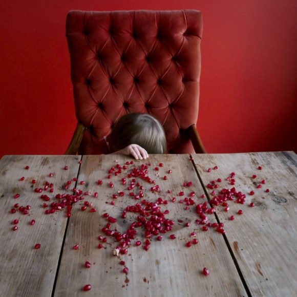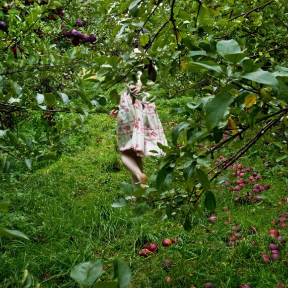 Harvey herself says these pictures “mark notations on time passing: A gold birthday cake, seasons changing, fallen deep red apples.” Indeed, nature can outdo clocks as a reminder that time is inexorable. Dusk comes on without fail every evening; day makes a habit of vanquishing night. On occasion, Harvey too relinquishes night in favor of sunlight: a girl in a patterned dress moves through a sunlit orchard that half hides her, binding her into the orchard’s growth; a red chair and a red-painted wall do their best to imitate the brilliance of pomegranate seeds. Yet sometimes even her daylight pictures balk at unlimited sun and court enough mist to baffle the eye instead: obscurity making a hesitant bid for dominance.