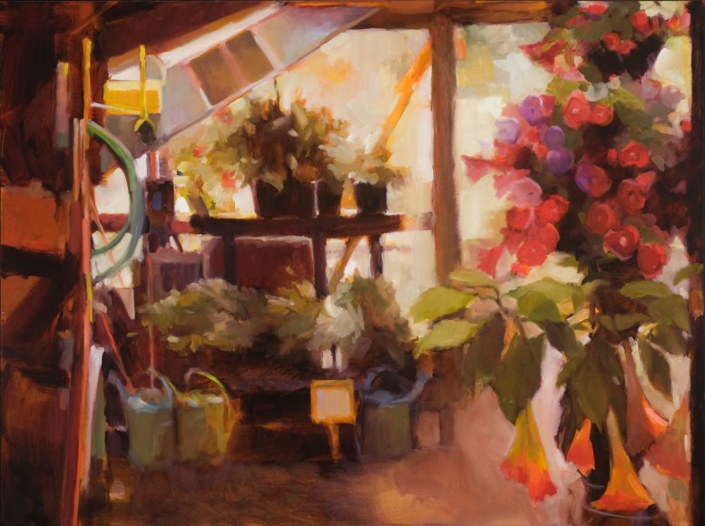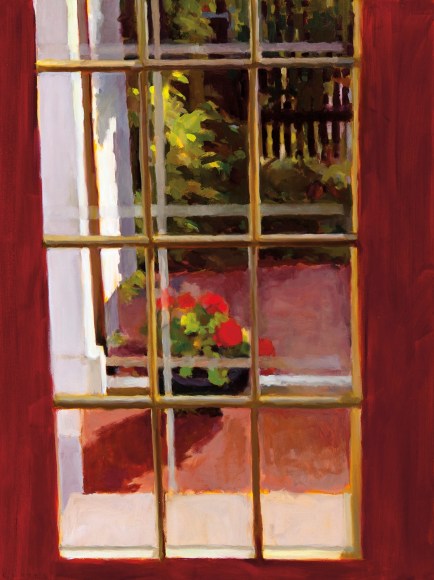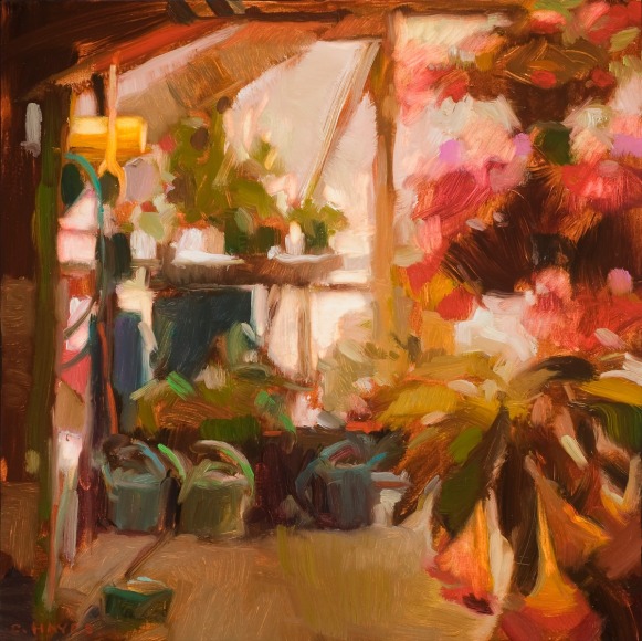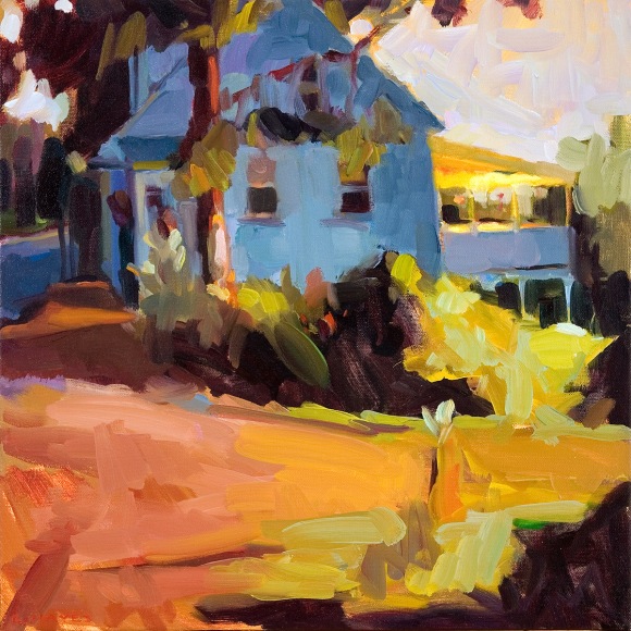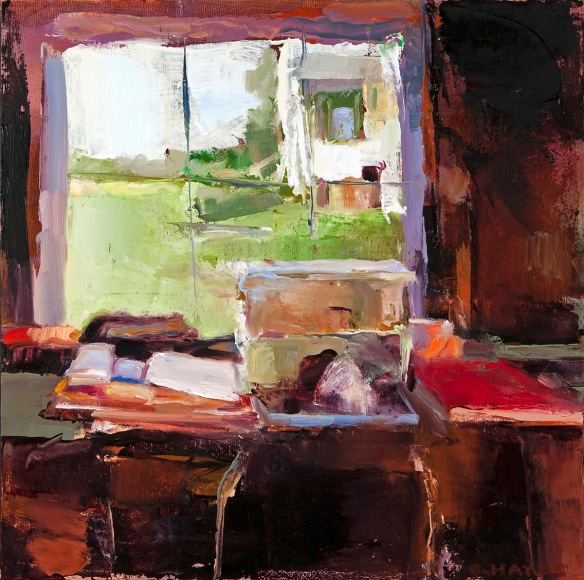 “In all respects, Connie Hayes is a fearless, intuitive painter. Her highly colorful, strongly stroked canvases look like the result of an orderly process of sketches, underdrawing and application of paint. In reality, although she sometimes uses such aids before she approaches the easel in her capacious studio, most of the time she starts work on a blank canvas, wielding a 3 to 4-inch wide brush to get going. Then, as she says, she “dives in,” composing the rest of the picture, much of which she may have thought out in her head, balancing images and colors to achieve a satisfactorily aesthetic final result. On some occasions, she says, “the paint speaks to me and I go off in unexpected directions. I like surprises.” This is an extremely intense exercise; Hayes says she gets into a “zone” until the work is finished or set aside for future amendments. Her subjects range from boats and water to communities viewed from ships or roads, to backyards, house interiors and floral still lifes. “I like not being pigeon-holed, Hayes says. Her brightly hued colors, which often have nothing to do with the actual look of the original building or boat, are chosen with deliberation, depending on what role she wants the painted object to play in the overall composition. Her radiant blues, blazing reds, and sunny yellows make ordinary scenes come alive and help draw viewers into the painting. Often of late she has utilized more muted colors to achieve the results she seeks. After a long stint as a teacher and administrator at the Maine College of Art, Hayes has worked at the top of her game since moving from Portland to Rockland in 2005, about half the period covered by this exhibition. Much of her art results from her “Borrowed Views” project, in which she spends up to a week painting in and around the homes of friends all over Maine. Ever trying new approaches to her art, mindful of art historical precedents and armed with a spirit of adventure, Connie Hayes has many interesting paintings ahead of her. Whether borrowing views or moving about on her own, it will be interesting to see what this thoughtful, gifted painter achieves in the years ahead.”