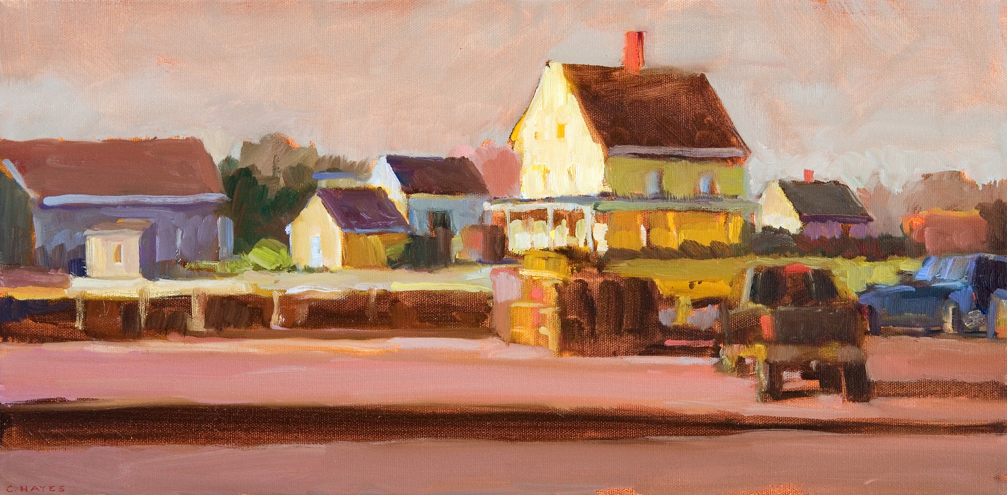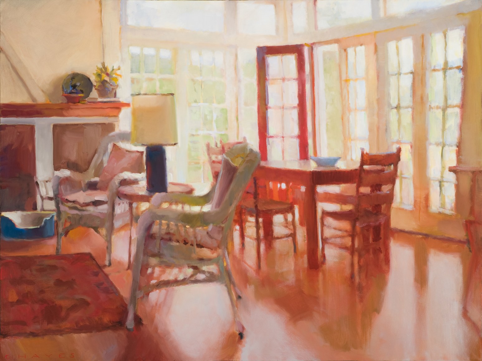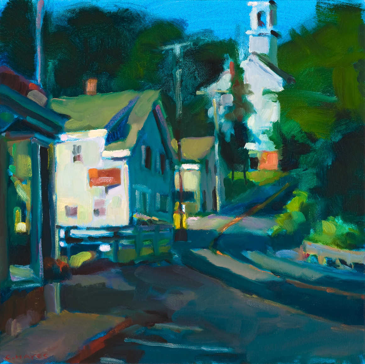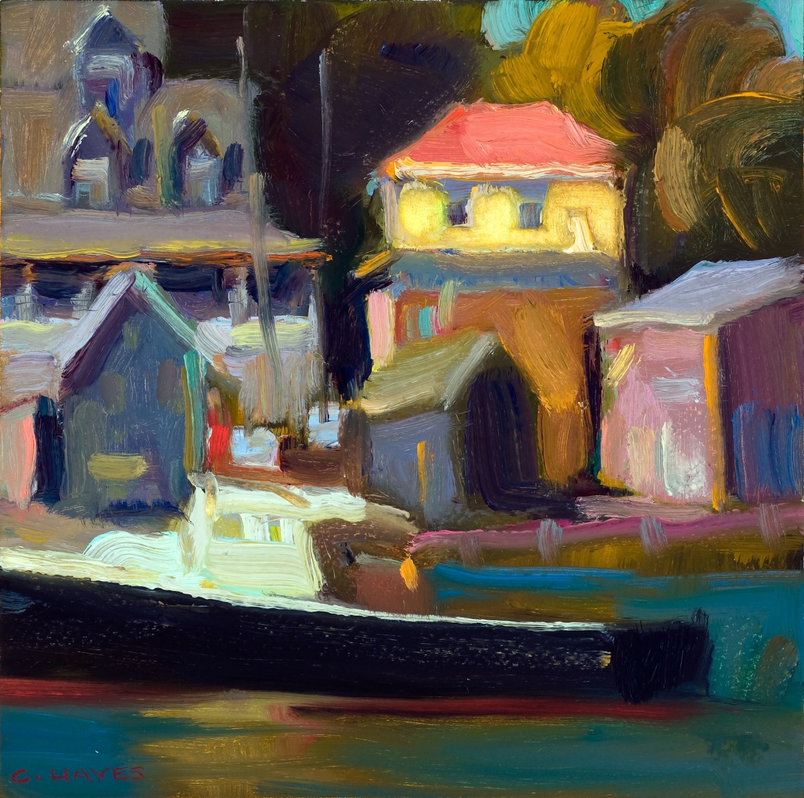Connie Hayes is widely admired and regarded for her color-rich paintings emphasizing light and shadow and the underlying geometry forms within her harmonious compositions. Her subjects range from boats and water to studies of interiors and still lives. For over twenty-five years, she has returned to paint on Vinalhaven Island, the source of her most recent work. "I have had a crush on Vinalhaven since 1996," she says. "Vinalhaven's landmarks, traditions, and landscapes remain reassuringly unchanged." The light, shapes, and colors of the island's environment, its working waterfront, and the village populated with Mansard roof buildings are an endless font of inspiration for her. "Those sights and sensations animate my memory as I paint and draw Vinalhaven back in my mainland studio."