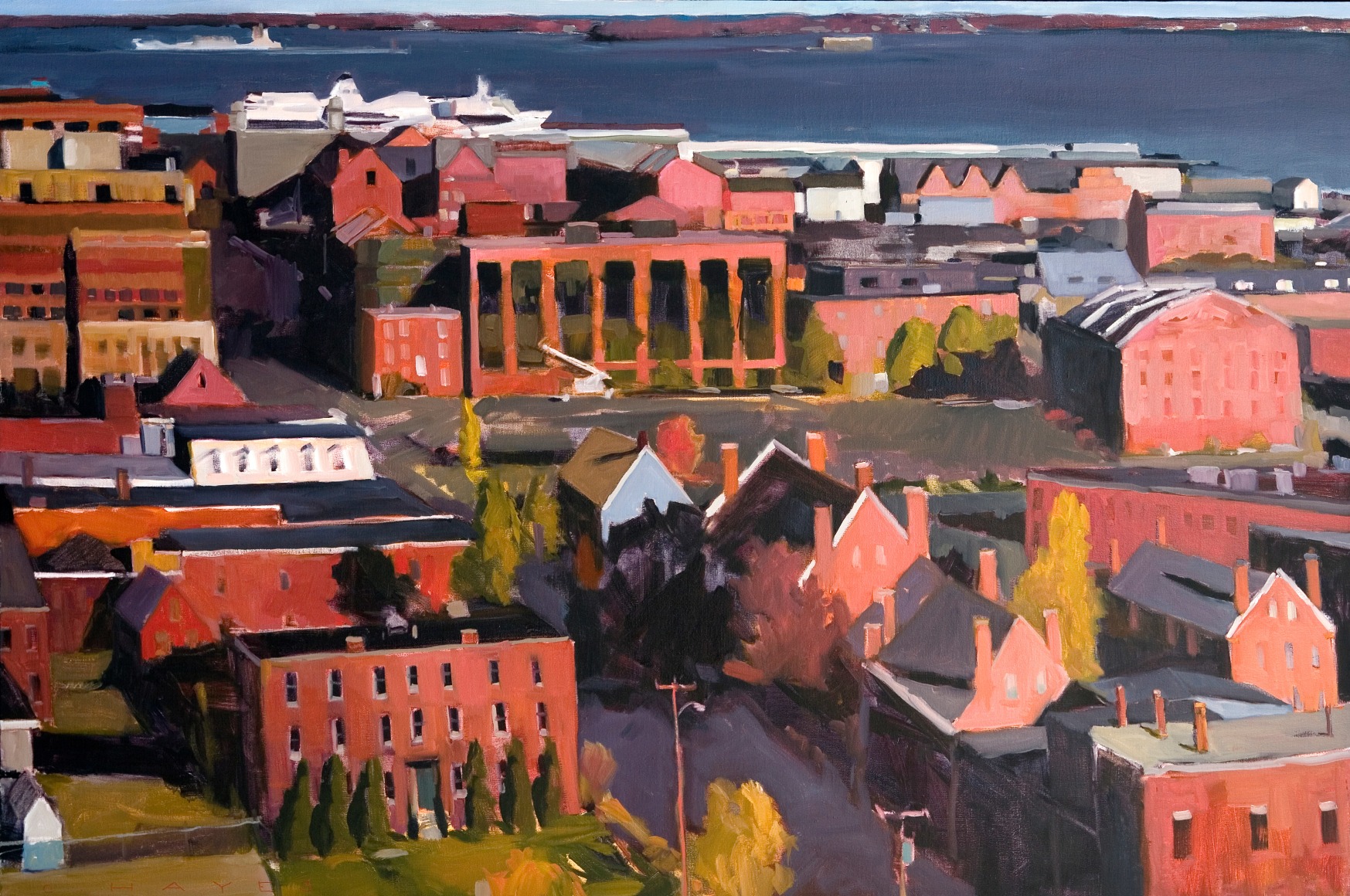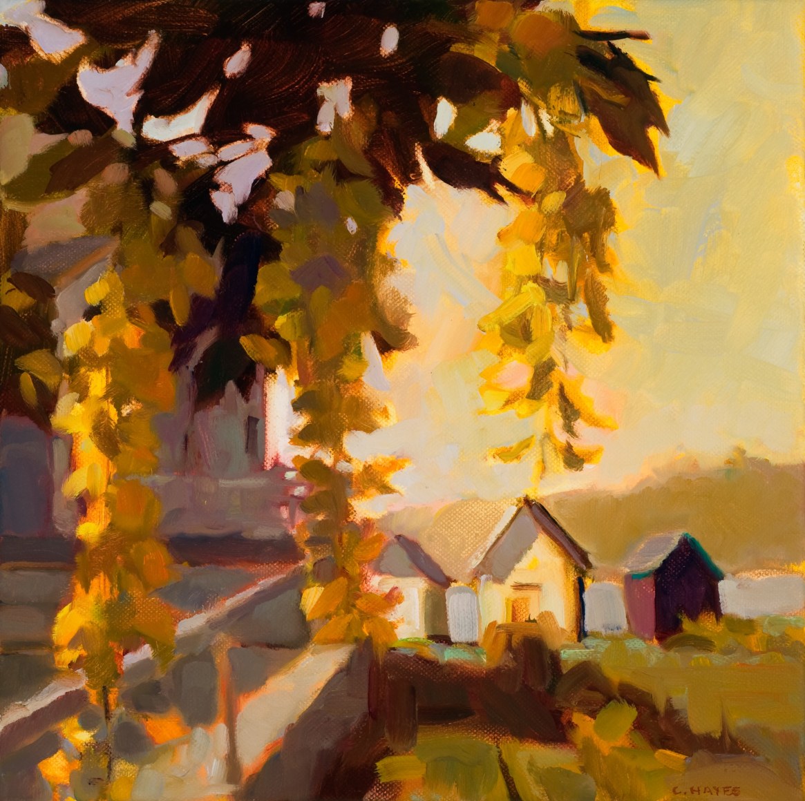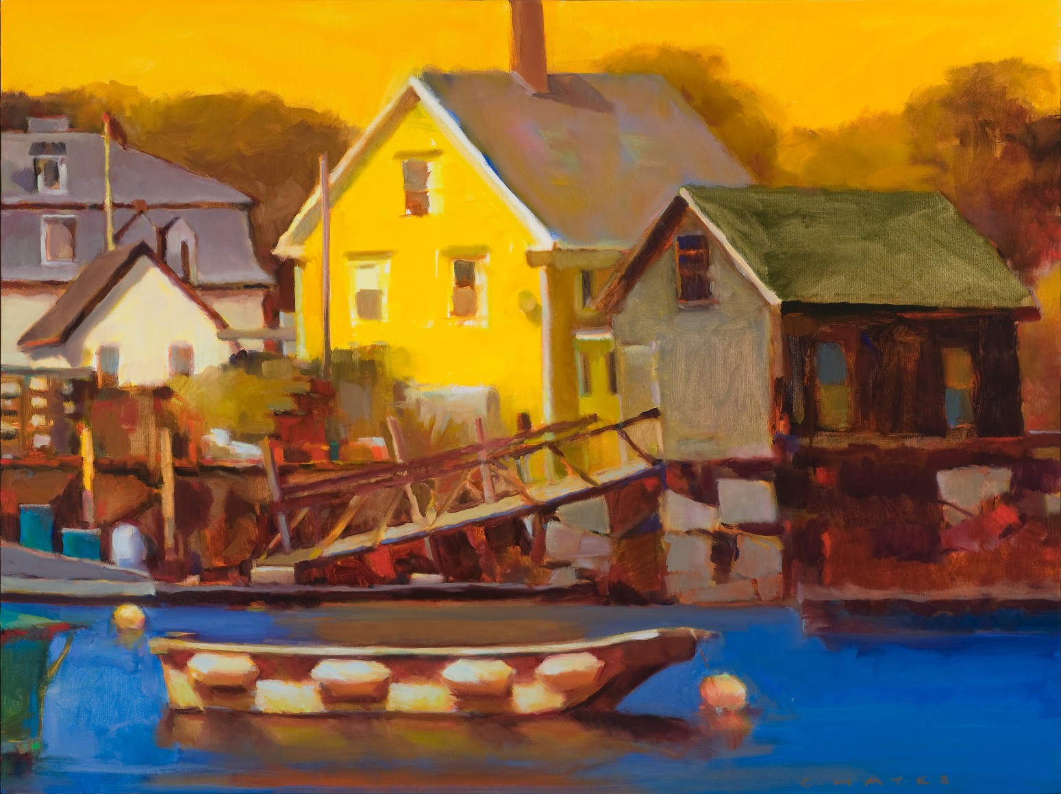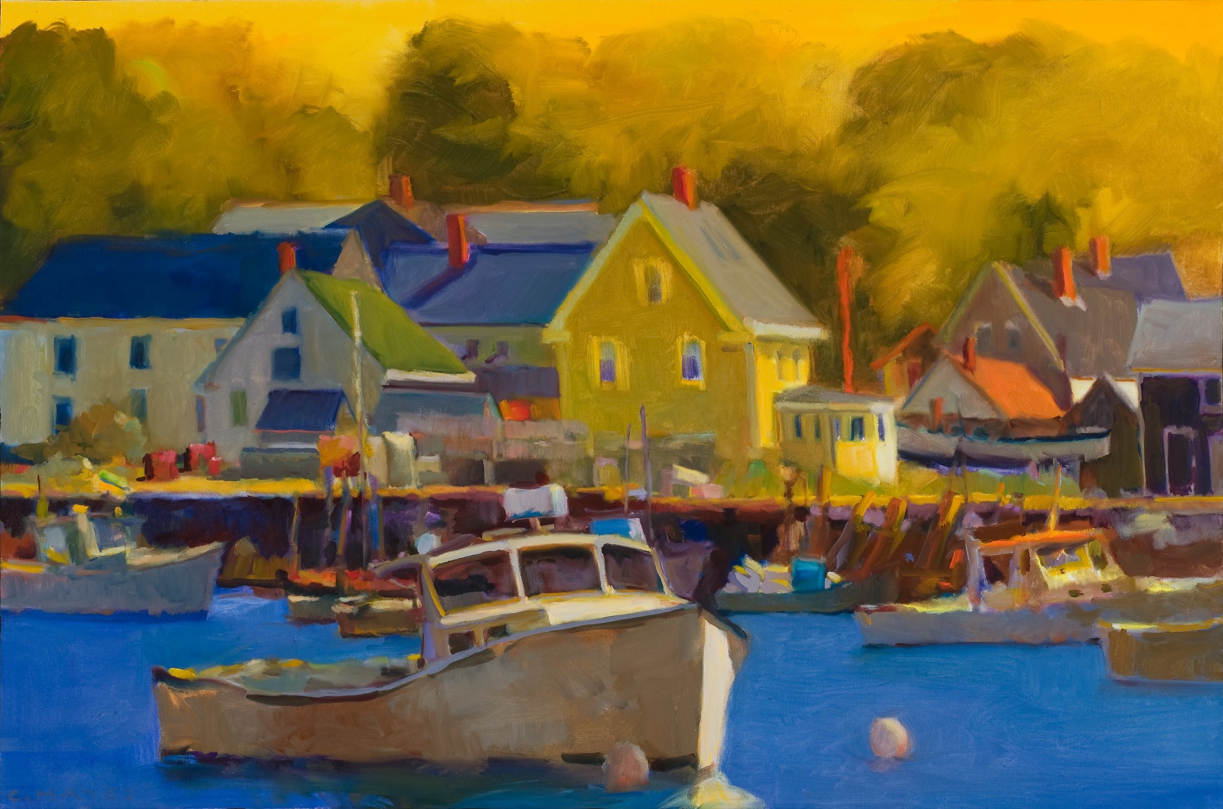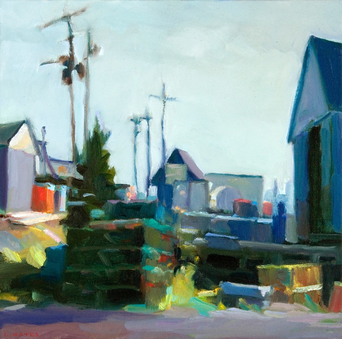 Connie Hayes is widely admired and regarded for her color-rich paintings emphasizing light and shadow and the underlying geometry forms within her harmonious compositions. Her subjects range from boats and water to studies of interiors and still lives. For over twenty-five years, she has returned to paint on Vinalhaven Island, the source of her most recent work. "I have had a crush on Vinalhaven since 1996," she says. "Vinalhaven's landmarks, traditions, and landscapes remain reassuringly unchanged." The light, shapes, and colors of the island's environment, its working waterfront, and the village populated with Mansard roof buildings are an endless font of inspiration for her. "Those sights and sensations animate my memory as I paint and draw Vinalhaven back in my mainland studio."
