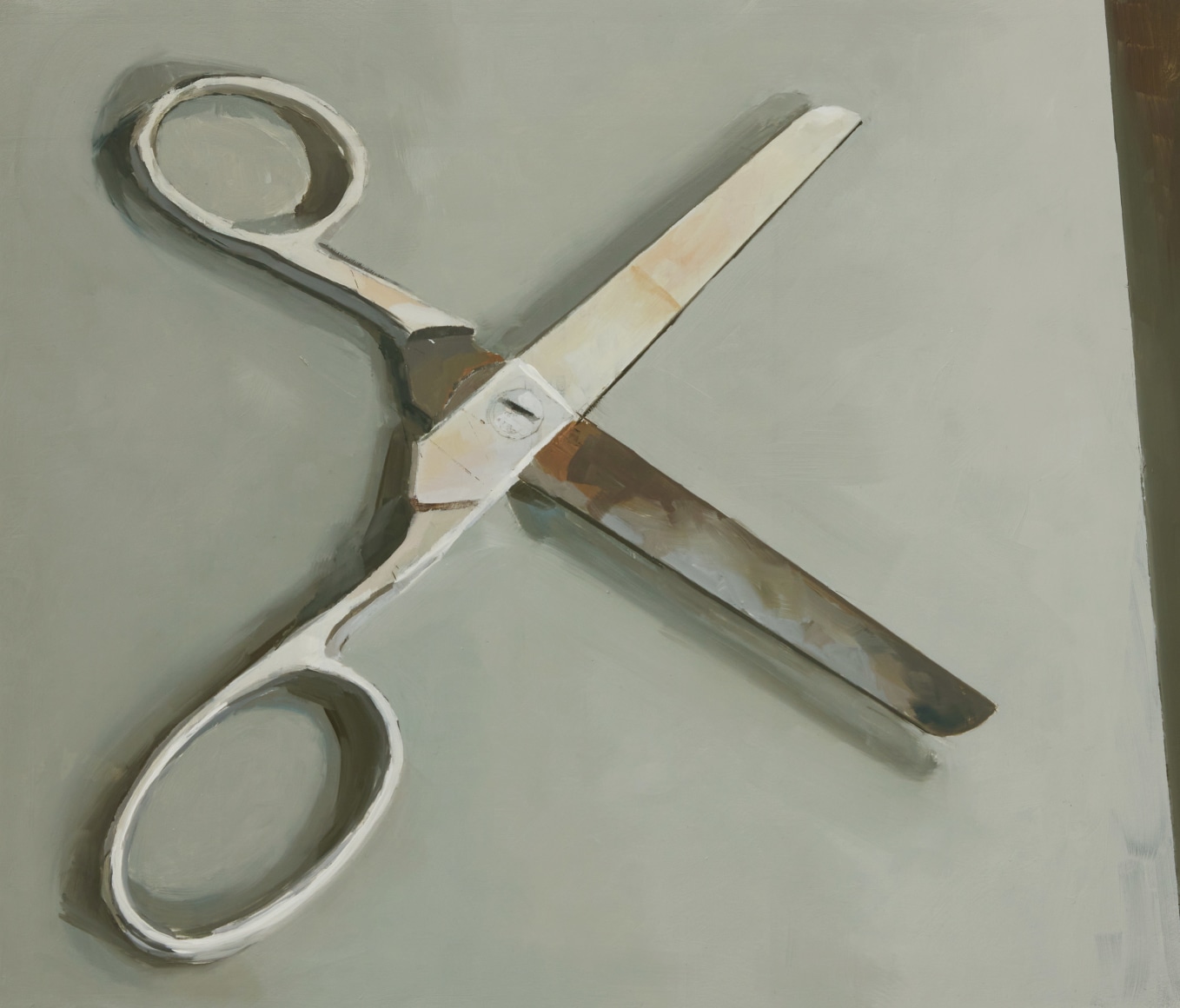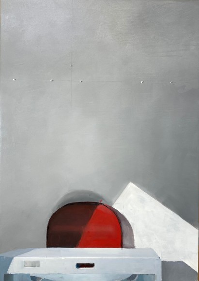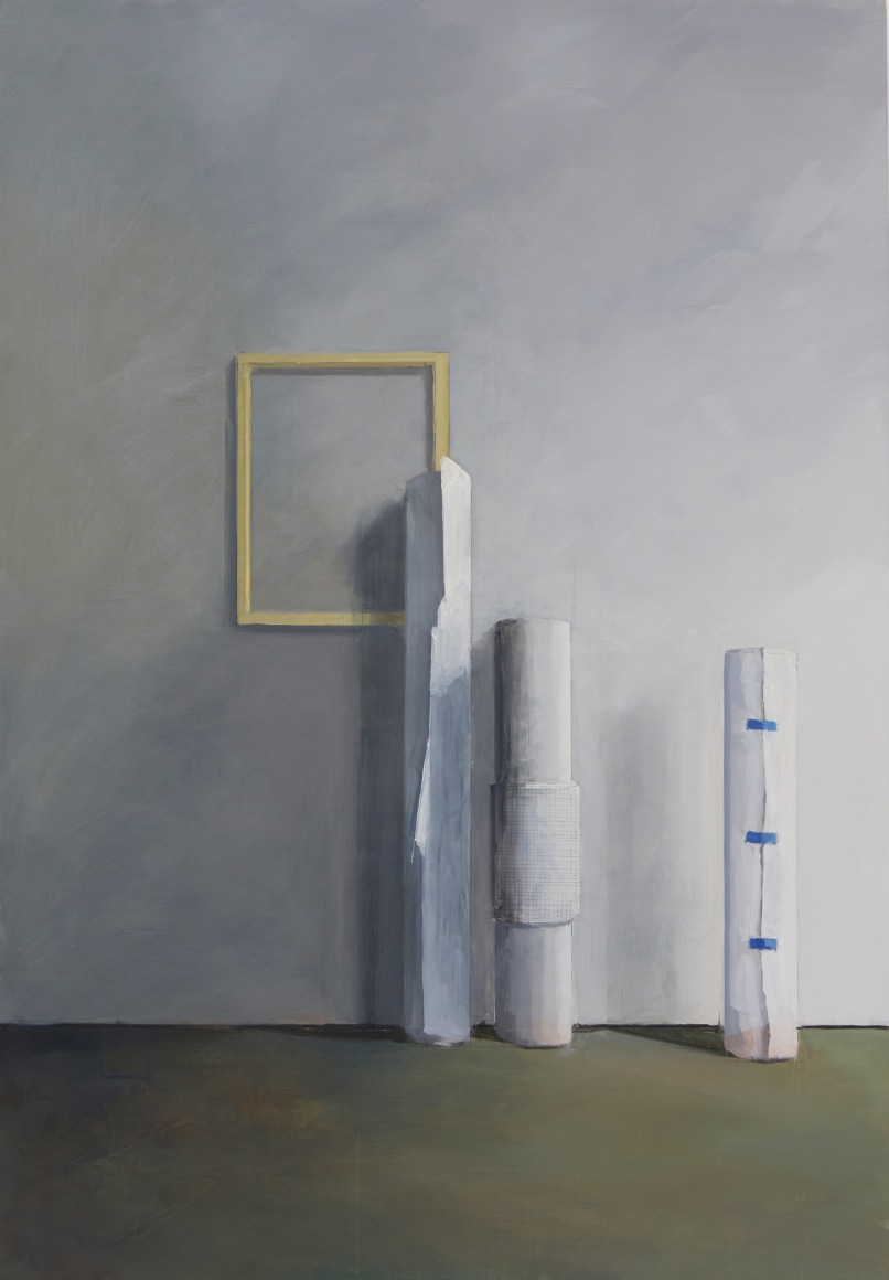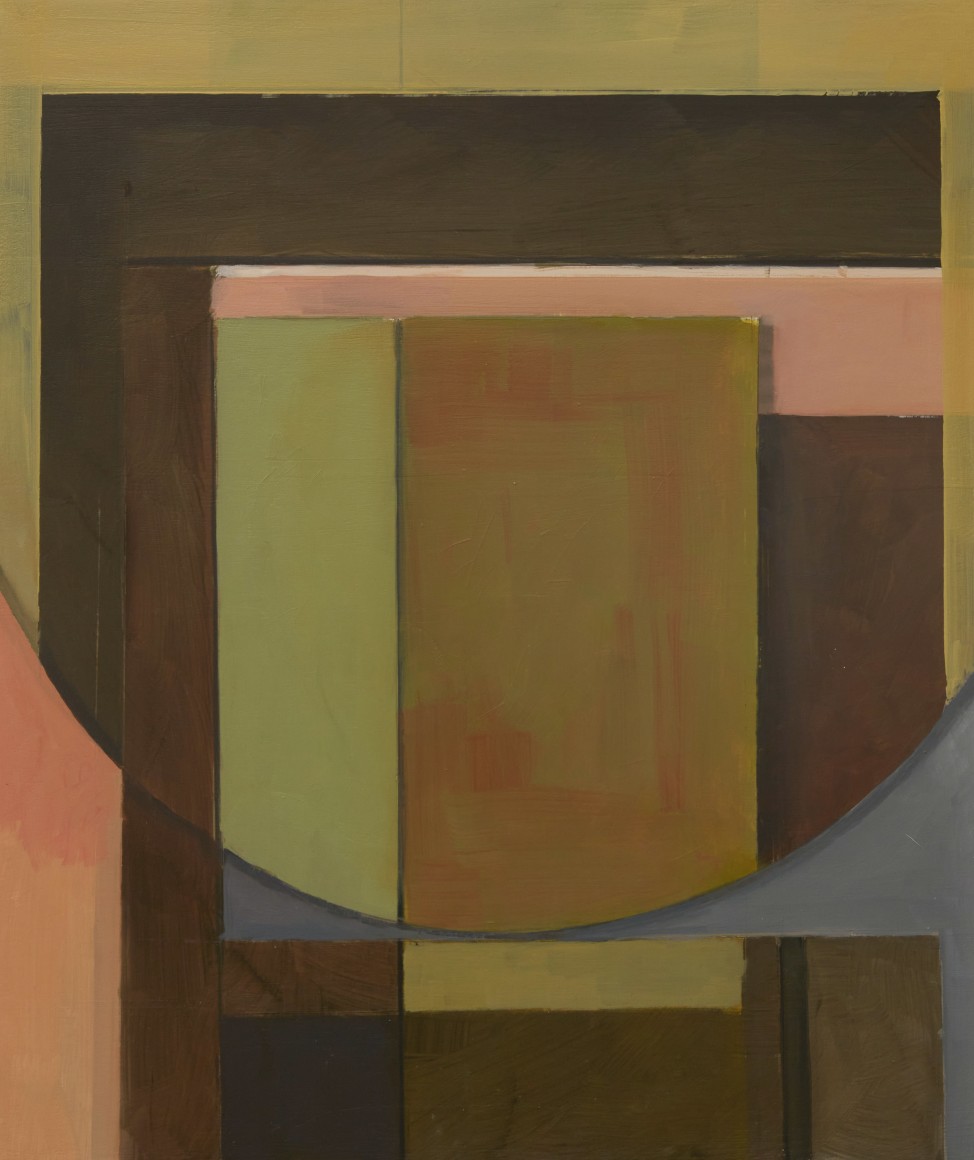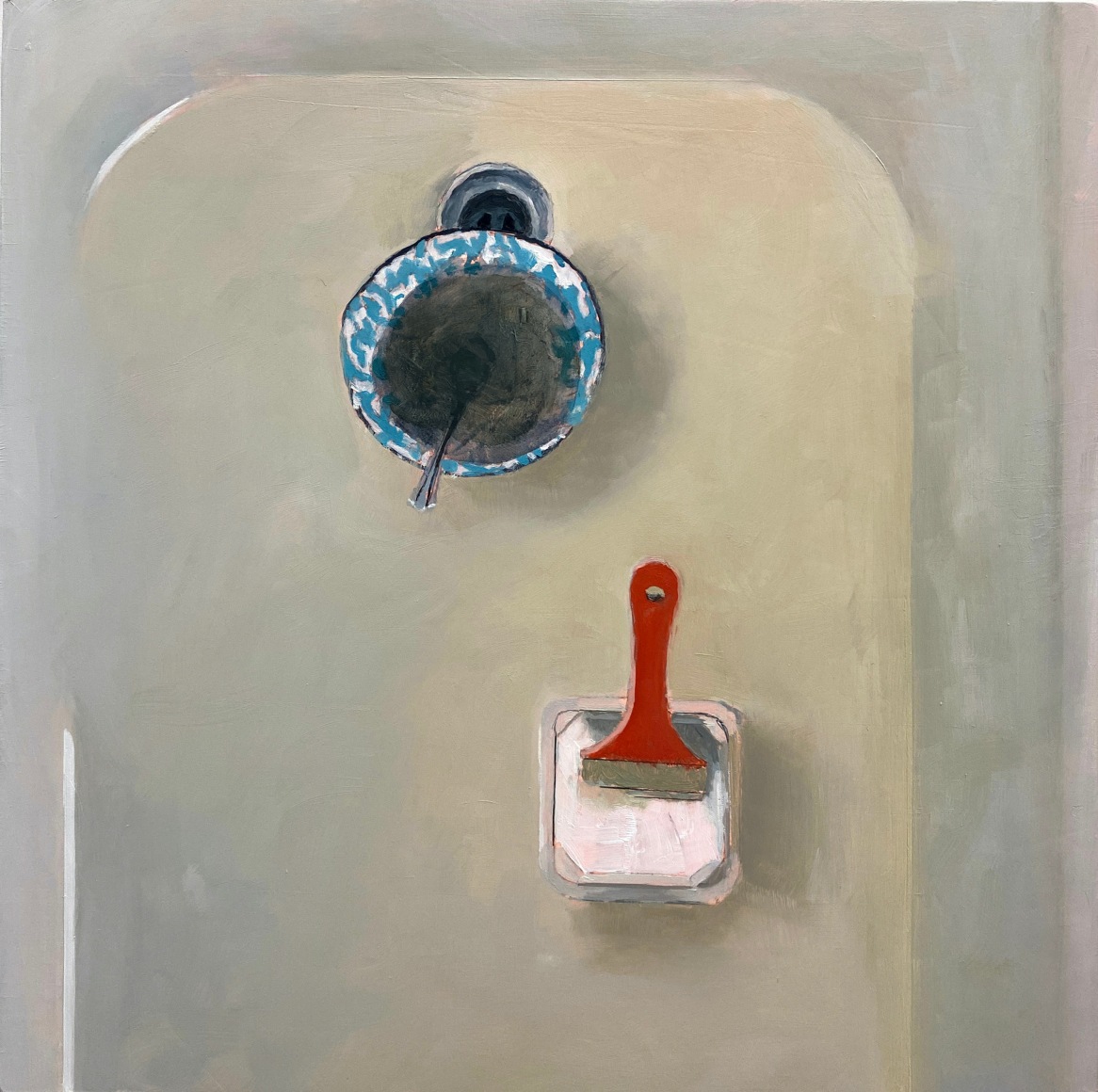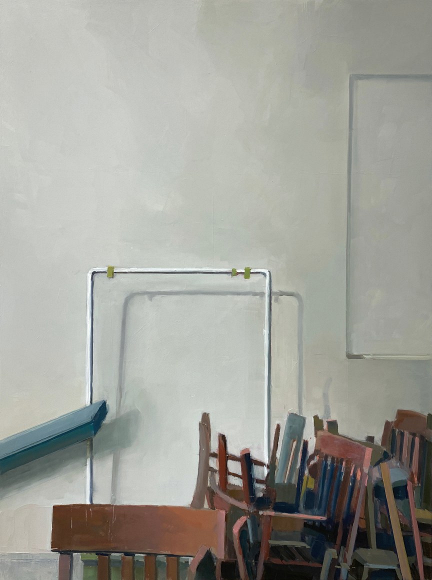 Jenny Brillhart is interested in the unexpected and often overlooked—places and materials plucked from everyday life that arrest her attention. Placed in three-dimensional arrangements in the studio or photographed and assembled in collages, the common and quotidian become subjects for her spare, elegant compositions. Rendered in mostly muted tones, with considered notes of strong color, there is an atmosphere of stillness, of quietude in her paintings. Light and shadows play a dominant role. The influence of Shaker design and craftsmanship runs deep, as do the Precisionist paintings of Charles Scheeler. Shape, space, and gravity are defined by her masterly mark-making.