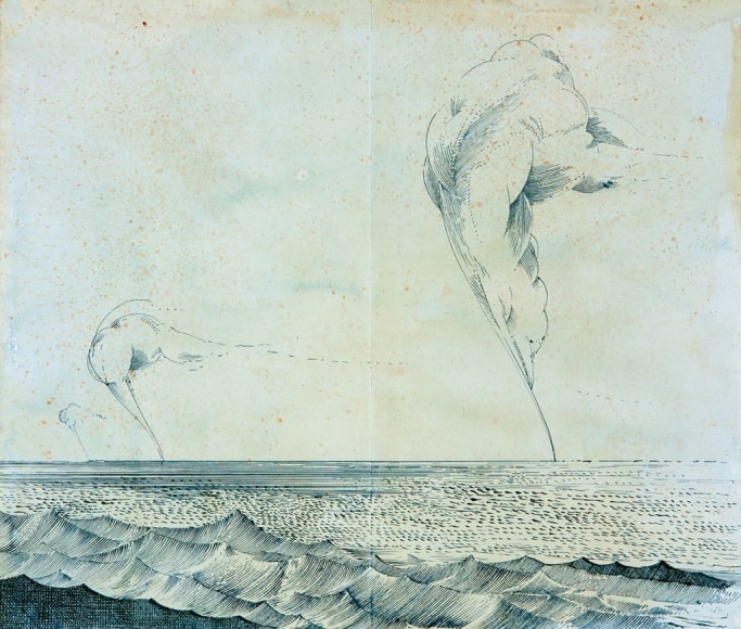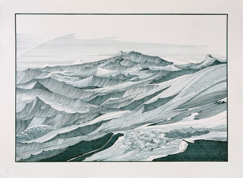 Kelley first registered warp as a subject during a stay on Monhegan, a favorite haunt since his first visit there as a teenager. Over the years the remote island has inspired a range of work, including a stunning group of sepia ink drawings of Pulpit Rock. The imposing outcrop is recreated with meticulous crosshatching and other marks as if by an architect infatuated with rock.