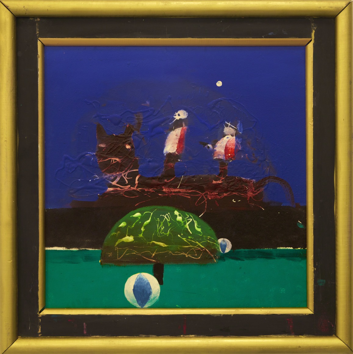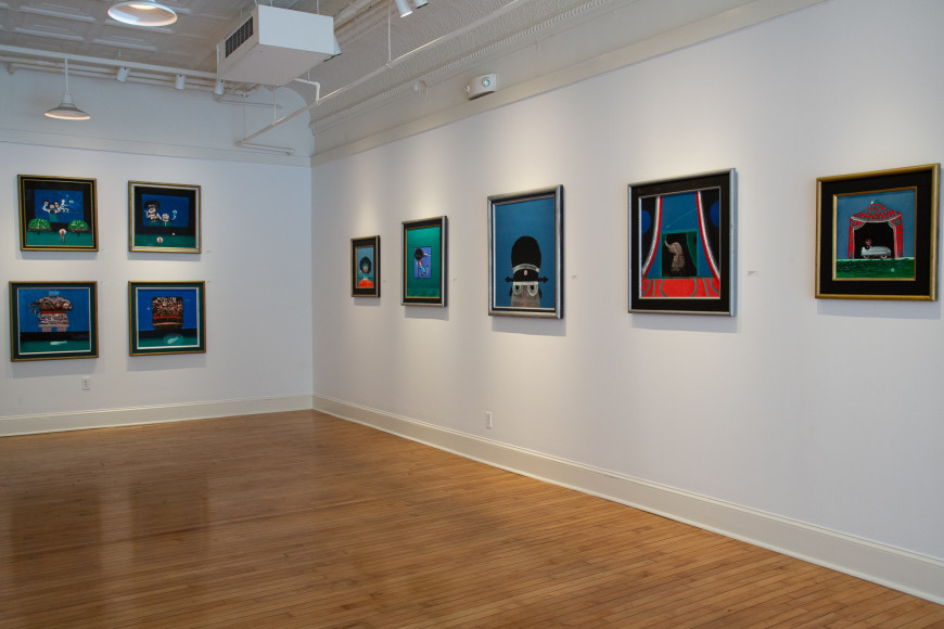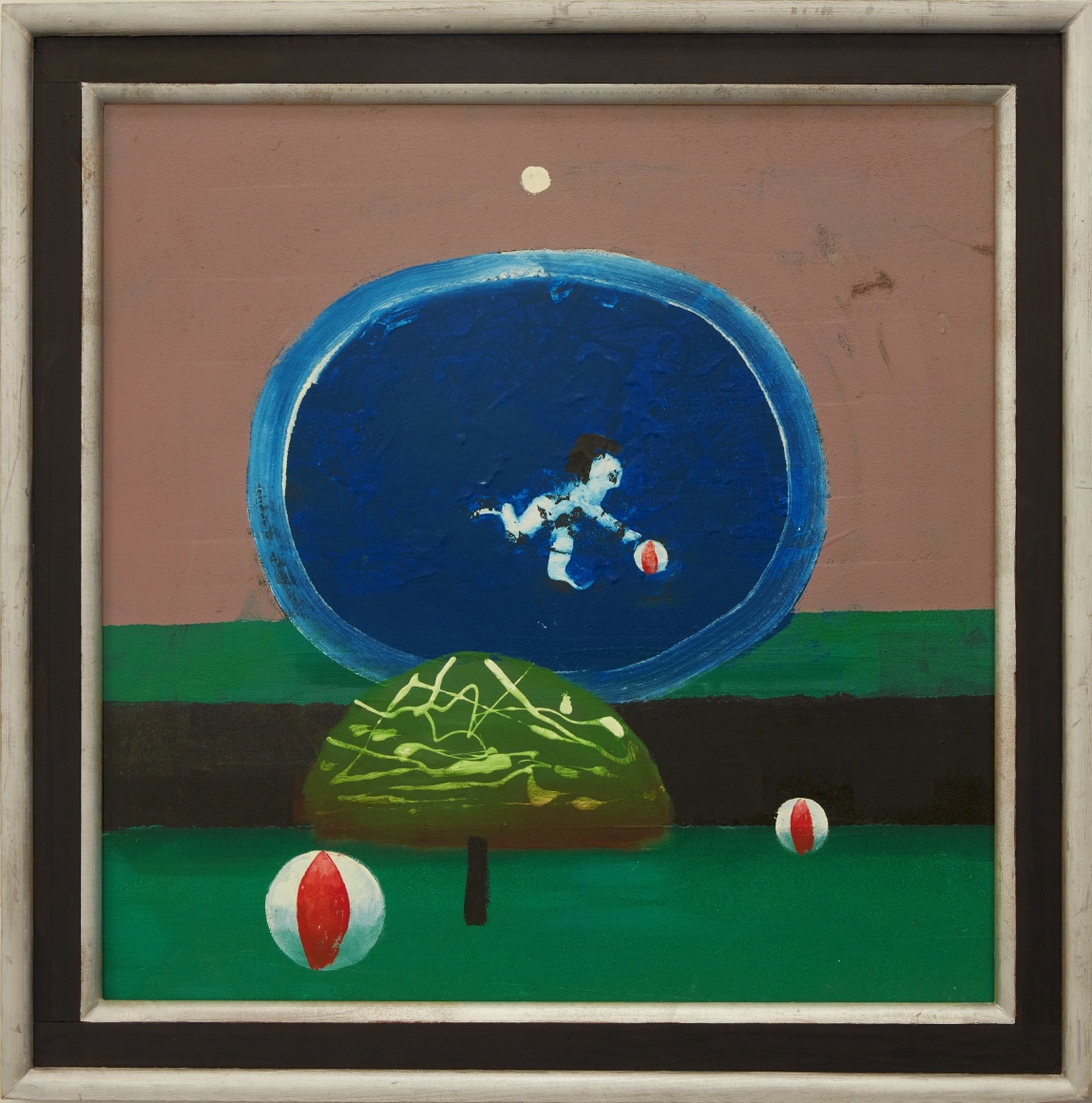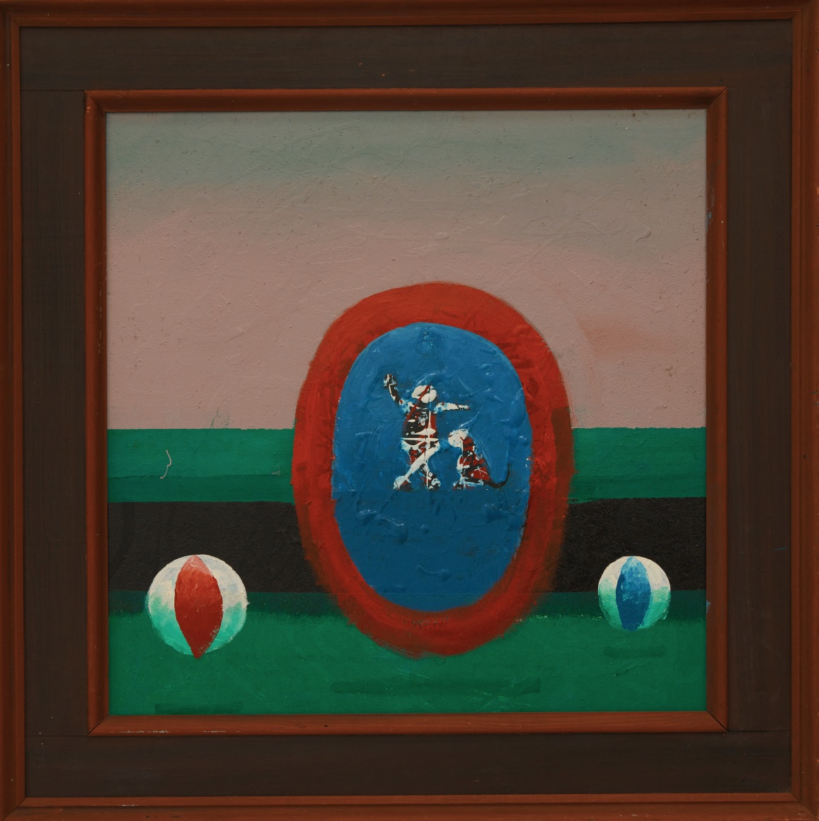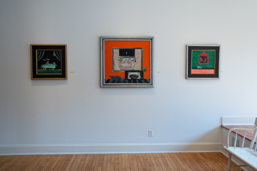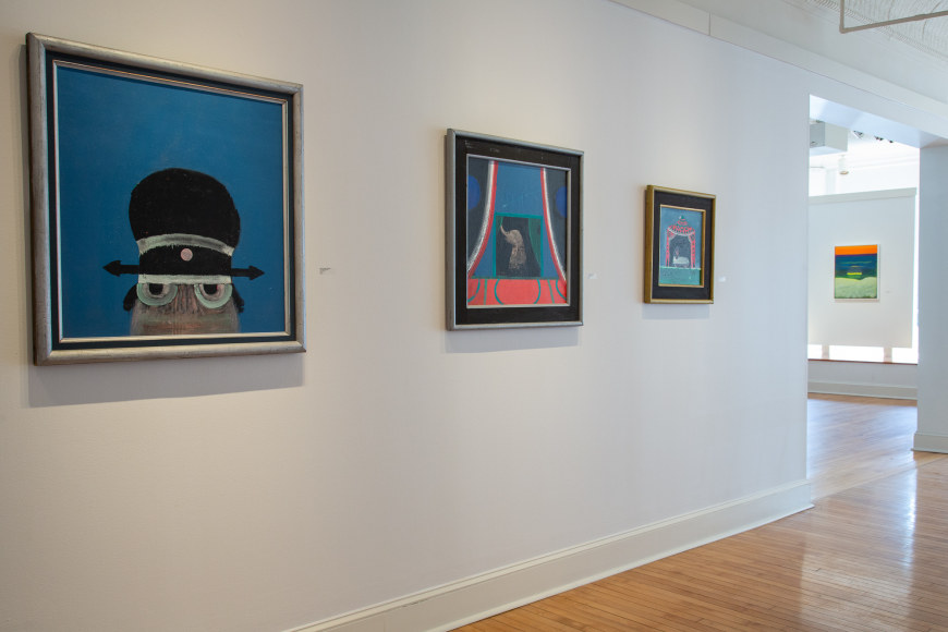 Robert Hamilton (1917‑2004) graduated from the Rhode Island School of Design in 1939. During World War II, he was a captain and P47 bomber pilot, flying one hundred missions and earning a Distinguished Flying Cross. Following the war, he returned to RISD to teach painting and drawing for thirty-four years. Artists Yvonne Jacquette, George Lloyd, David Estey, and Eric Hopkins are among his many students. Upon retiring in 1981, he moved full-time to Port Clyde, Maine, where he devoted the rest of his life to painting. A prolific artist, Hamilton produced over six hundred works, treating the image as a stage for depicting fantastical dreams, and invented narratives that brim with humor, pathos, and an unquenchable zest for life. His love of jazz—his son is the noted jazz saxophonist Scott Hamilton—is reflected in the syncopation of his colors and his invented imagery. “I knew my paintings had to be improvised, spontaneous, made up out of whole cloth, one thing leading to another, accidental, a series of metamorphoses, surprised arrivals, ” he wrote. His friend and neighbor, Andrew Wyeth, called Hamilton “a real painter.”