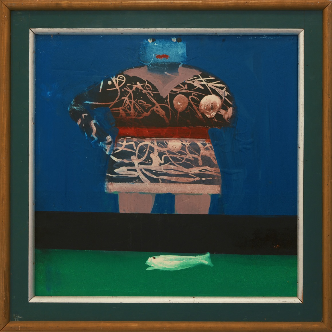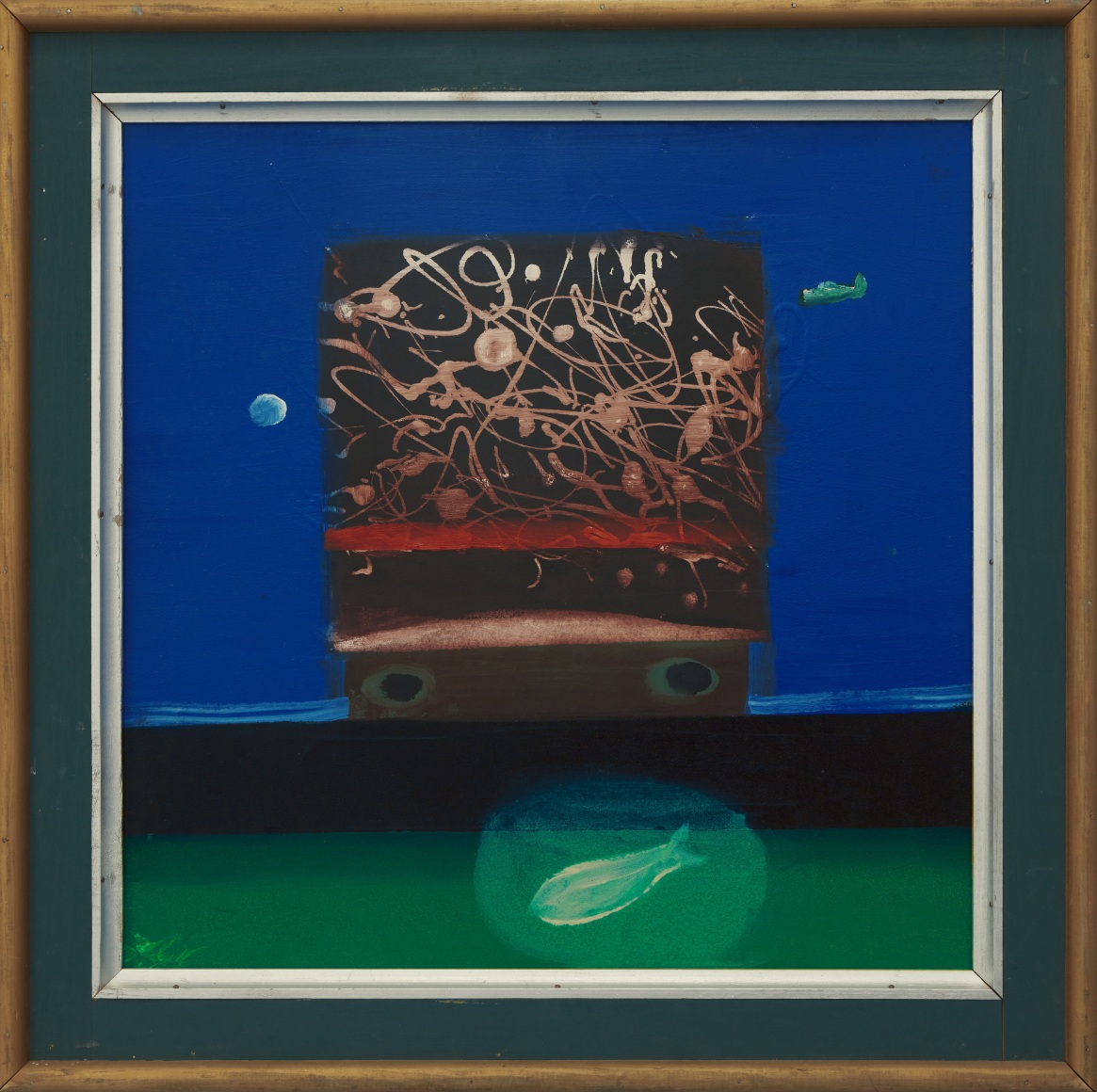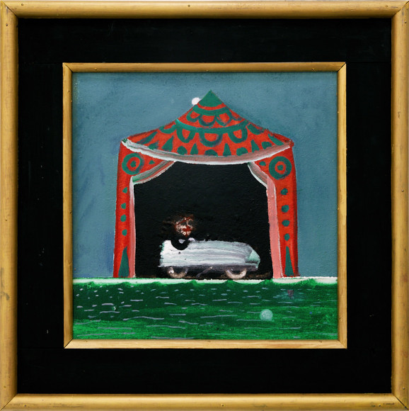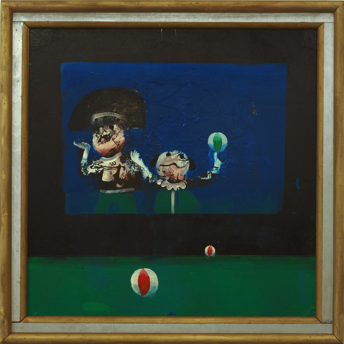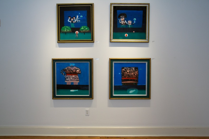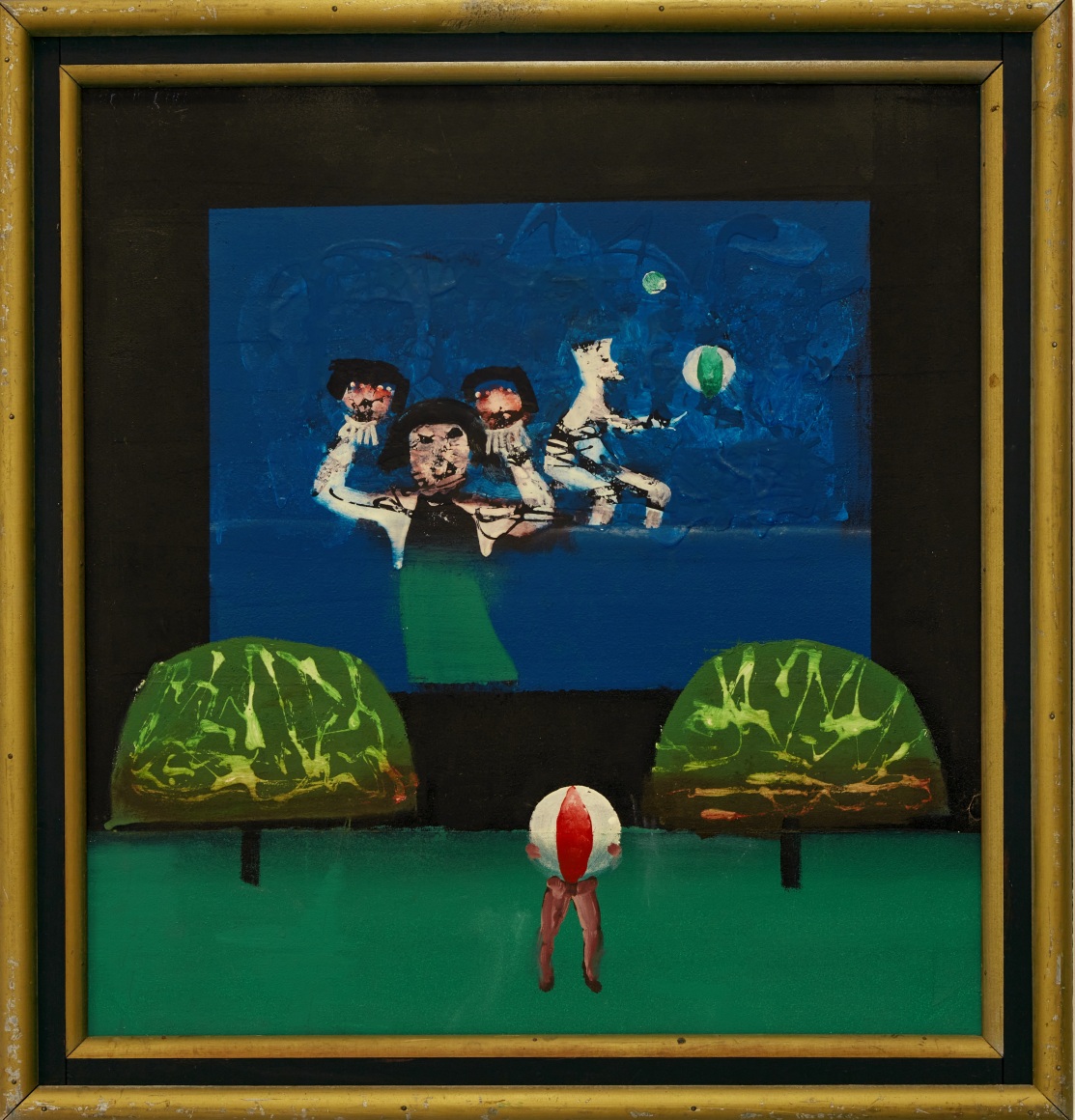Robert Hamilton (1917‑2004) graduated from the Rhode Island School of Design in 1939. During World War II, he was a captain and P47 bomber pilot, flying one hundred missions and earning a Distinguished Flying Cross. Following the war, he returned to RISD to teach painting and drawing for thirty-four years. Artists Yvonne Jacquette, George Lloyd, David Estey, and Eric Hopkins are among his many students. Upon retiring in 1981, he moved full-time to Port Clyde, Maine, where he devoted the rest of his life to painting. A prolific artist, Hamilton produced over six hundred works, treating the image as a stage for depicting fantastical dreams, and invented narratives that brim with humor, pathos, and an unquenchable zest for life. His love of jazz—his son is the noted jazz saxophonist Scott Hamilton—is reflected in the syncopation of his colors and his invented imagery. “I knew my paintings had to be improvised, spontaneous, made up out of whole cloth, one thing leading to another, accidental, a series of metamorphoses, surprised arrivals, ” he wrote. His friend and neighbor, Andrew Wyeth, called Hamilton “a real painter.”